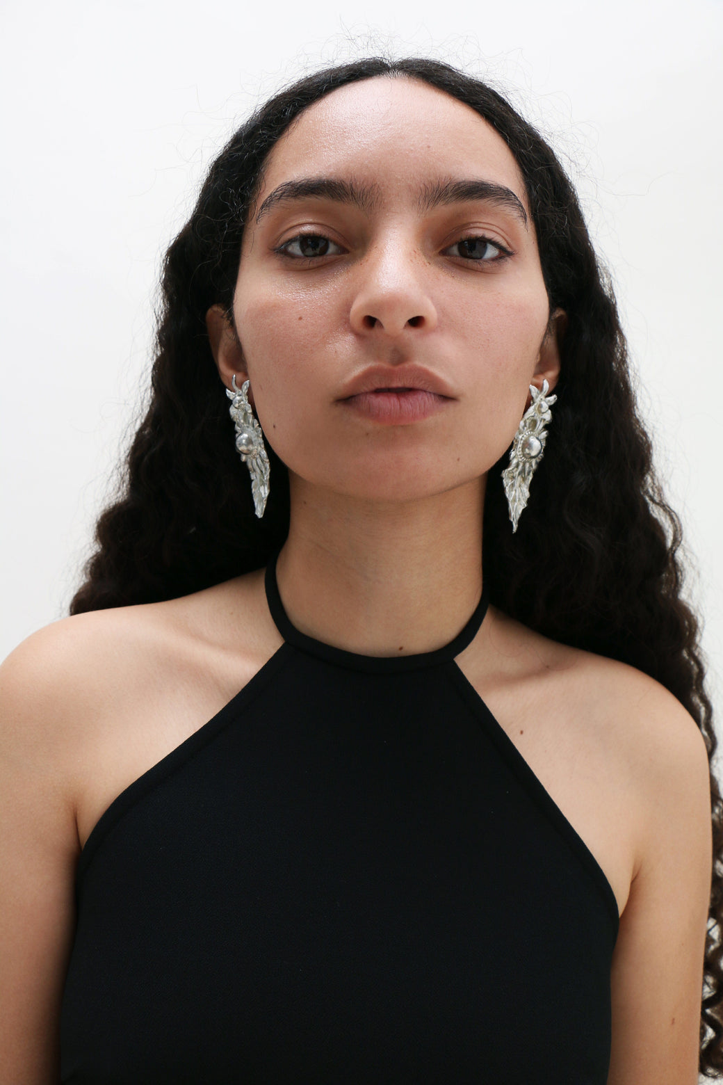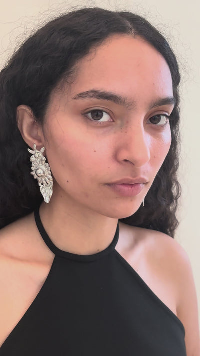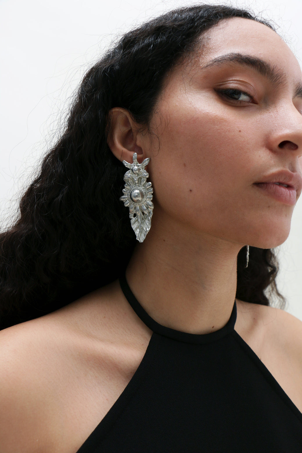 The Bouquet Earrings, flower shaped metal statement earrings. Featuring stacked flowers, petals and leaves. Up-cycled from pewter cutlery; one of one. Refer to the still life imagery for the exact style that will ship, model imagery is for scale of this piece.