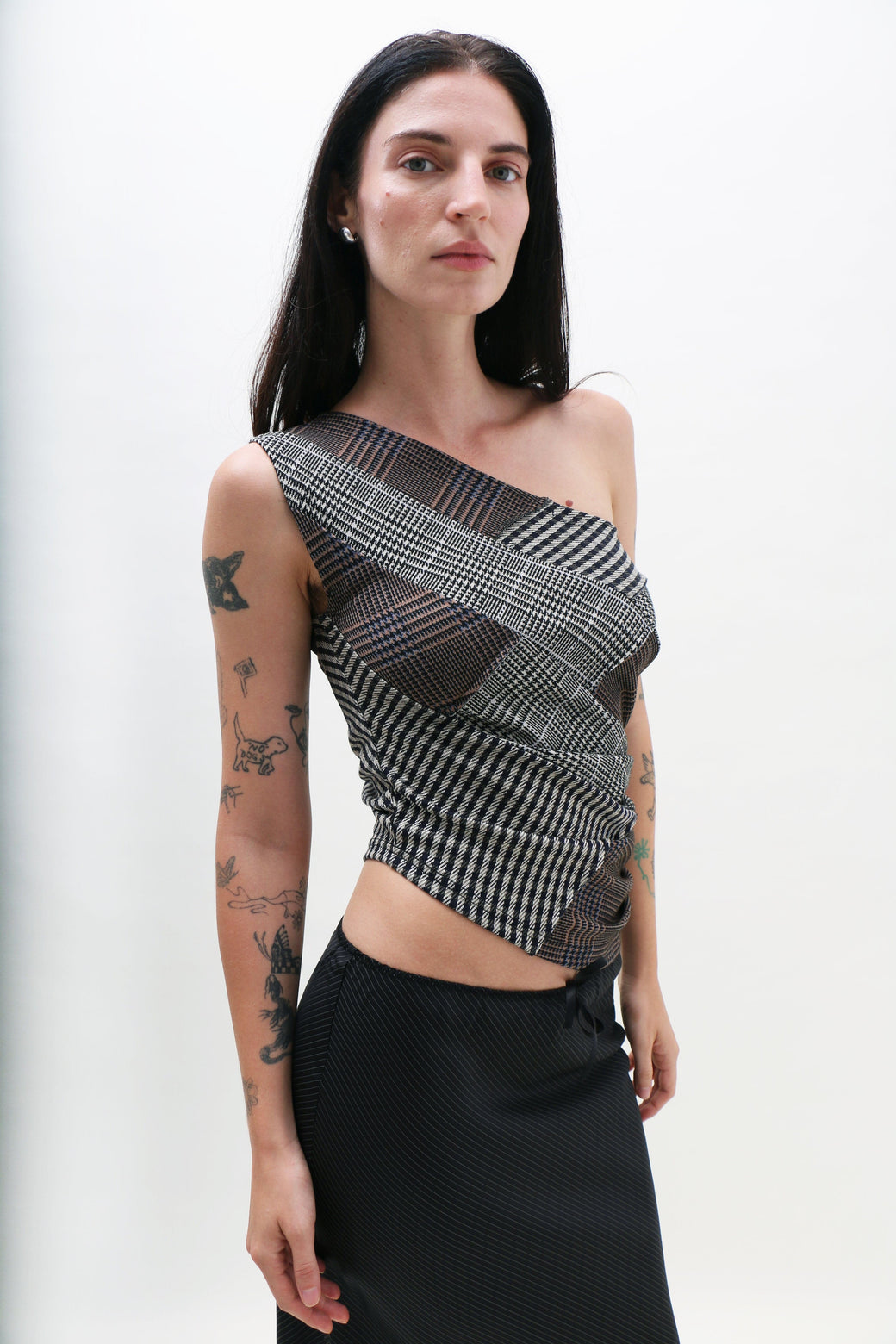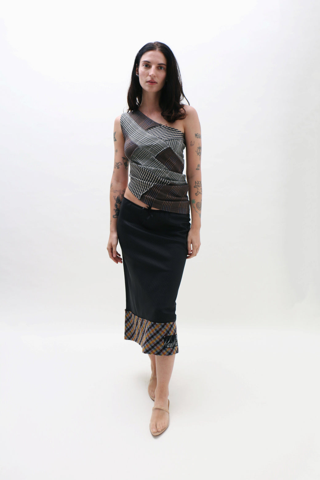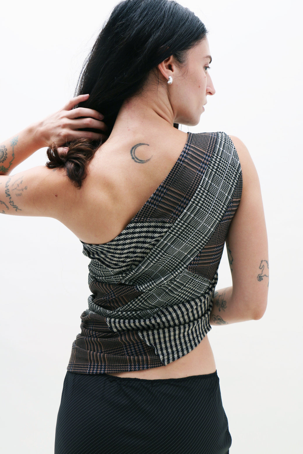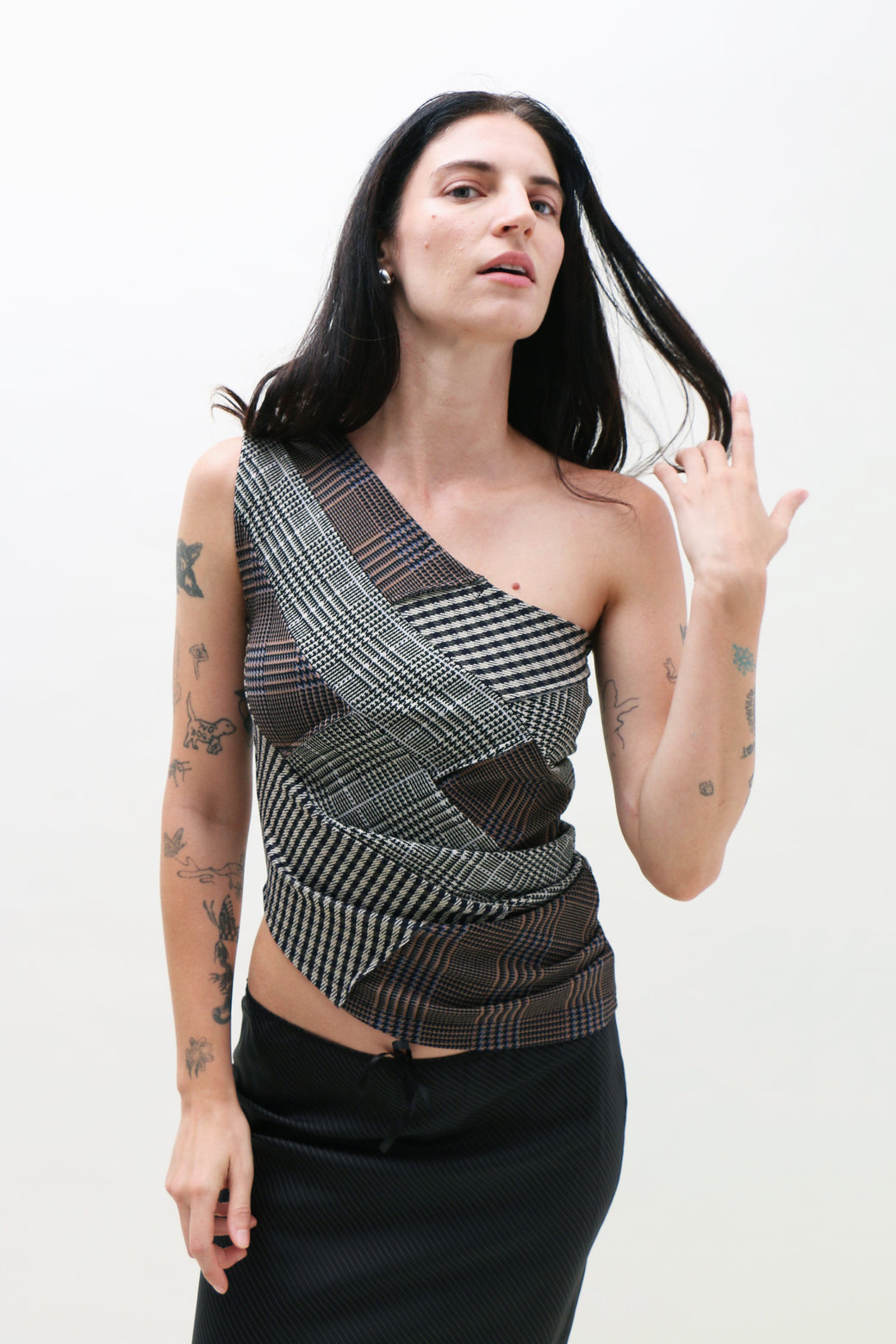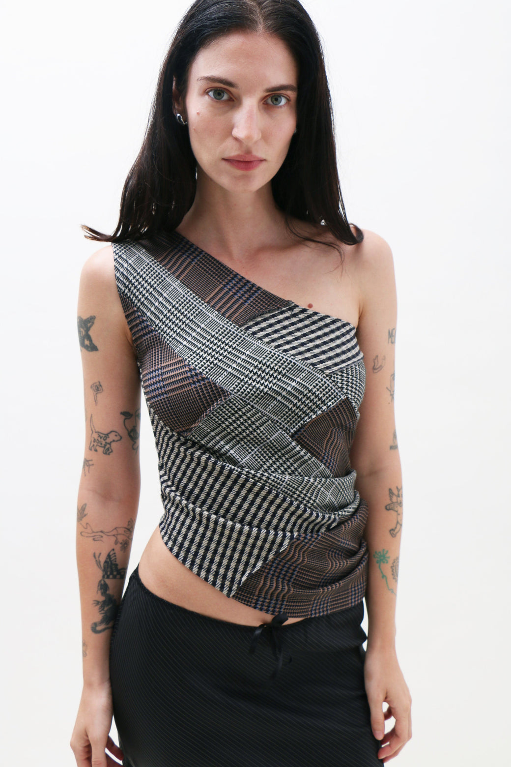 One-shoulder jersey top in a patchwork of plaids, made from upcycled deadstock fabrics. Cut to sit off the shoulder, balancing structure and ease, with a soft drape along the side.