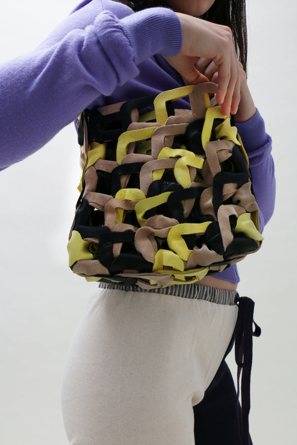 A Maimoun Fall 2025 exclusive, the Dart Links Tote features upcycled black and yellow leather with beige suede links, interlocked in a subtle check-like pattern. Designed to be worn as a shoulder bag.