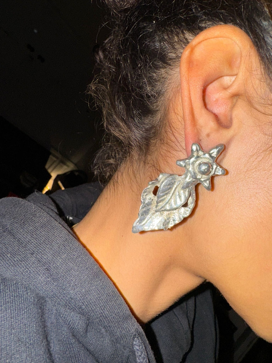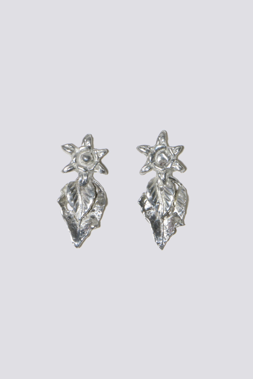 Autumn-inspired earrings featuring a small star-shaped flower with a central ball, layered leaves above, and a gentle swinging movement.