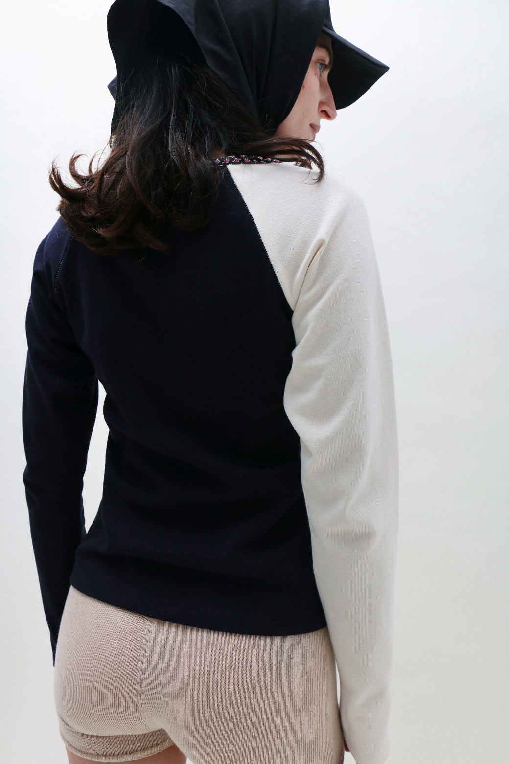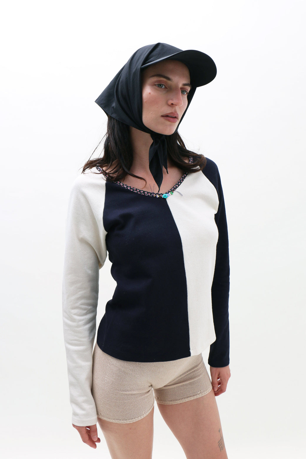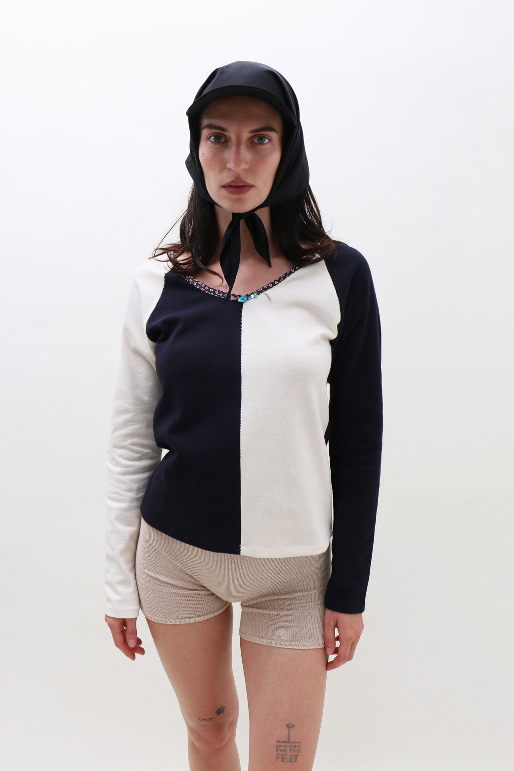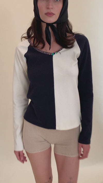 Rib-knit cotton two-tone v-neck long sleeve top, accented with floral-printed fabric hem along the collar and subtle sequin detailing.