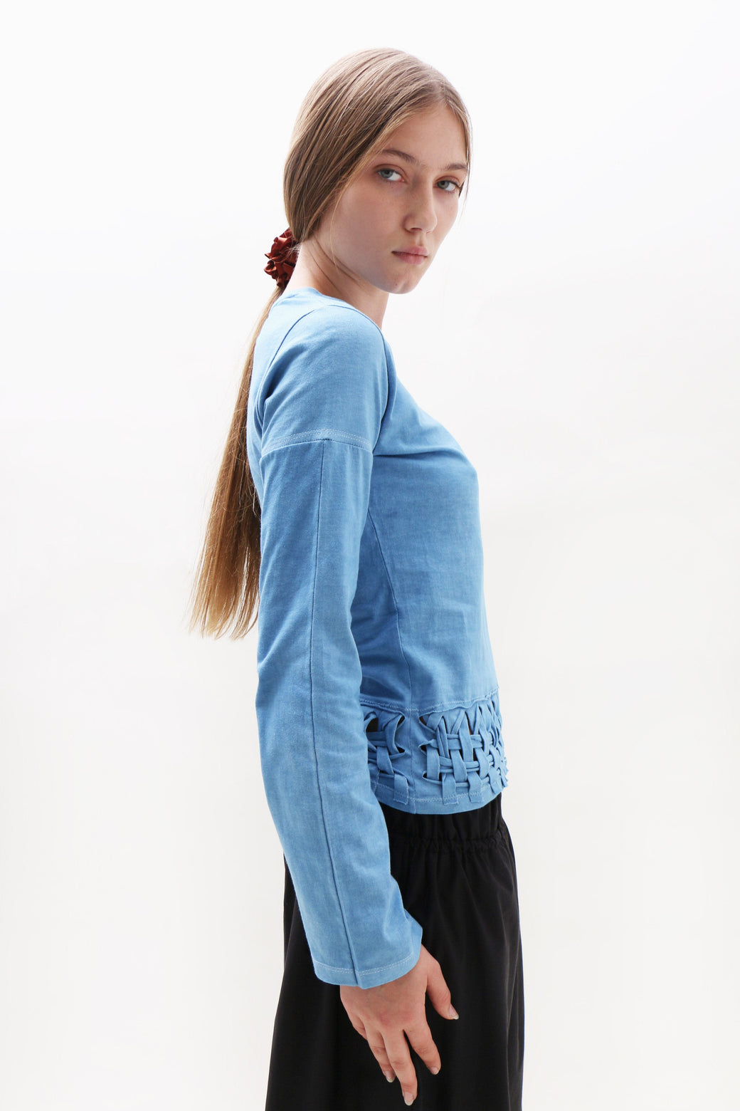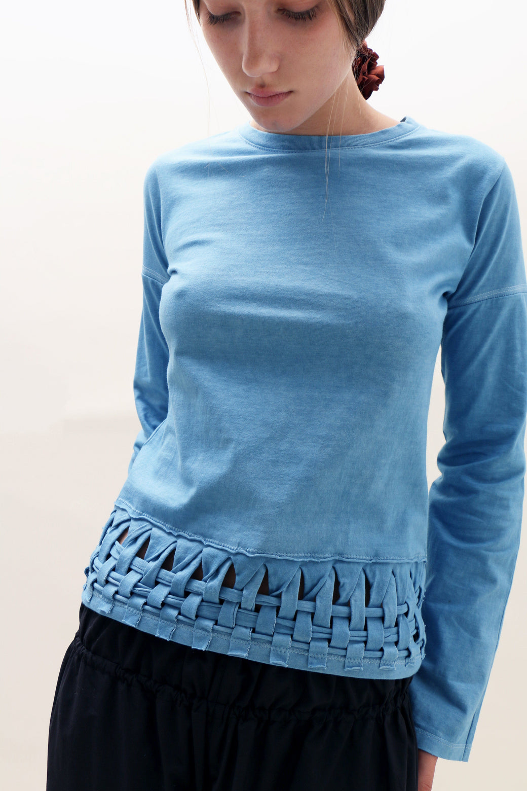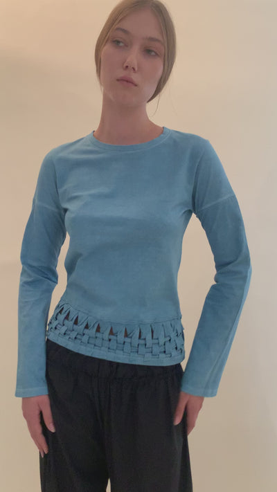 Slim fit long-sleeve t-shirt featuring an intricate woven pattern along the front and back, creating the illusion of interlaced garments. Hand-woven and dyed in natural indigo.