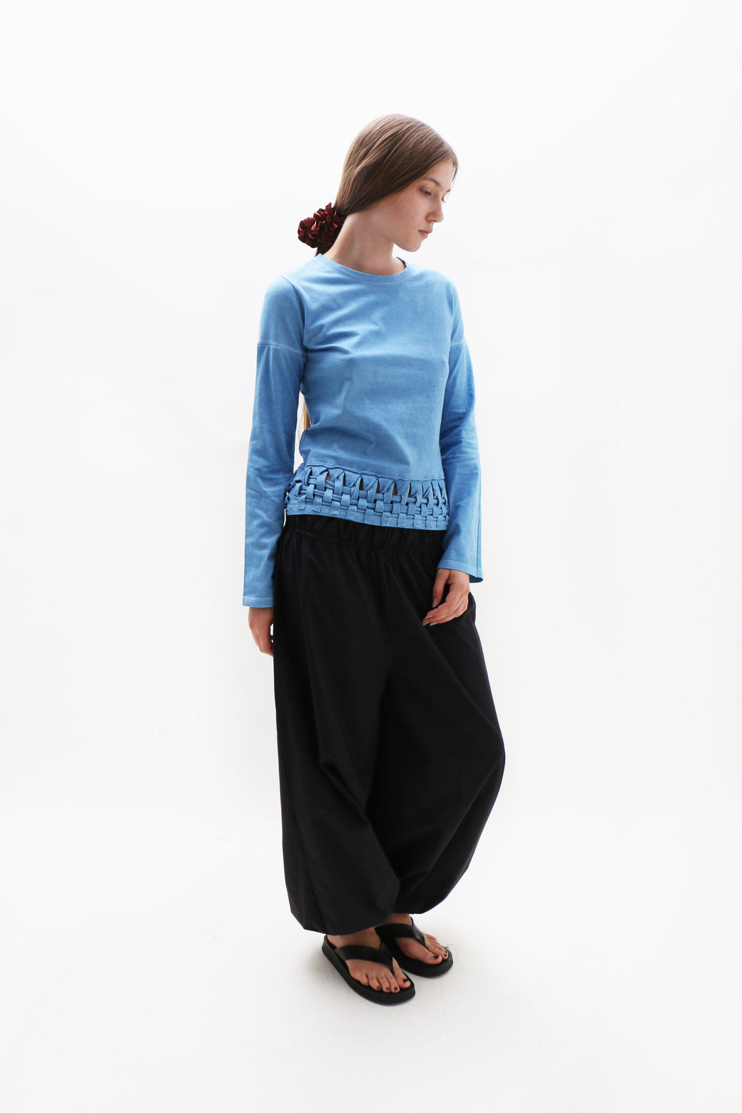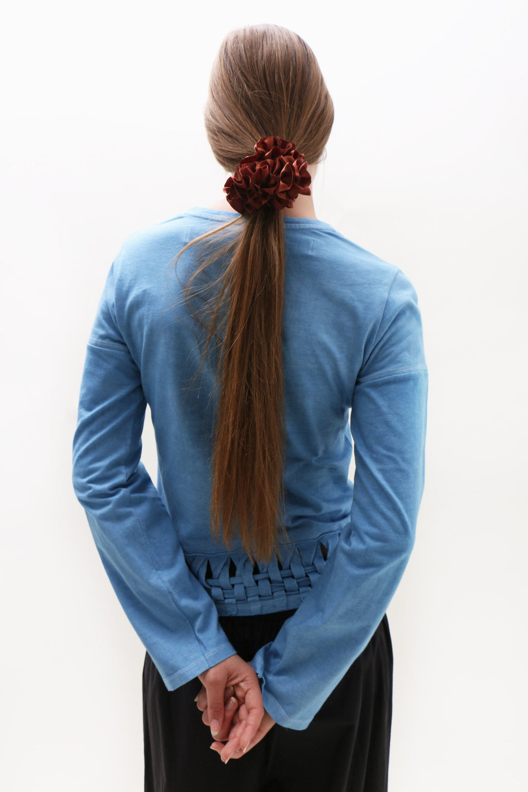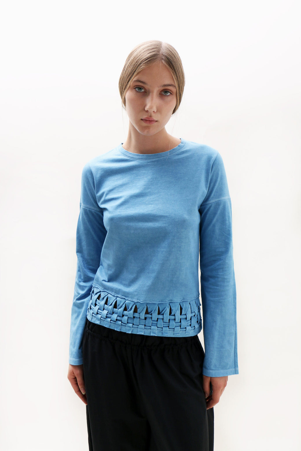 Slim fit long-sleeve t-shirt featuring an intricate woven pattern along the front and back, creating the illusion of interlaced garments. Hand-woven and dyed in natural indigo.