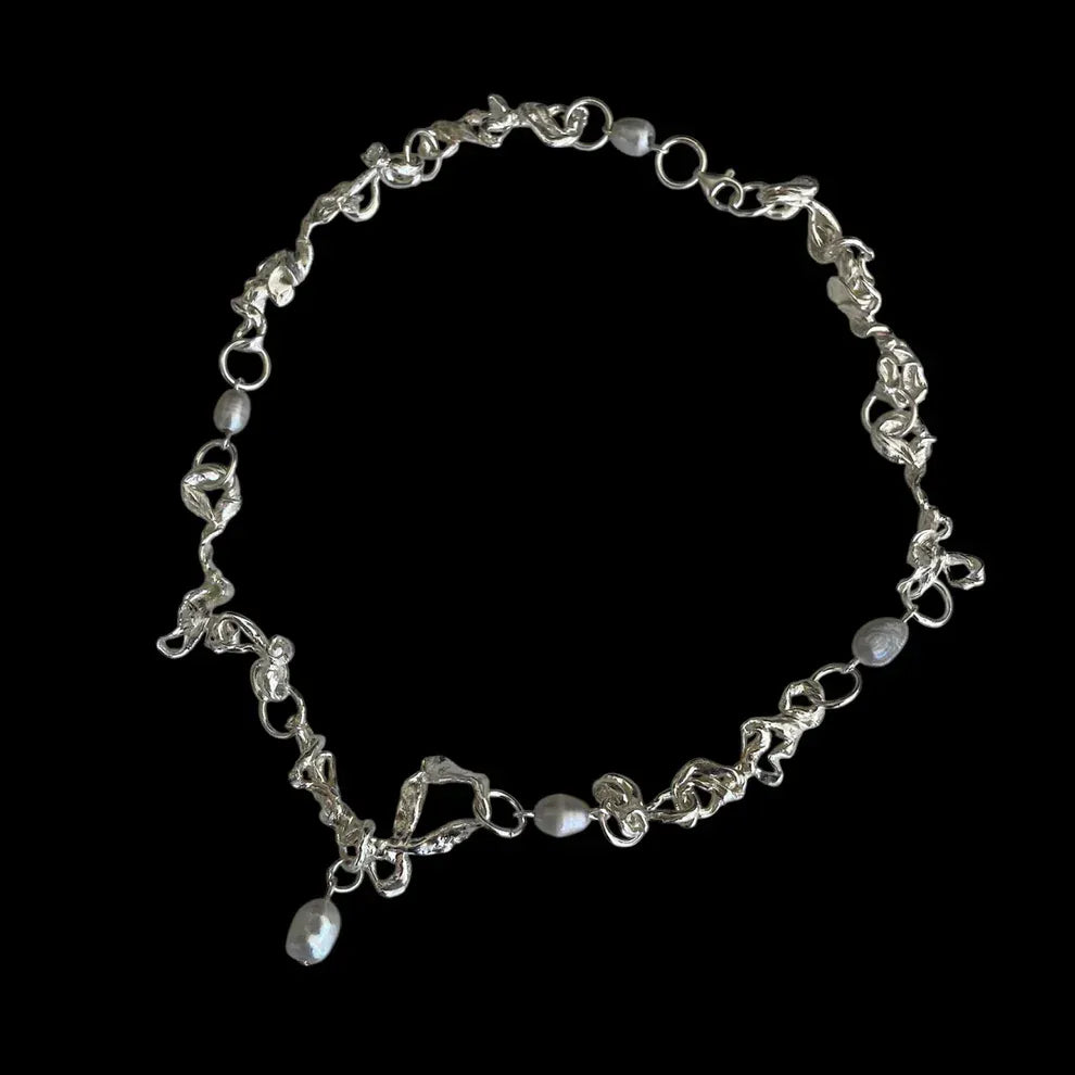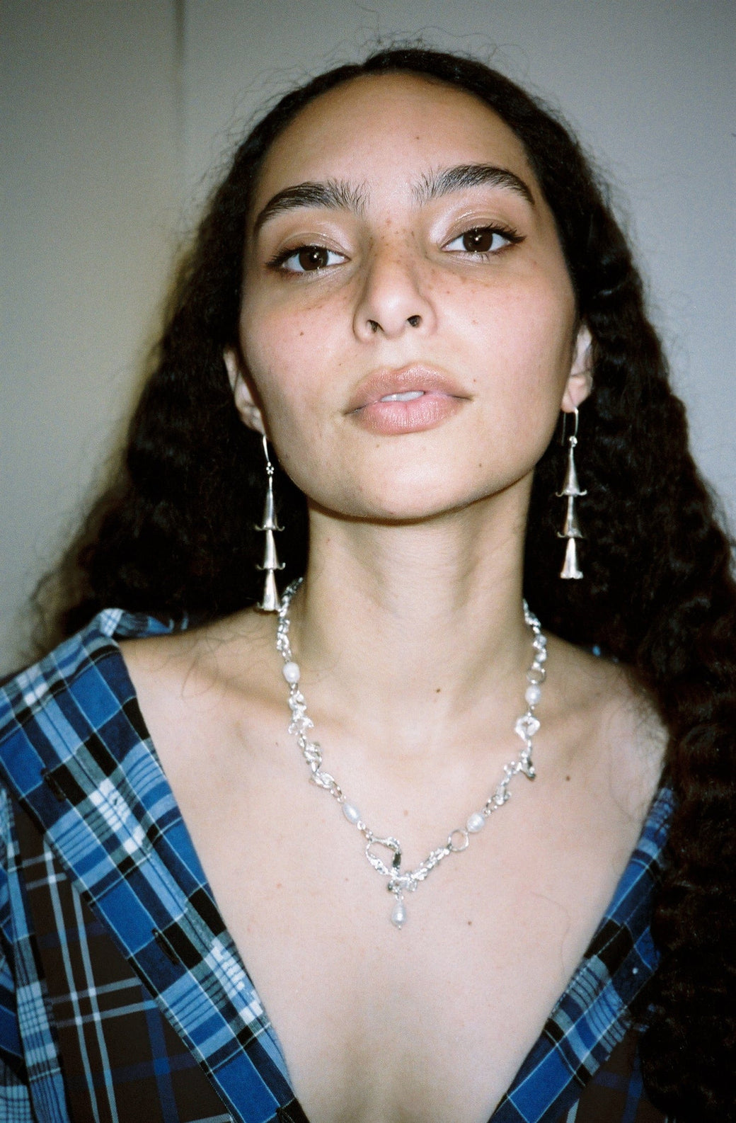 Franki wears the 43cm / 17 inches length. Made from Sterling Silver and Fresh Water Pearls. This piece can be fragile, always keep it inside the box when it’s not worn.