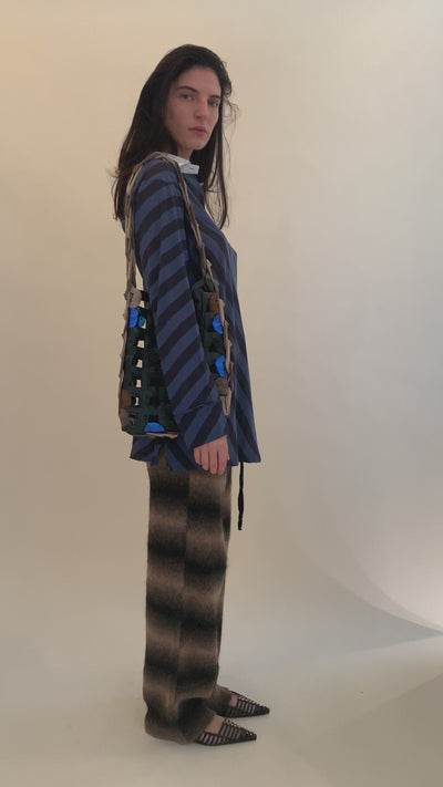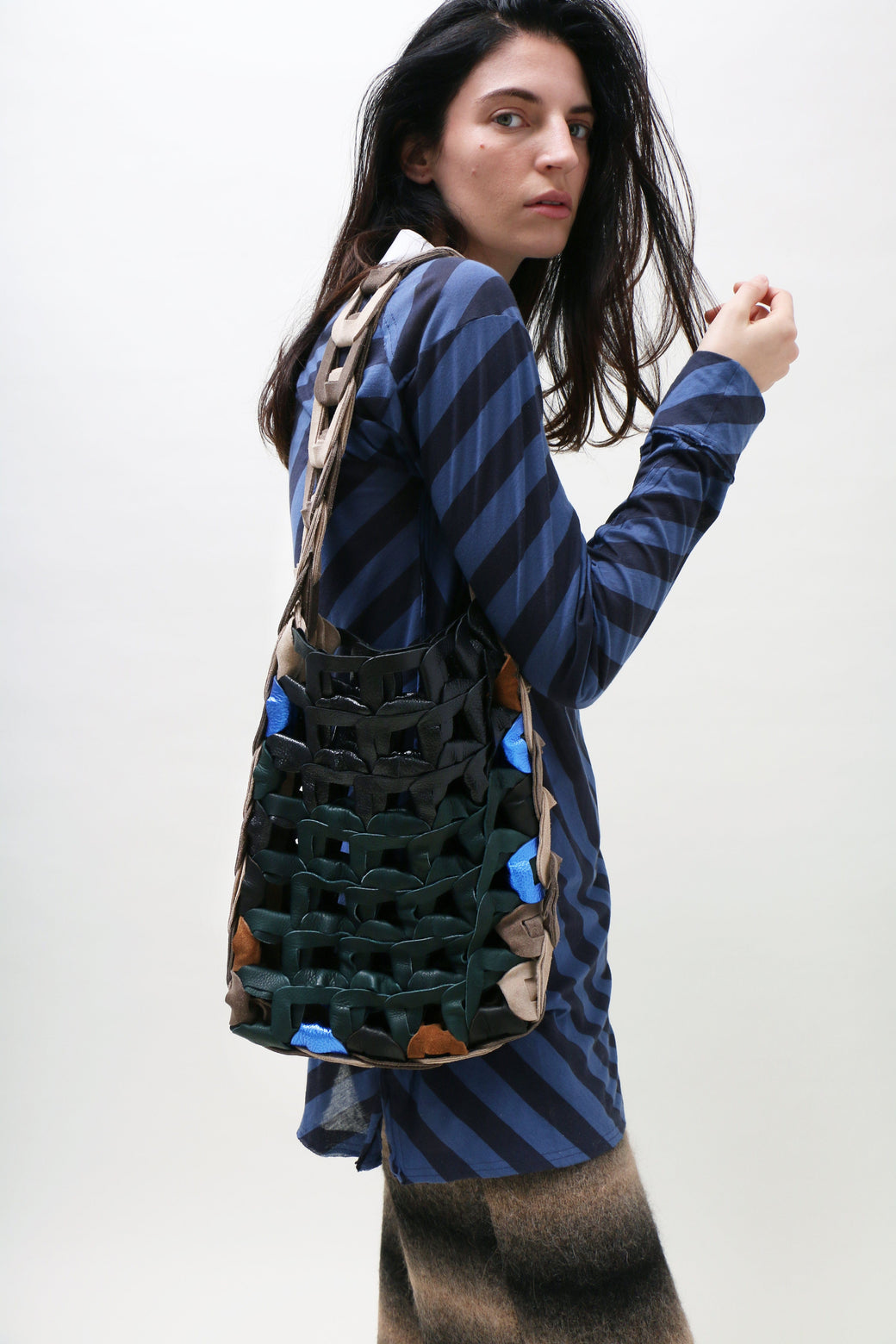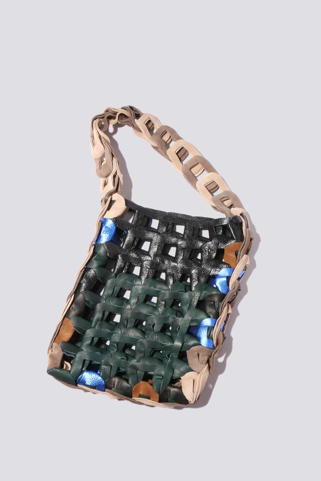 A Maimoun Fall 2025 exclusive, the Loot Medium Links Tote is composed of upcycled interlocked leather links. The top half features black metallic leather, while the base is deep green, accented with shades of beige suede links along the edges. Subtle pops of metallic blue appear throughout the design. Designed to be worn as a shoulder bag.
