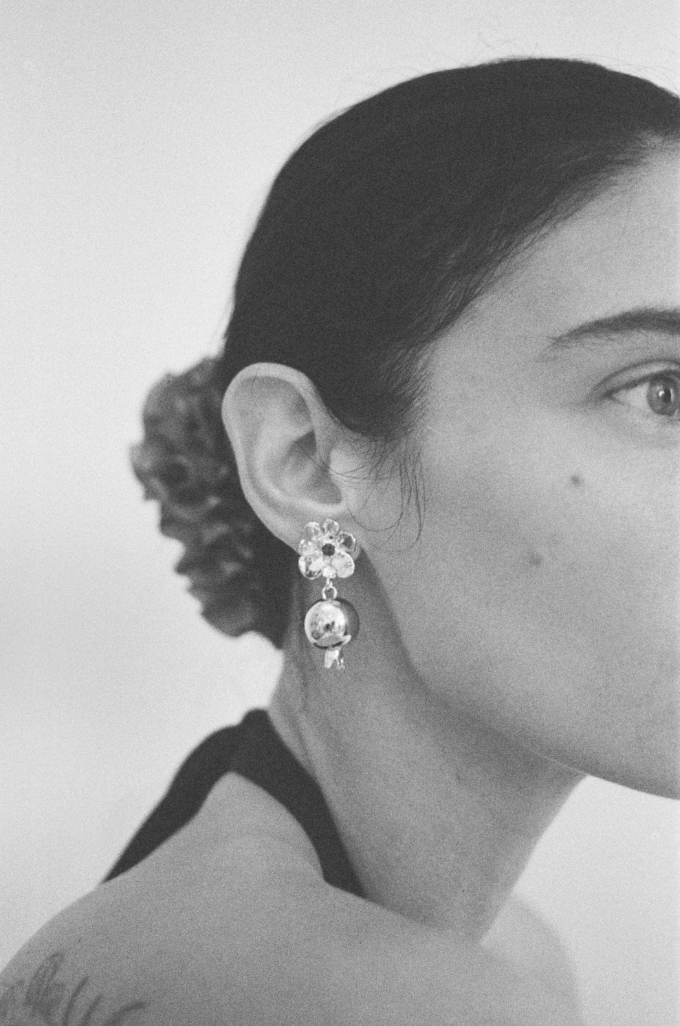 Flower with glass insert and suspended pomegranate motif. 18k gold vermeil with sterling silver ear post.