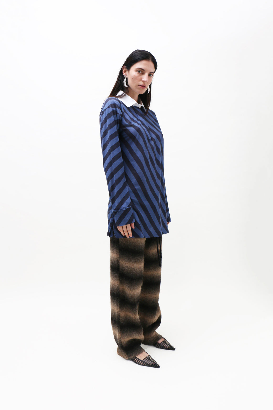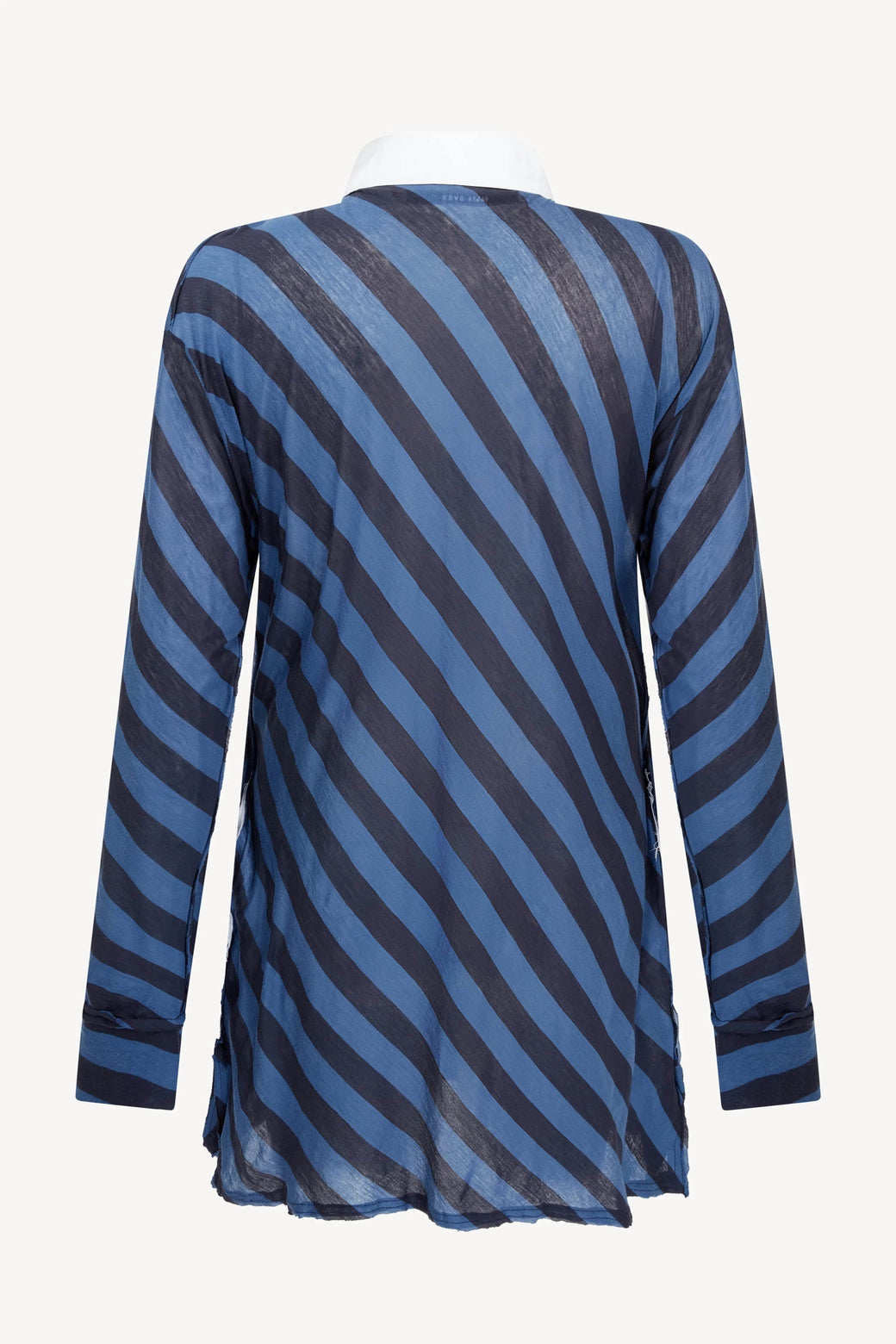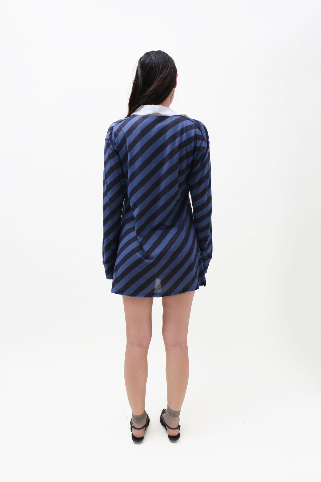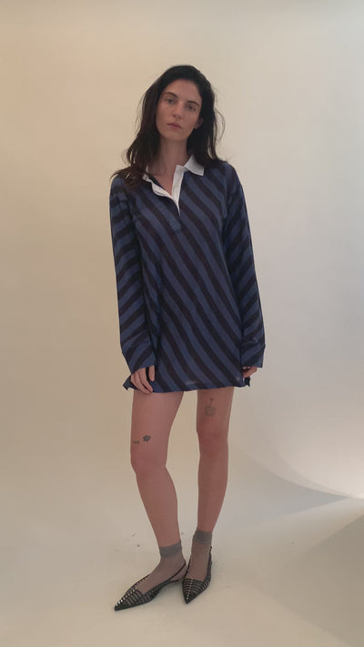Rugby-style shirt with a contrast white poplin collar and placket. Made from ultra-soft cotton, navy and black striped jersey. Wear it as a standalone mini dress or layered as a top.