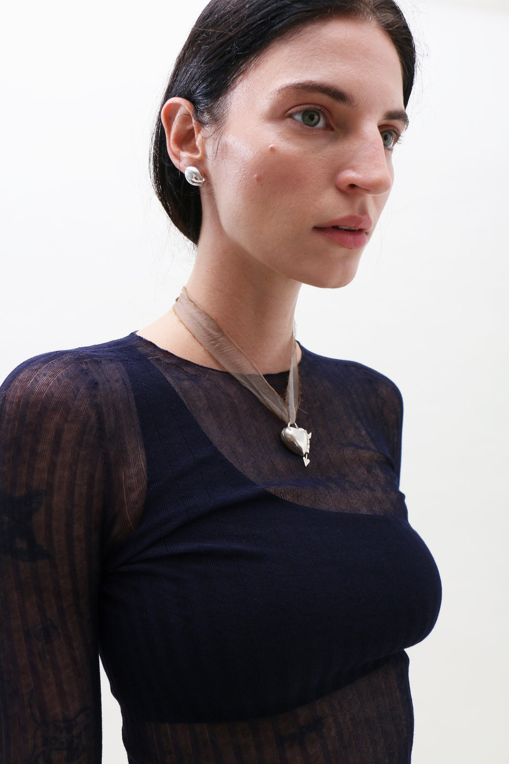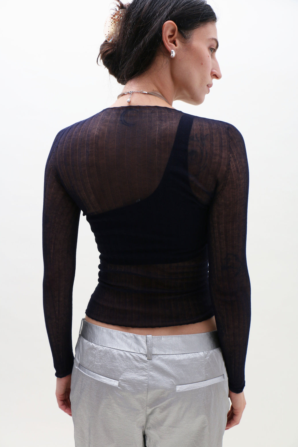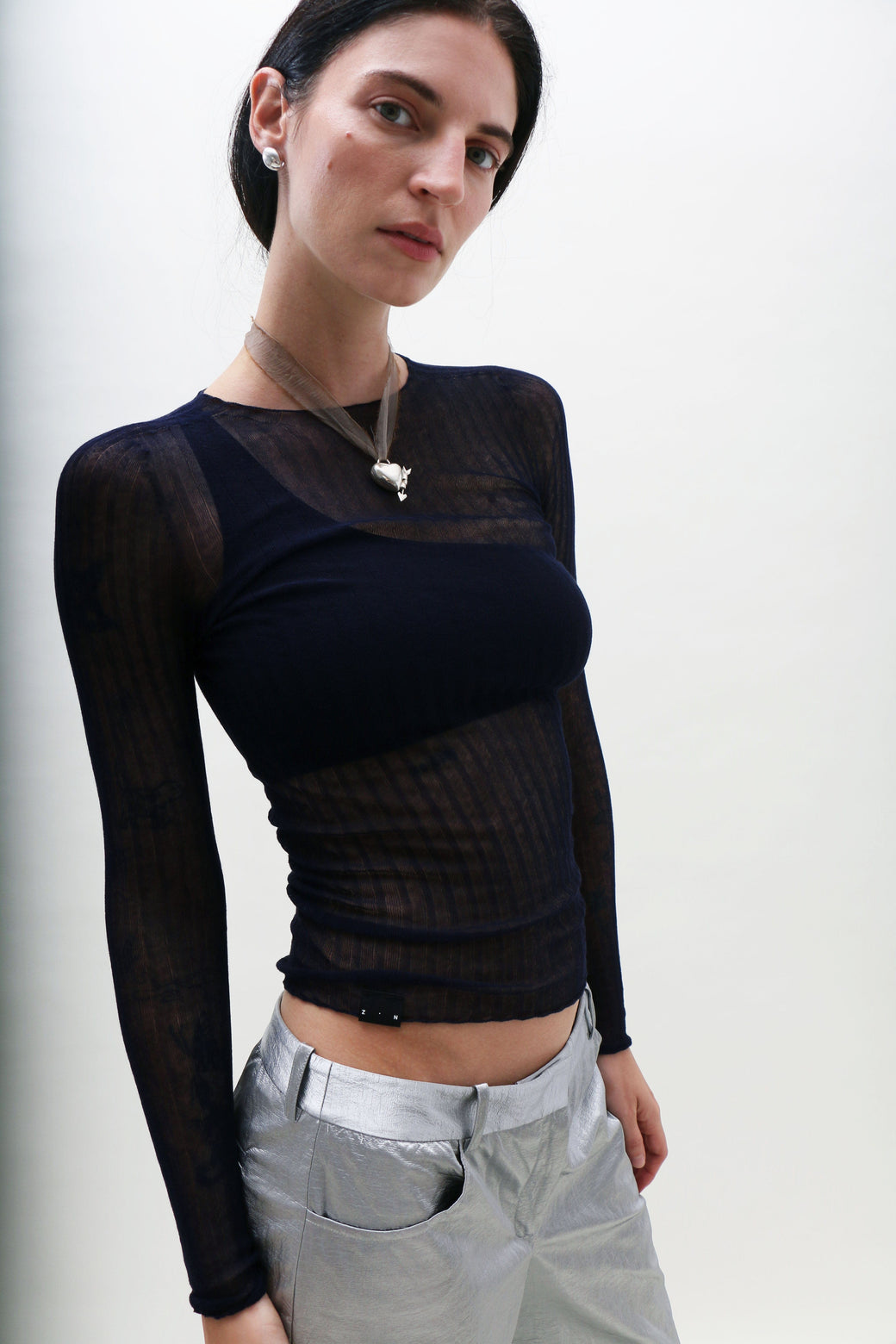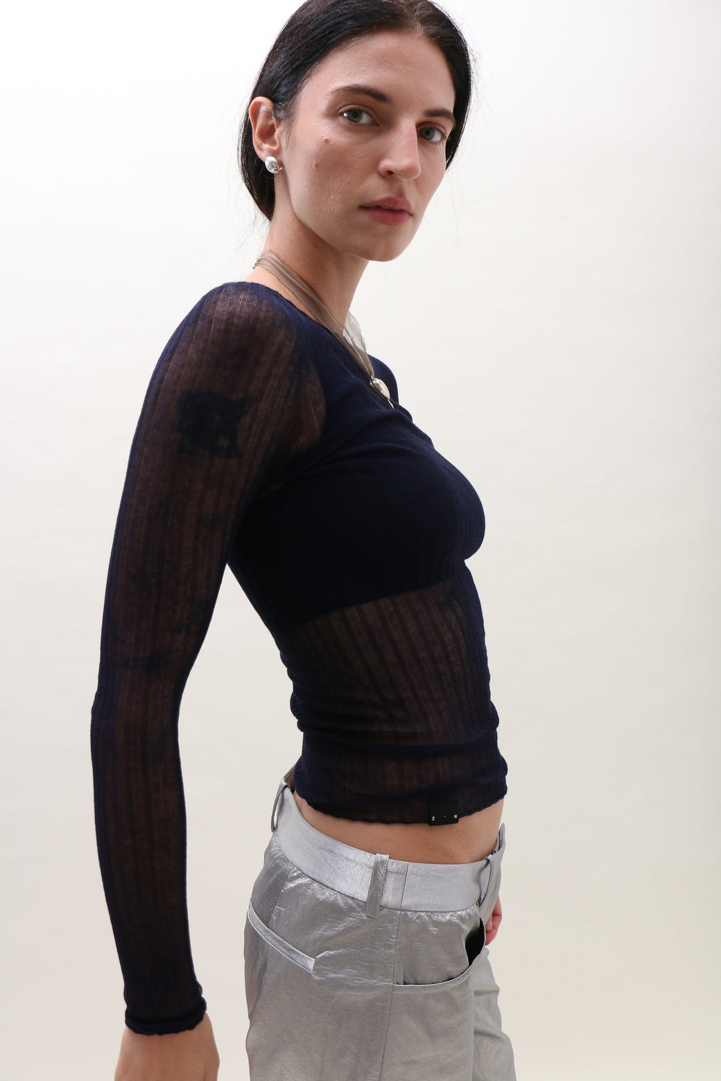 Superfine cotton seamless knit long sleeve in navy tulle. Slight ruffled edge. Lightweight garment that molds to the contours of your body. These semi-sheer ribbed knits can be worn next to skin or layered under/over garments to add another dimension to your wardrobe. Made in New Zealand.