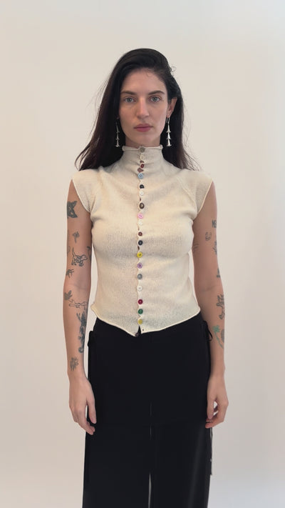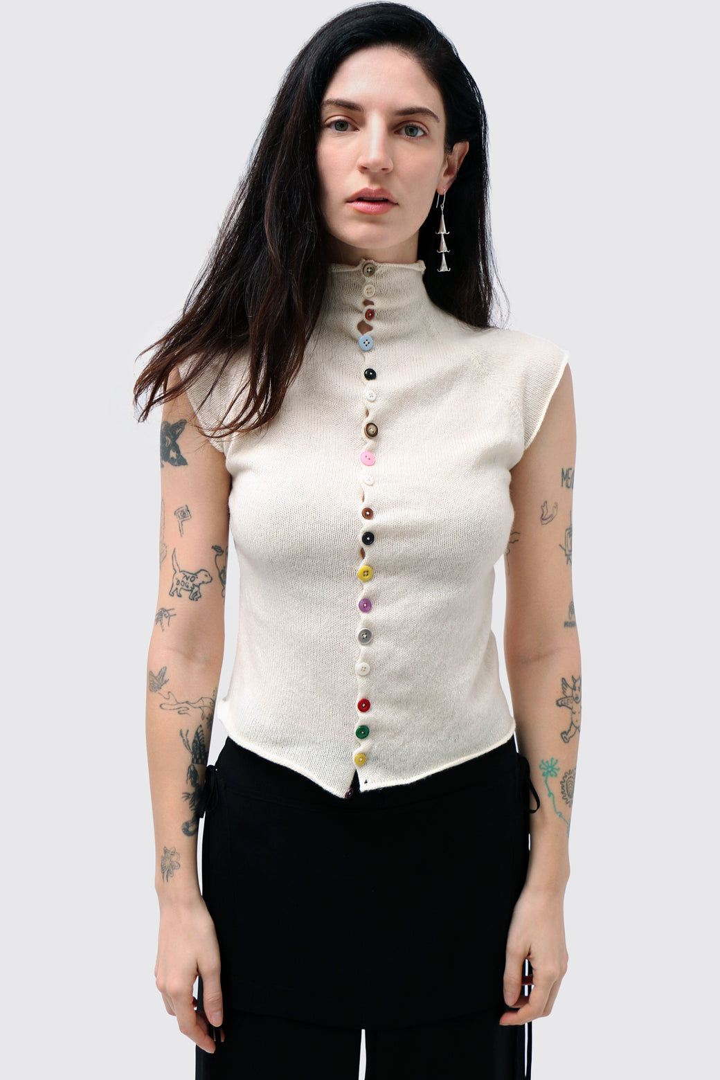Hand-knit raglan button tee in natural cream wool, finished with a mock neck and multicolored vintage-sourced functional buttons along the front. Each piece is unique, with subtle variations from the handmade process.