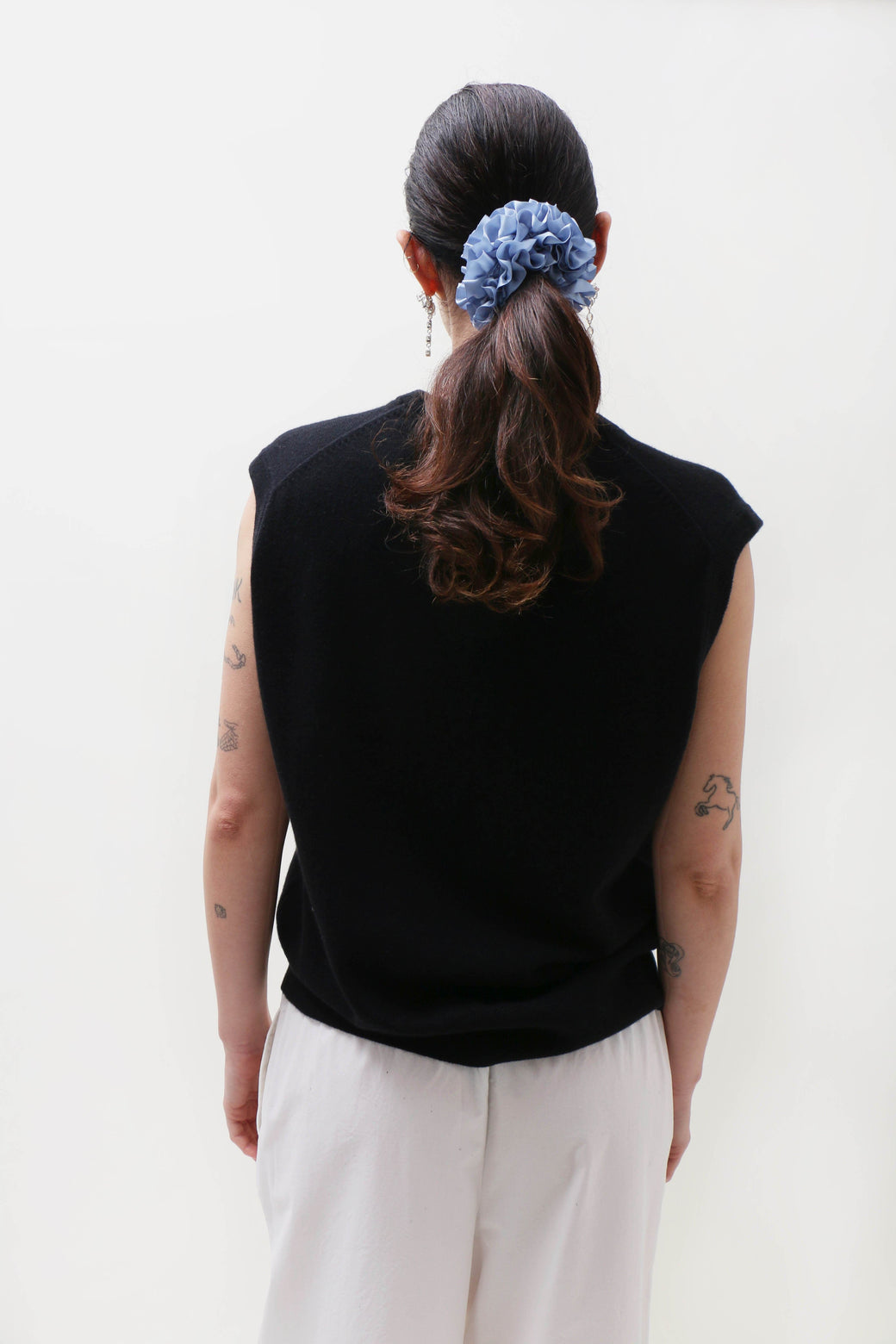 Ilana is 5'8" tall and measures 32” bust, 24” waist, and 36” hips. Fabrication is 88% Cashmere, 10% Nylon, 2% Elastane. All Extreme Cashmere garments are machine washable and easy to maintain. Wash it regularly in a high quality machine on wool program (30°c 600rpm), using wool detergent or baby shampoo and no softener. Put each garment in a separate washing bag or pillow case. do not run a cycle with more than three garments at once. One Size measurements below: Shoulder to Shoulder: 42cm Chest: 54cm Hem Width: 44cm Total Length: 60cm