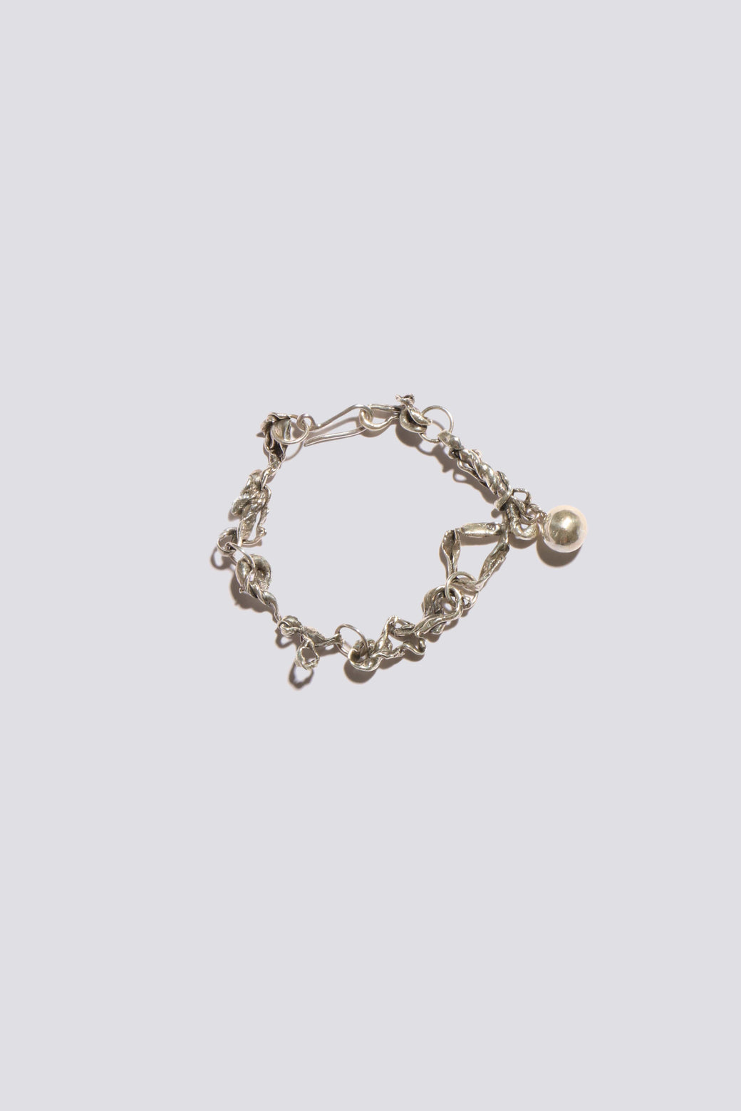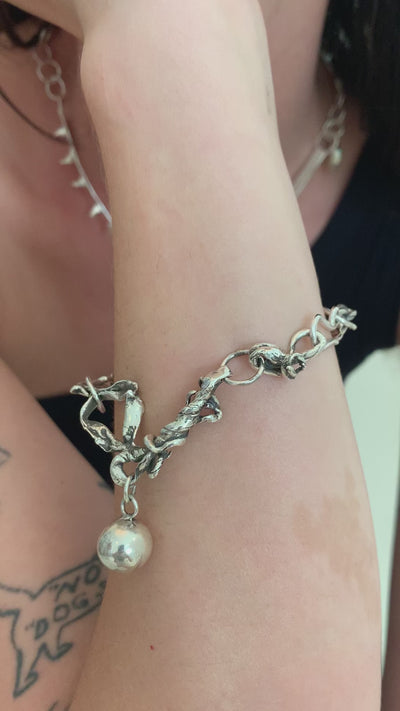 Handcrafted from a unique Japanese wax called mitsuro, a blend of pine resin and beeswax, this bracelet achieves a fluid, almost water-like effect. Cast in recycled sterling silver with a subtle black patina and finished with a delicate silver bell, each element is meticulously soldered for durability.