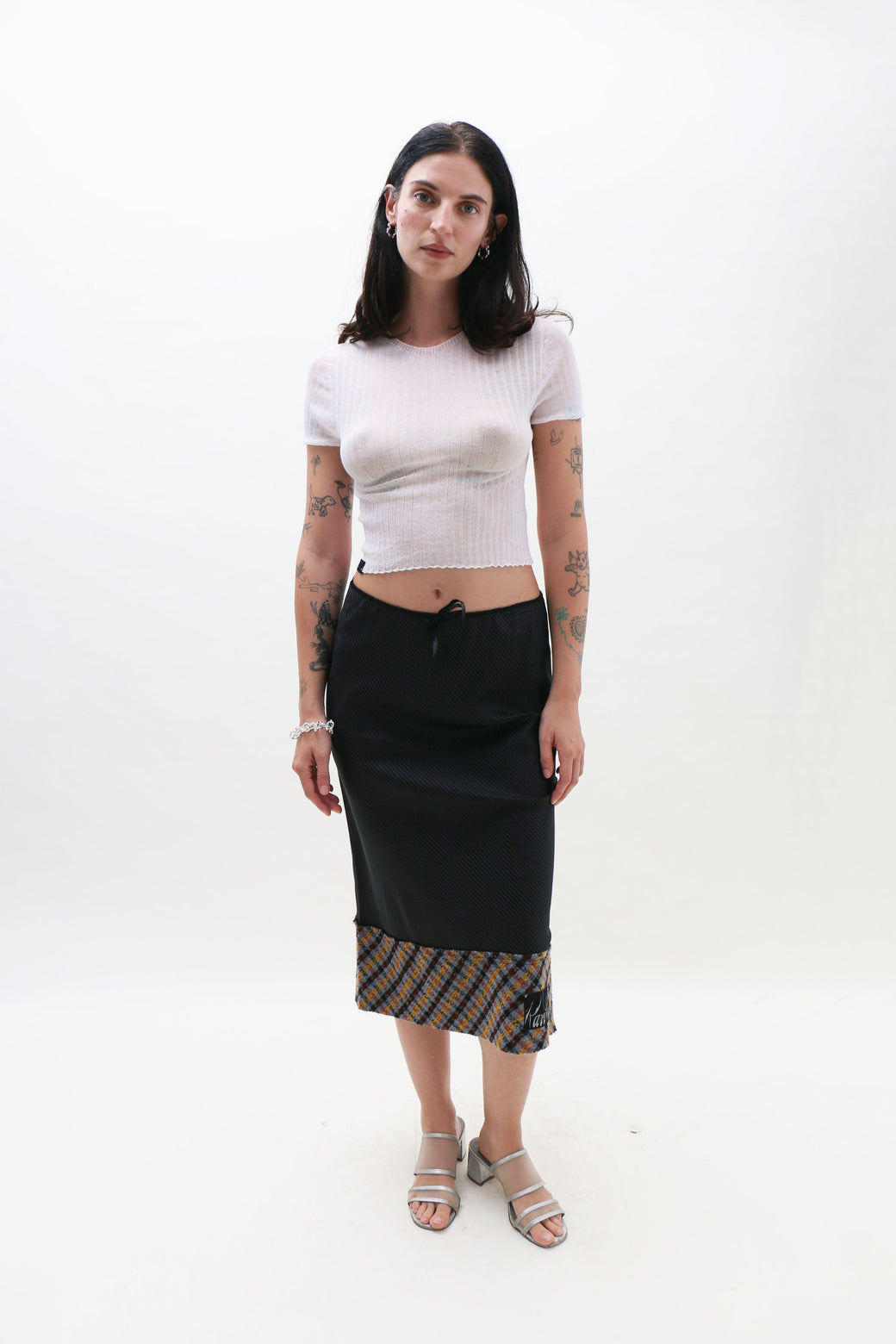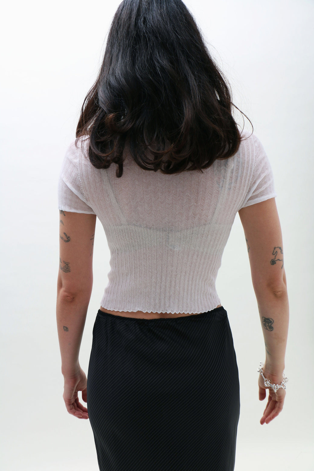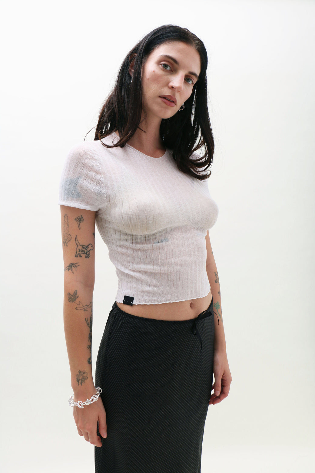 Superfine cotton seamless knit baby tee in white tulle with slightly ruffled edge. Extremely lightweight garment that expands to the contours of your body. These semi-sheer ribbed knits can be worn next to skin or layered under/over garments to add another dimension to your wardrobe. Made in New Zealand.
