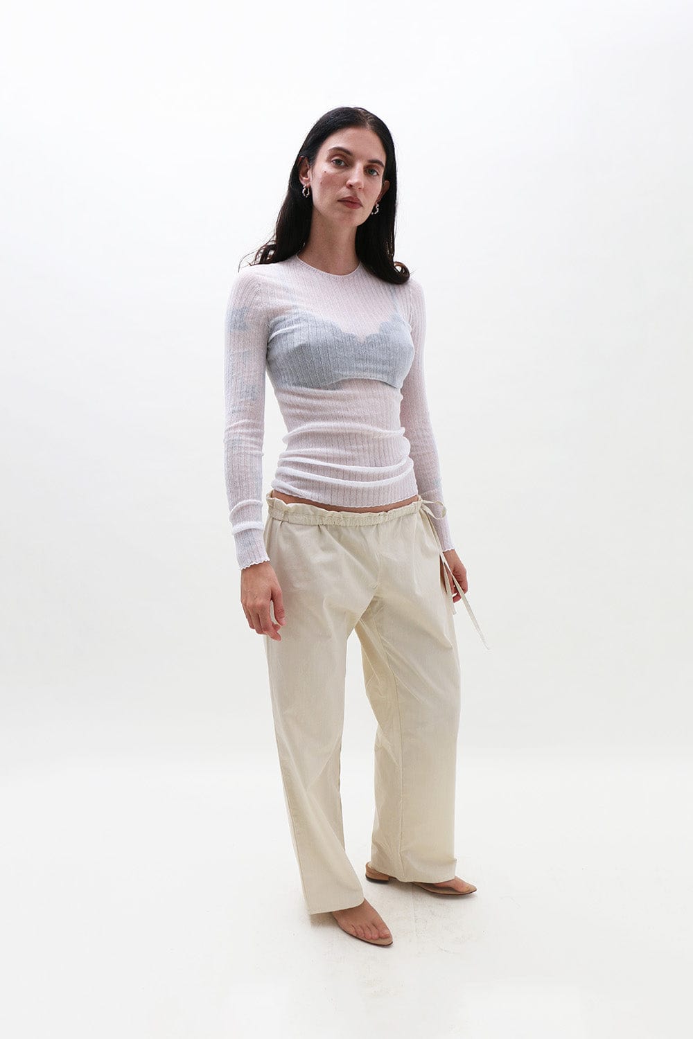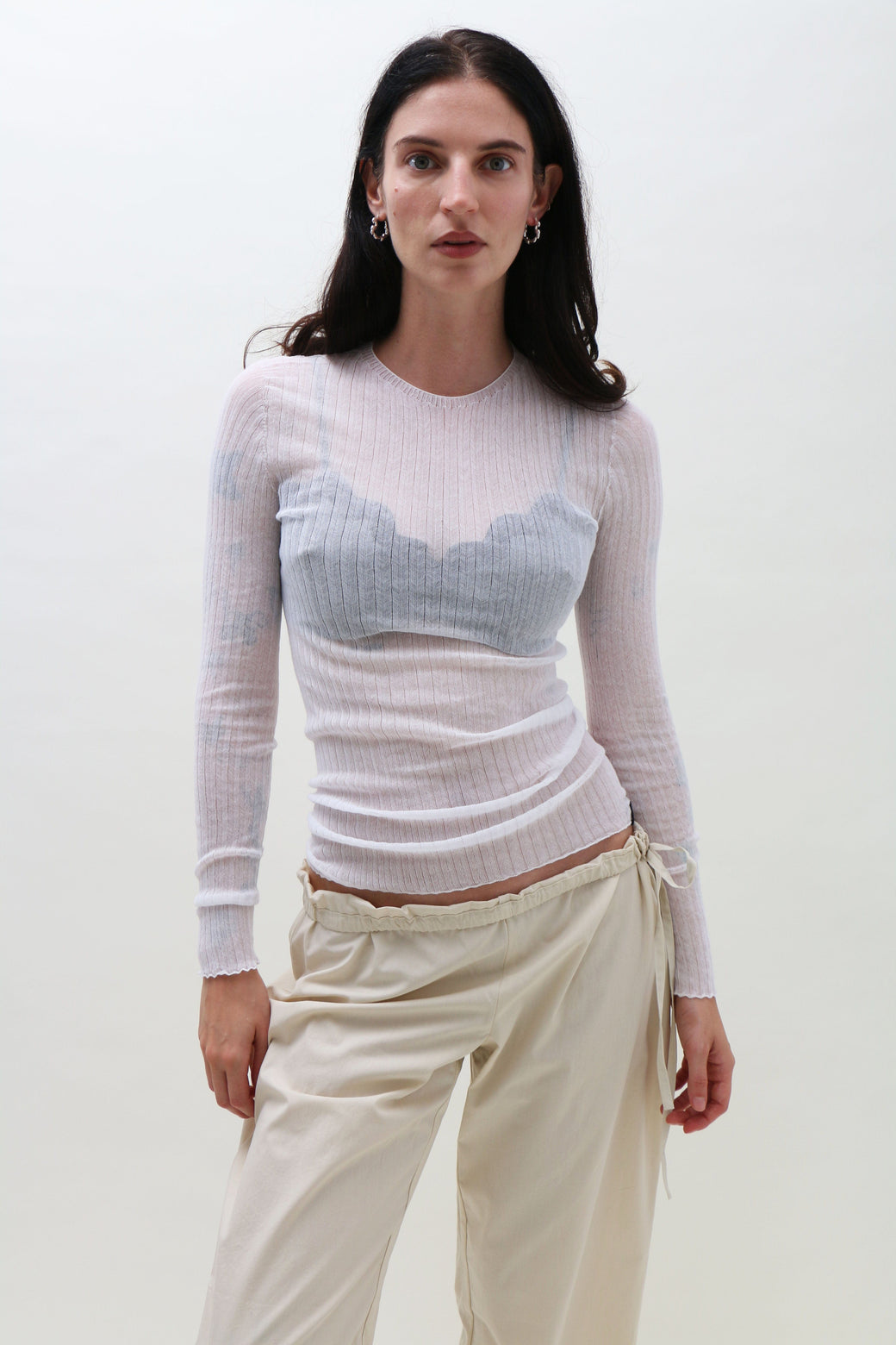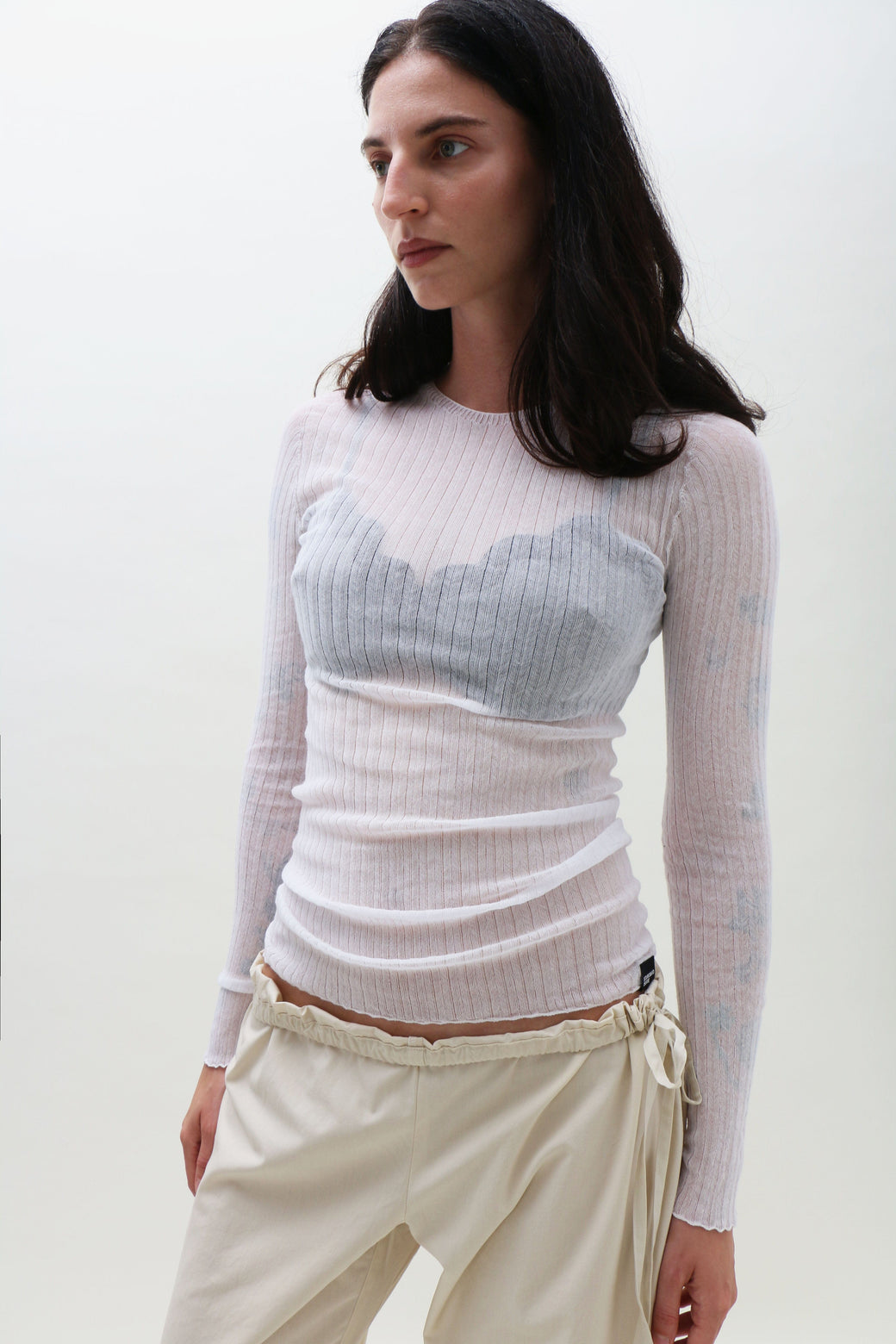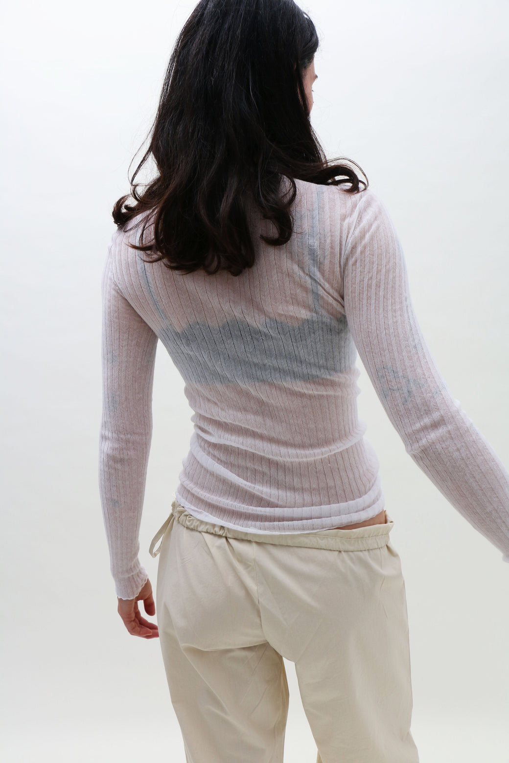 Layerable superfine cotton seamless knit long sleeve. Slight ruffled edge in white tulle. Extremely lightweight garment that molds to the contours of your body. These semi-sheer ribbed knits can be worn next to skin or layered under/over garments to add another dimension to your wardrobe. Made in New Zealand.