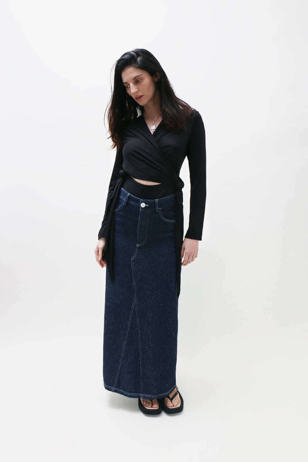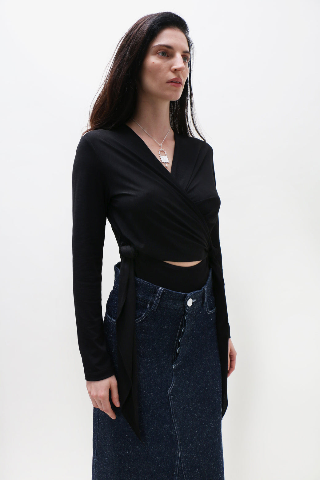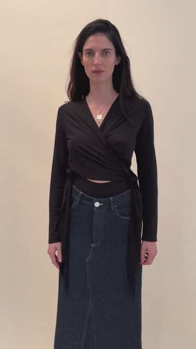The wrap sling bodysuit is inspired by the intuitive design of baby slings. Featuring a soft wrap construction, a flattering V-neckline, and gathered detailing along the front and back, it is finished with a self-tie for an adjustable fit.