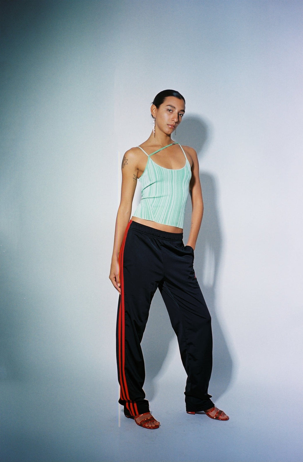 Two-tone rib knit singlet with a scoop neckline and asymmetric straps accented with egg hardware. Paris Georgia is a New Zealand-based design company with an emphasis on the female form and quality construction. Worn the Justine Clenquet Shanon Earrings.