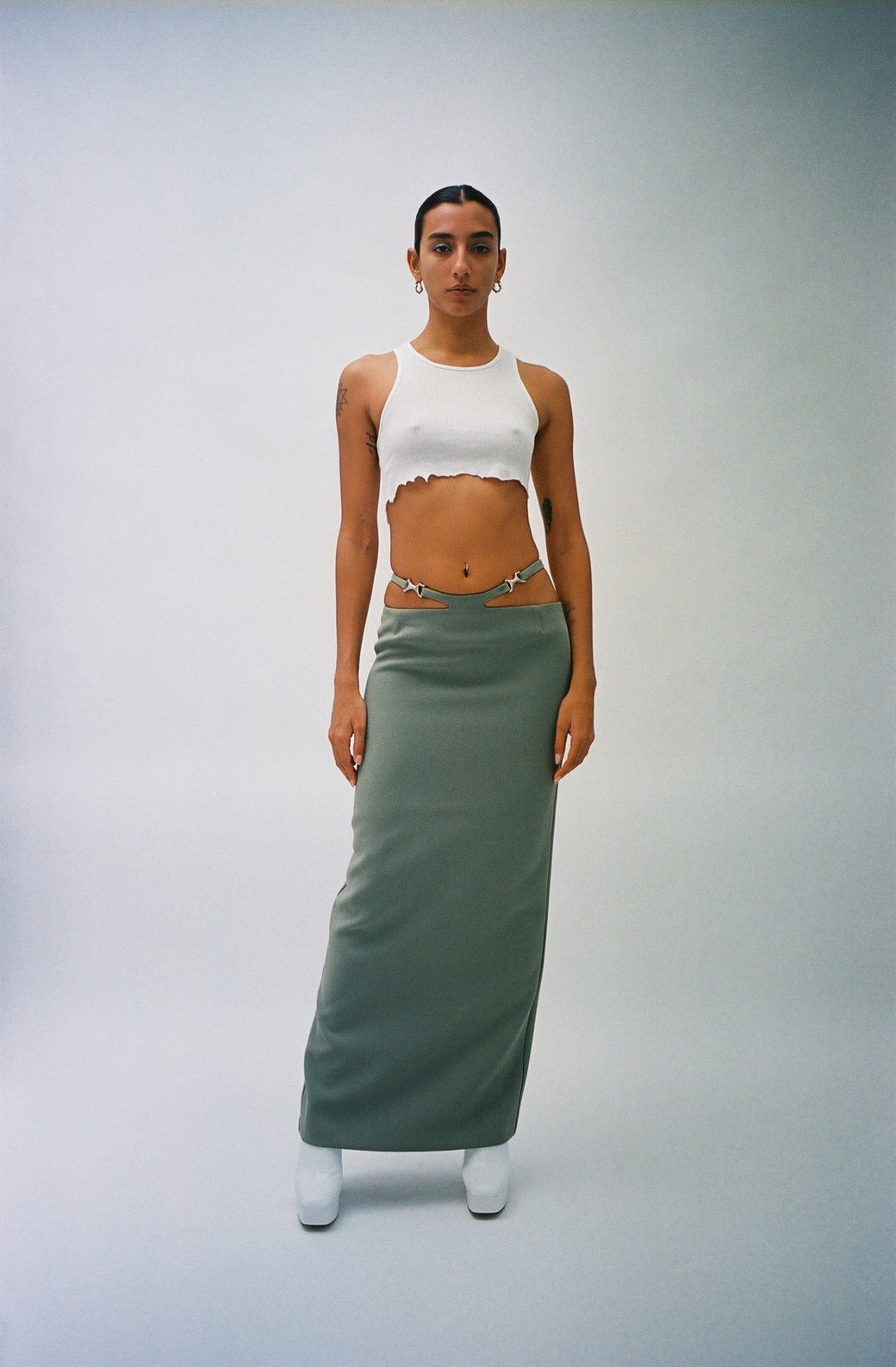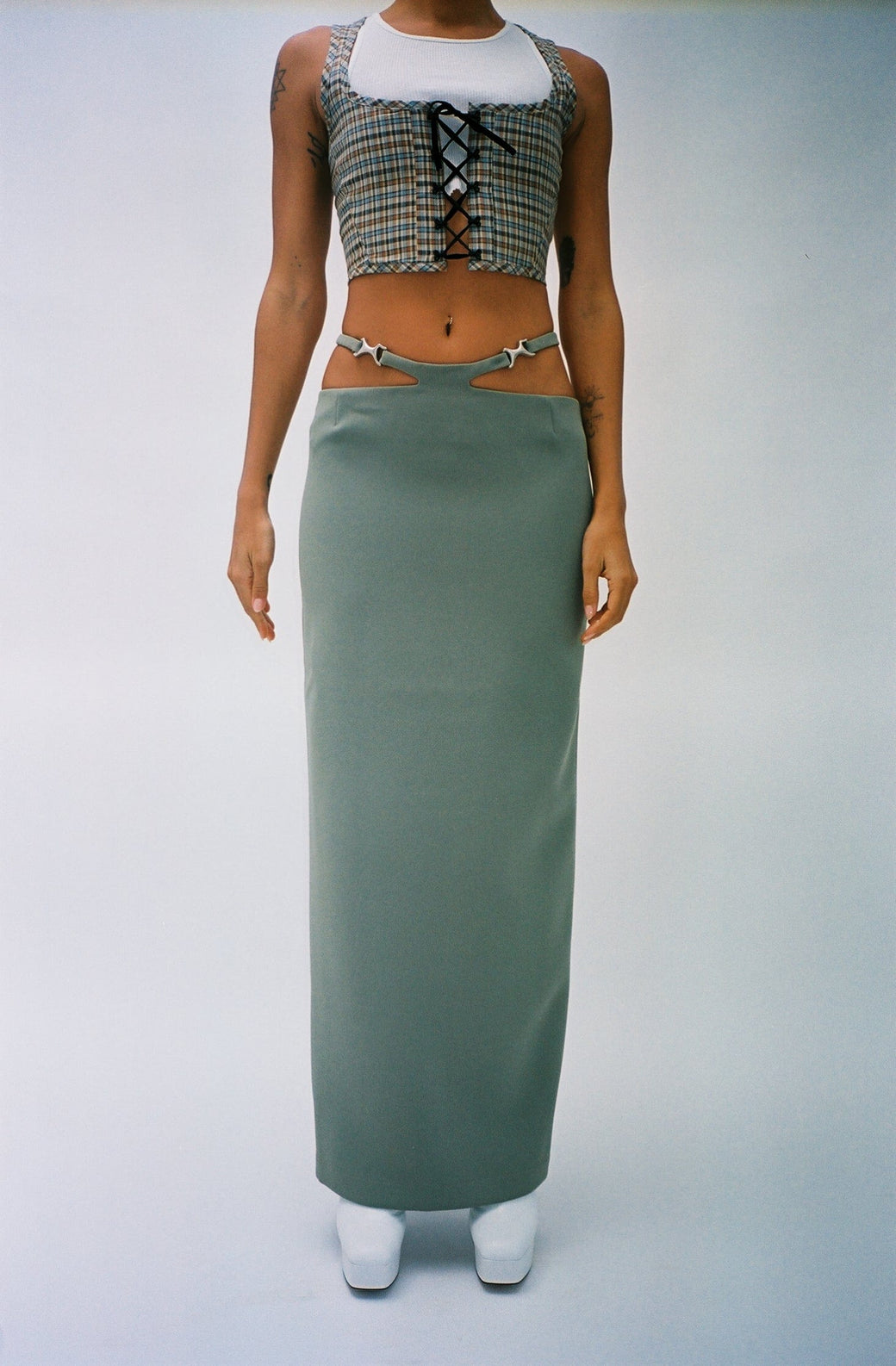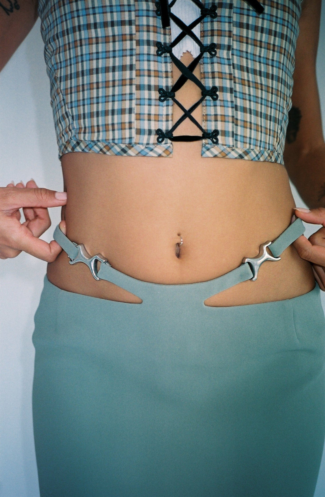 The Frida Skirt features a cutout waistband with abstract handle hardware, which sits on the hips. This is a straight style with center-back zip and split. Paris Georgia is a New Zealand-based design company with an emphasis on the female form and quality construction. Worn with the Salter House Blue and Brown Check Corset and the Baserange Undye Tie Tank Bra.