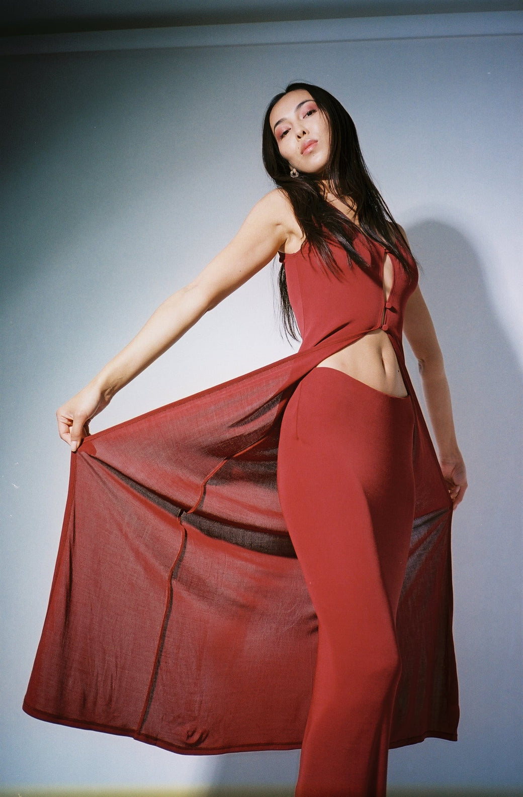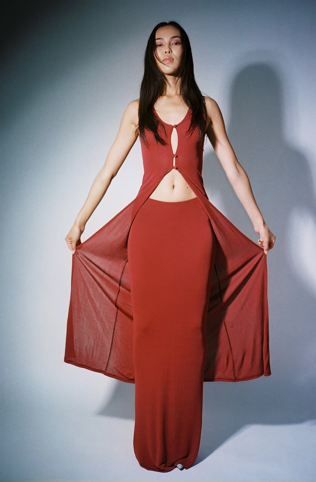 Over singlet in the crimson colorway. Semi-sheer slinky knit fabric. Tank sleeves and ankle length. Cutout center detail with 3 looped button closures. Paris Georgia is a New Zealand based design company with an emphasis on the female form and quality construction. Worn with the knit skirt.