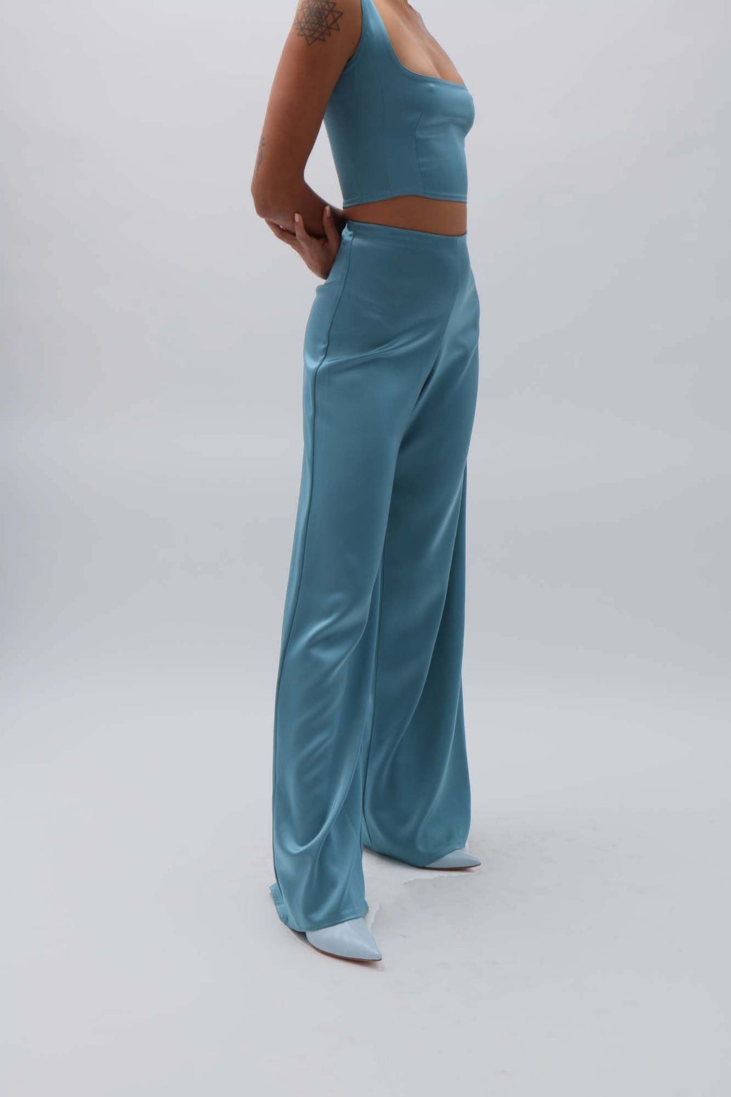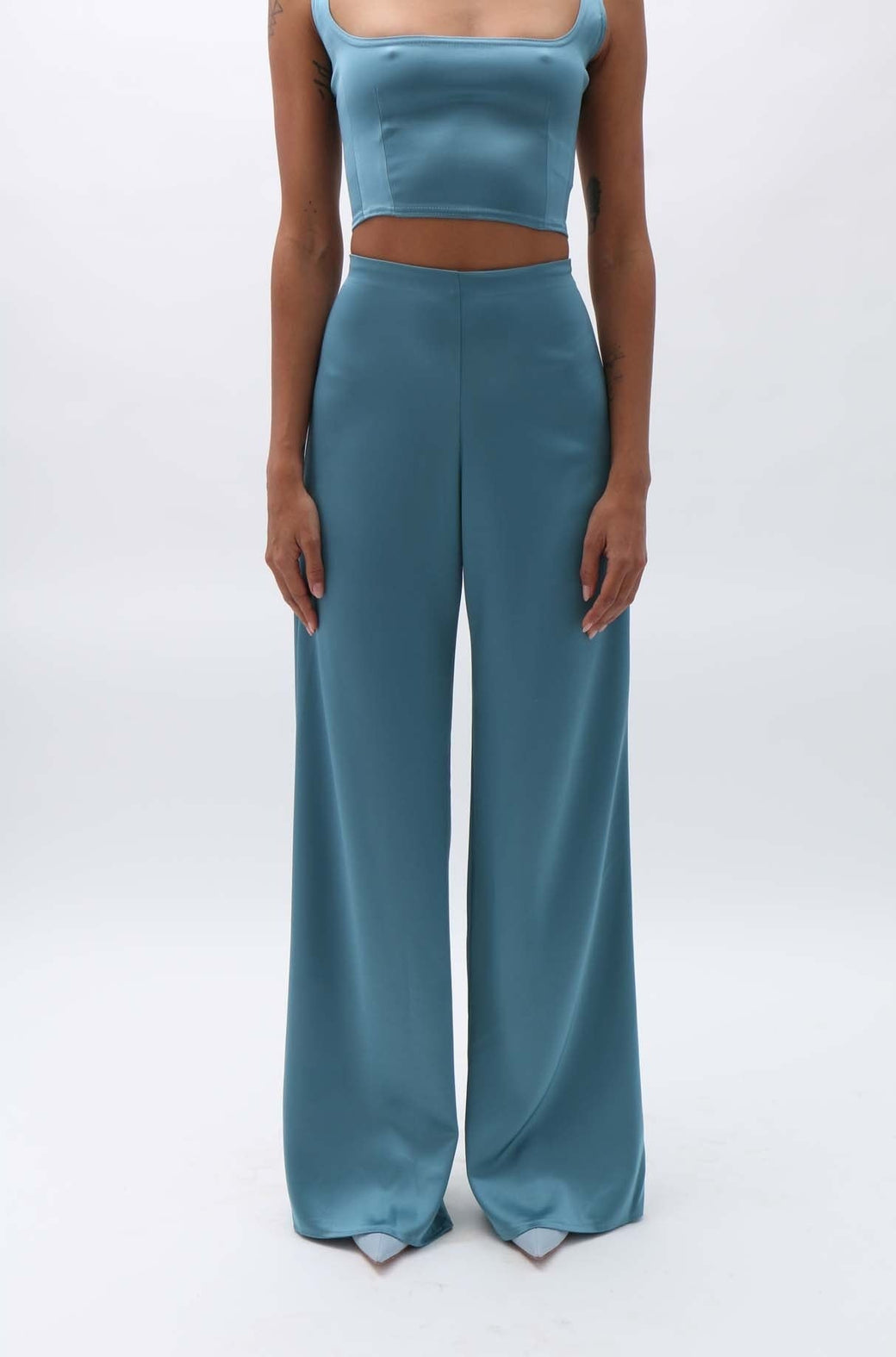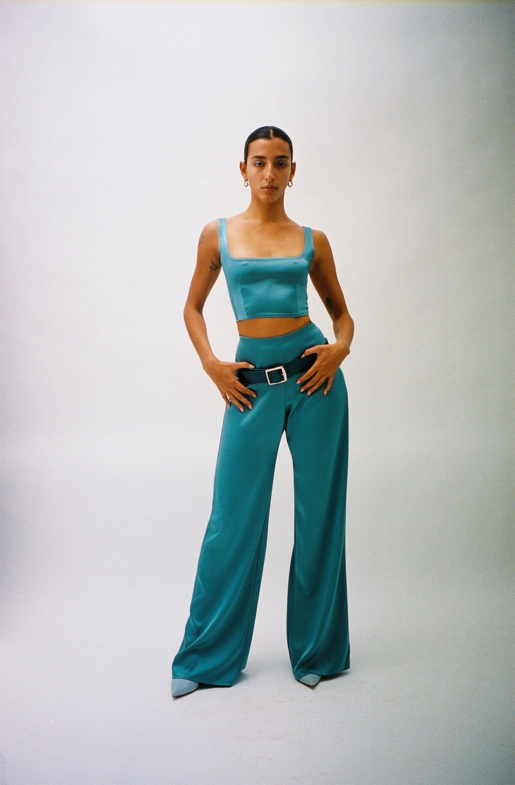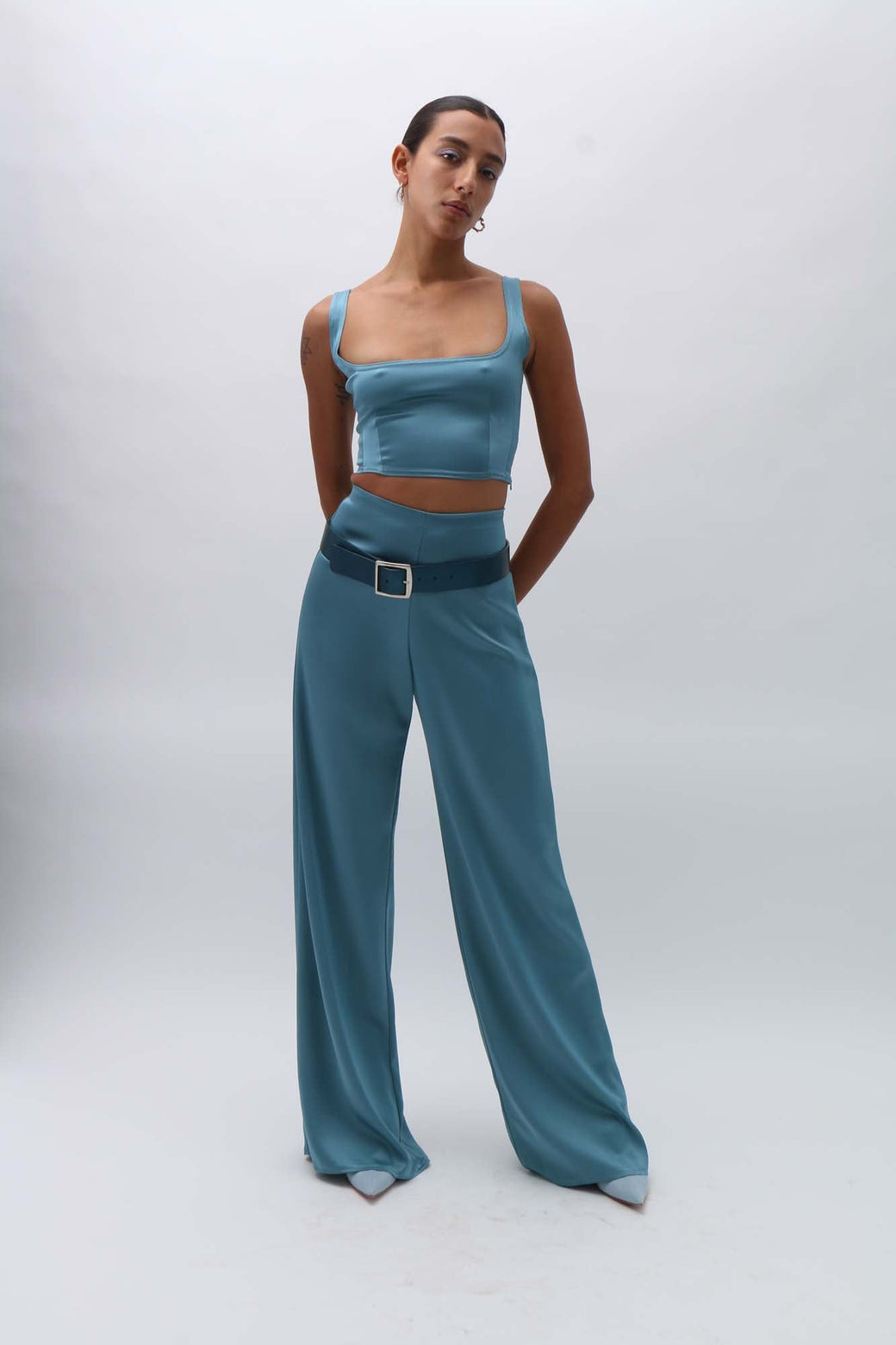 A Paris Georgia staple. The Marnie Pant is a fluid high-waisted, flared trouser. Flattering and effortless it pairs perfectly with the Marnie Top. Paris Georgia is a New Zealand-based design company with an emphasis on the female form and quality construction. Worn with the Sea Marnie Top and the Hannah Jewett Silver Mutant Cloud Earrings and Aegean Pablo Belt.