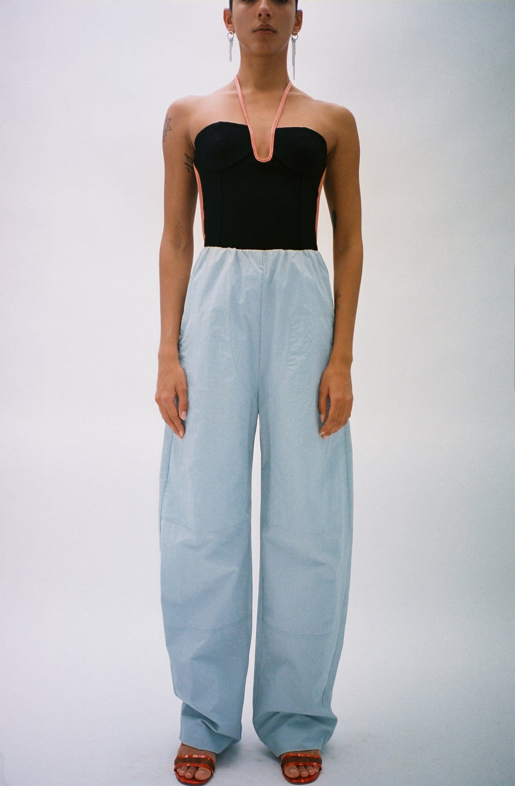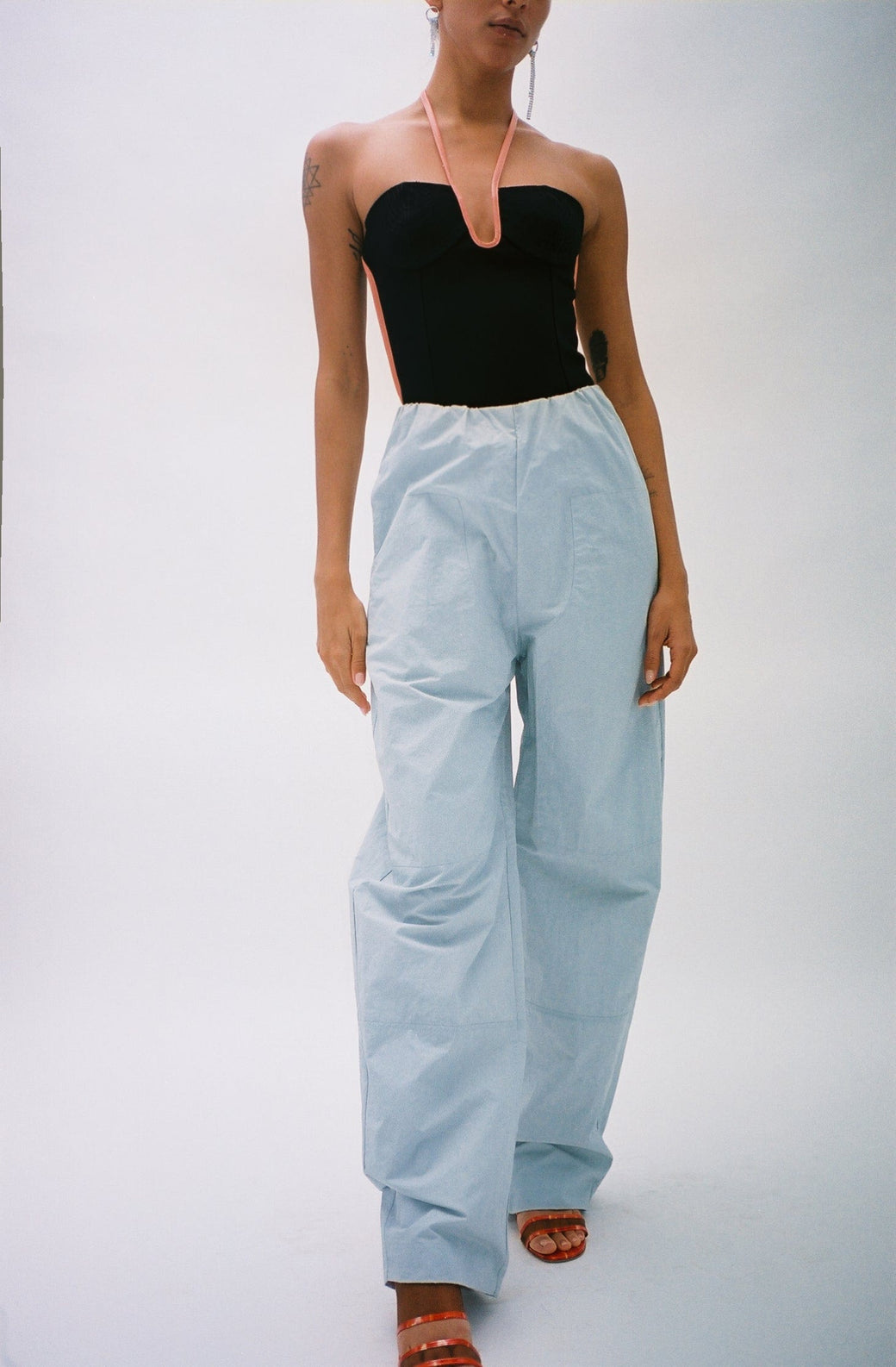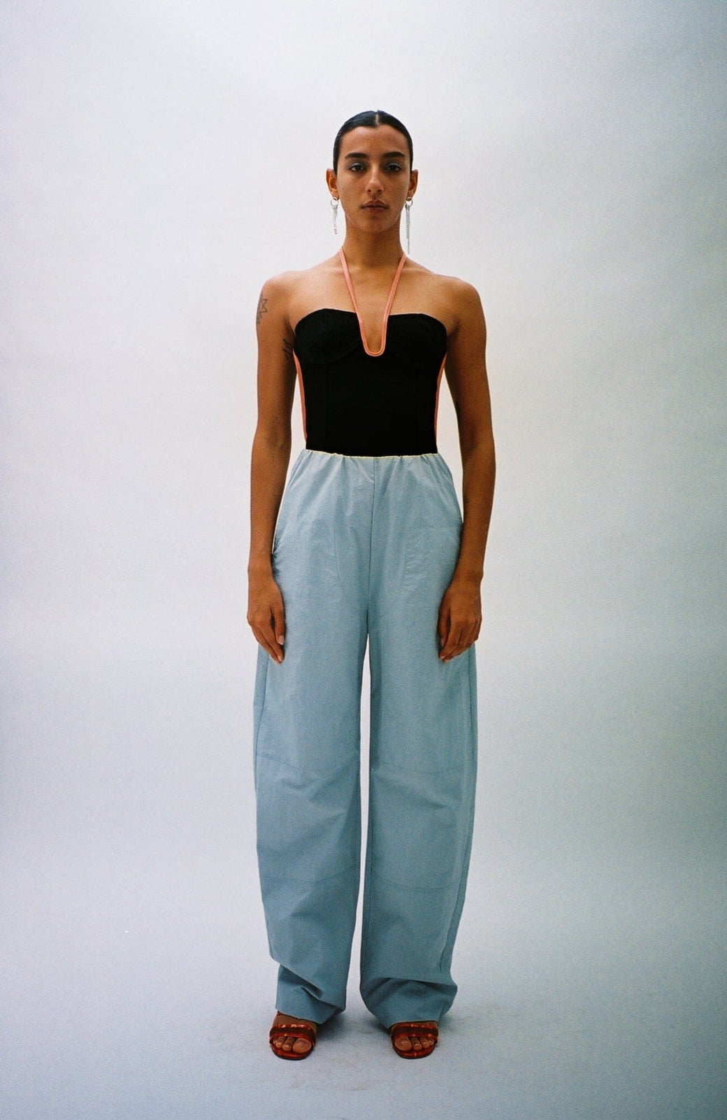 A relaxed cargo style trouser with an elasticated waistband. Constructed using washed cotton, creating a parachute-like structure. In light blue. Paris Georgia is a New Zealand-based design company with an emphasis on the female form and quality construction. Worn with the Black Nassia Singlet and the Justine Clenquet Shanon Earrings.