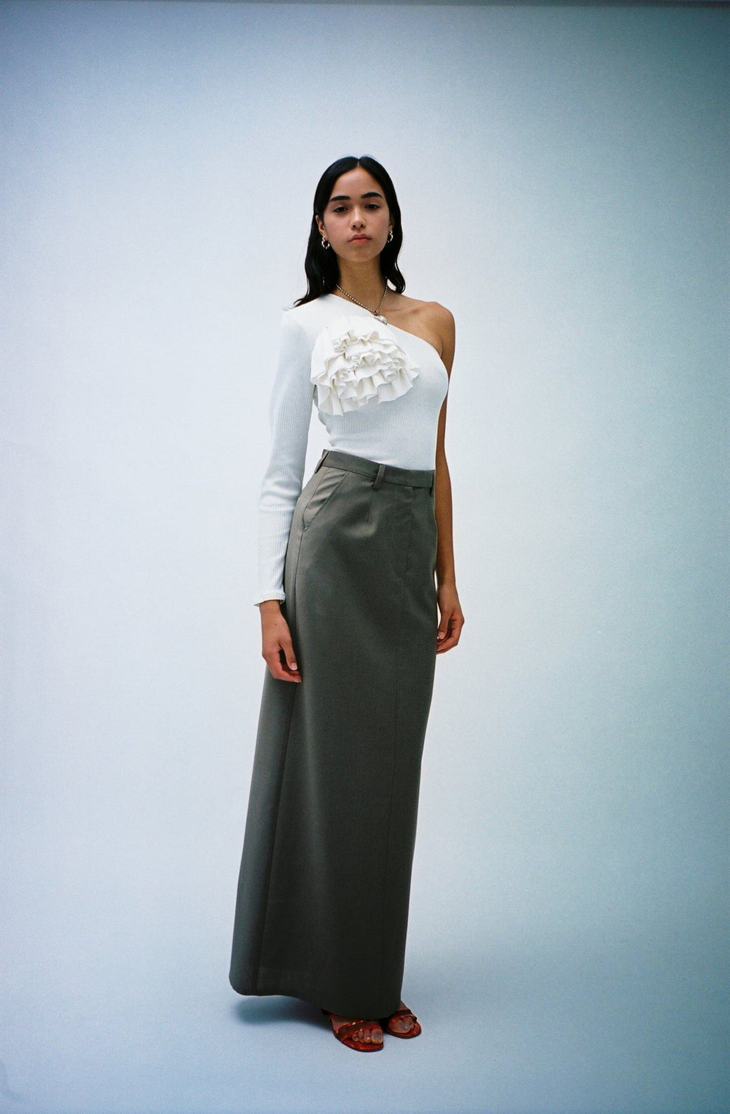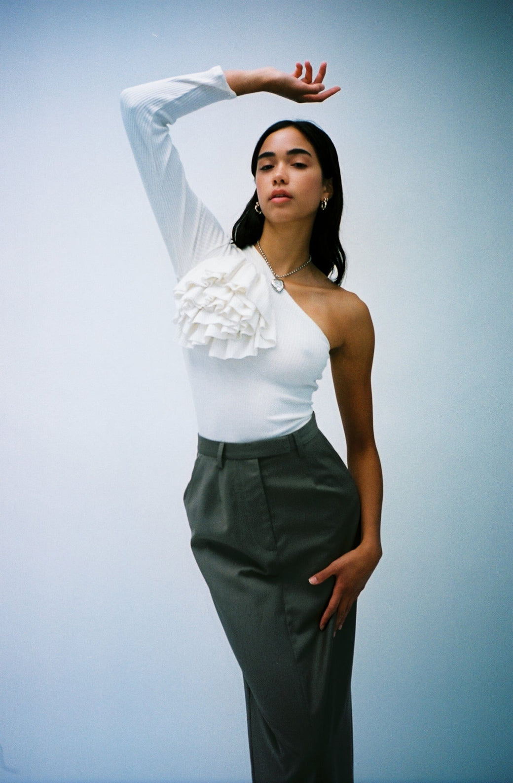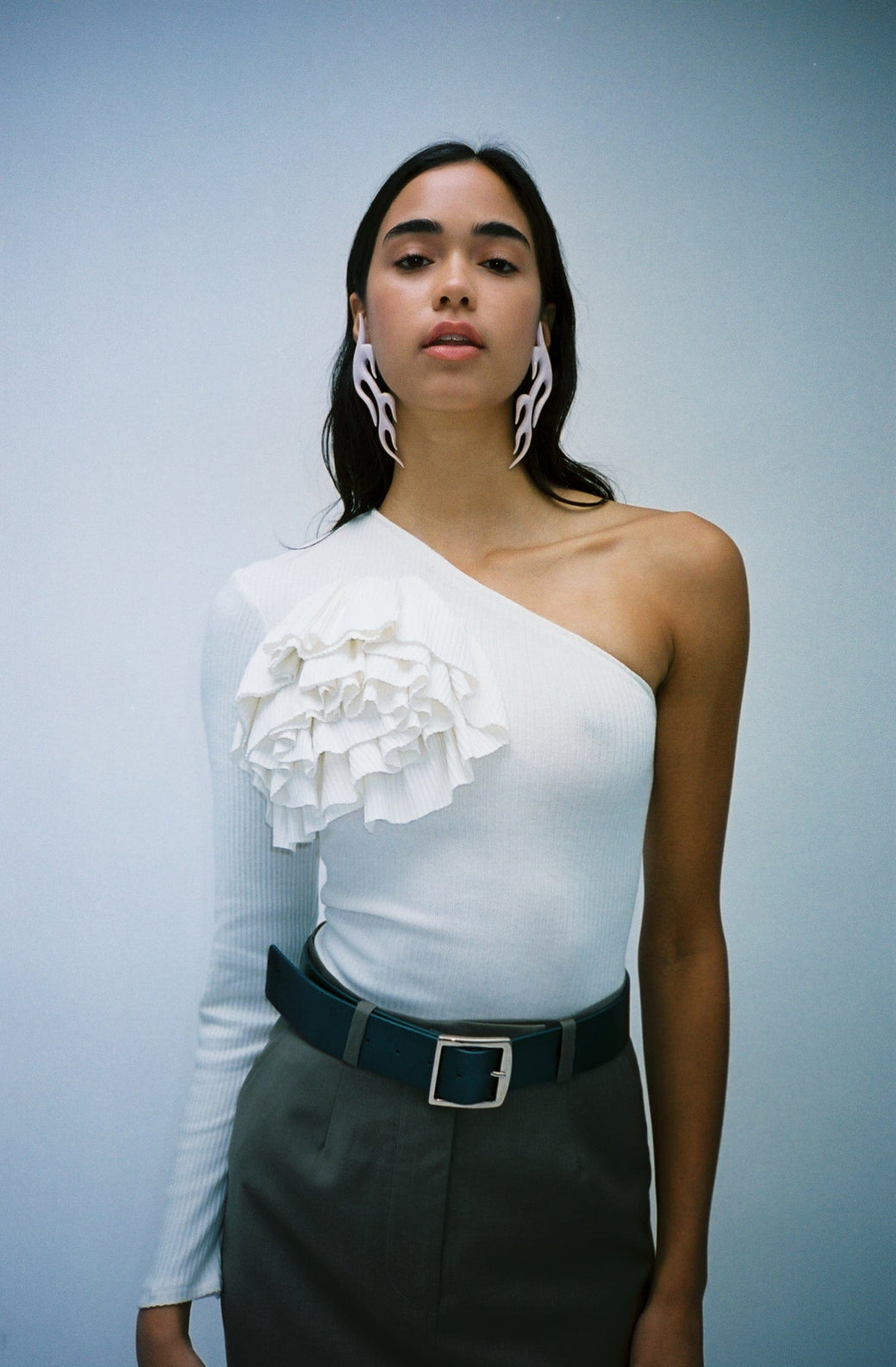 One shoulder ribbed long-sleeve top in bone white. Features an off-center draped tiered ruffle on the front chest. Each piece is one-of-a-kind with slight variations. Handcrafted in small batches in New York City. Worn with the Pacha Necklace, Aegean Pablo Belt and, Simi Skirt.