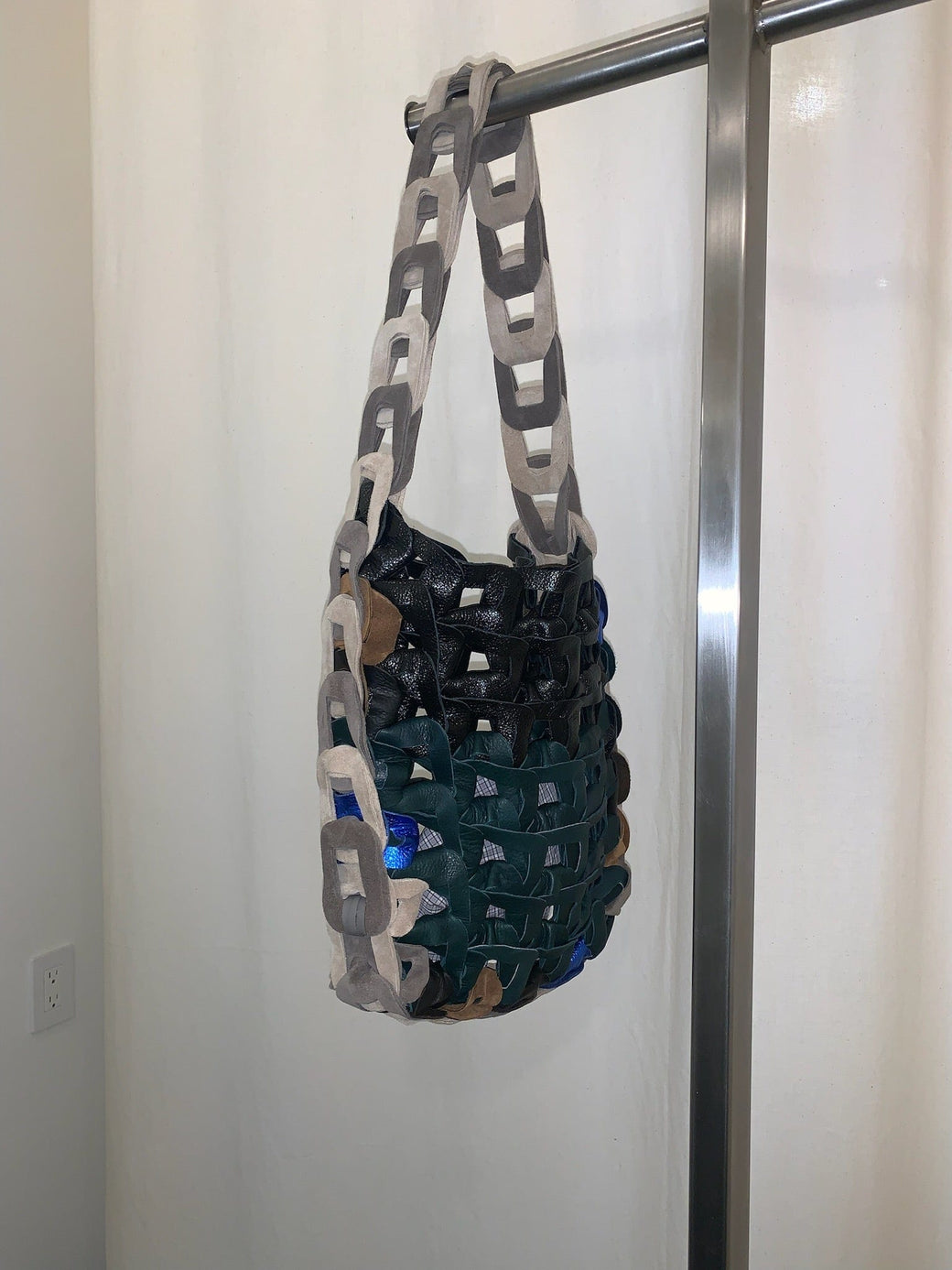 A Maimoun Fall 2025 exclusive, the Loot Medium Links Tote is composed of upcycled interlocked leather links. The top half features black metallic leather, while the base is deep green, accented with shades of beige suede links along the edges. Subtle pops of metallic blue appear throughout the design. Designed to be worn as a shoulder bag.