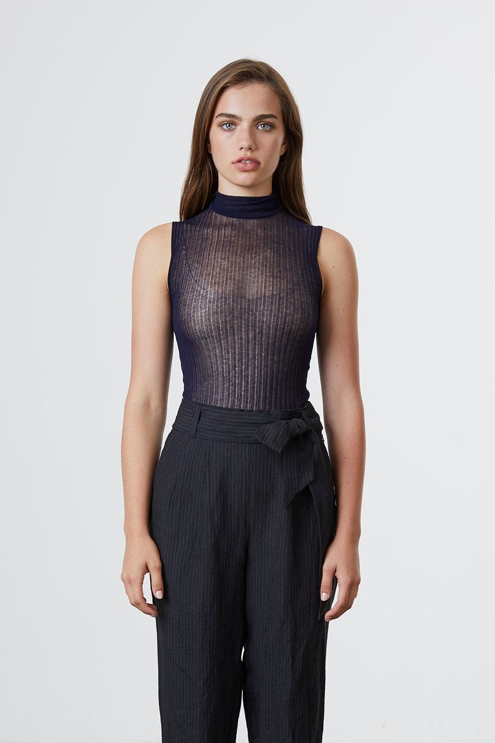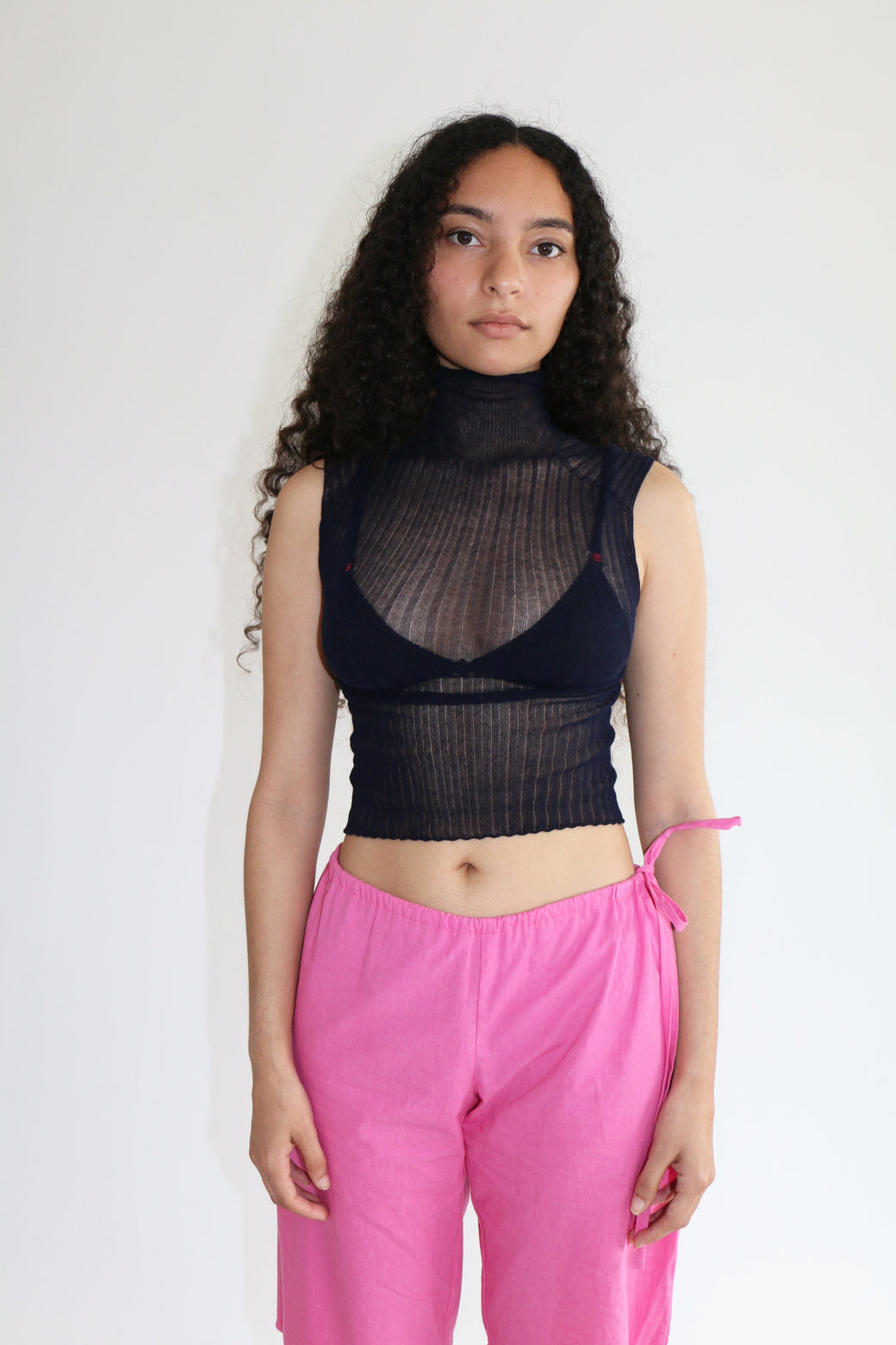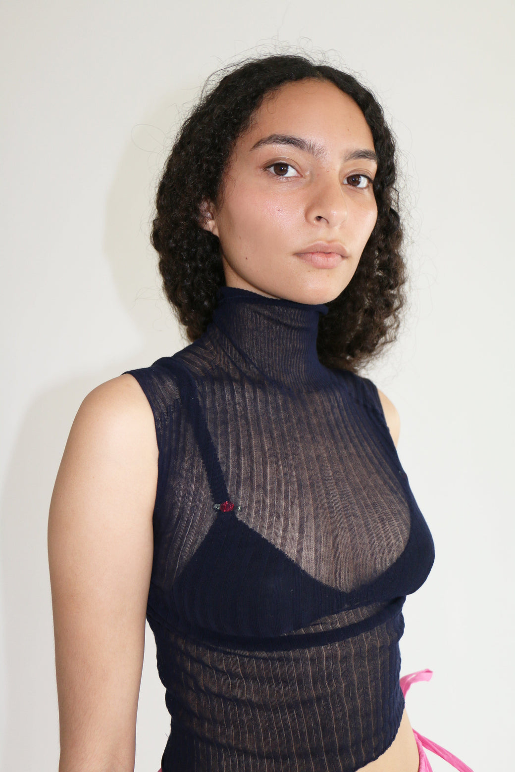Superfine cotton seamless knit tee in navy tulle with slightly ruffled edge. High neck and cropped fit. Extremely lightweight garment that expands to the unique contours of your body. These semi-sheer ribbed knits can be worn next to skin or layered under/over garments to add another dimension to your wardrobe. Made in New Zealand.