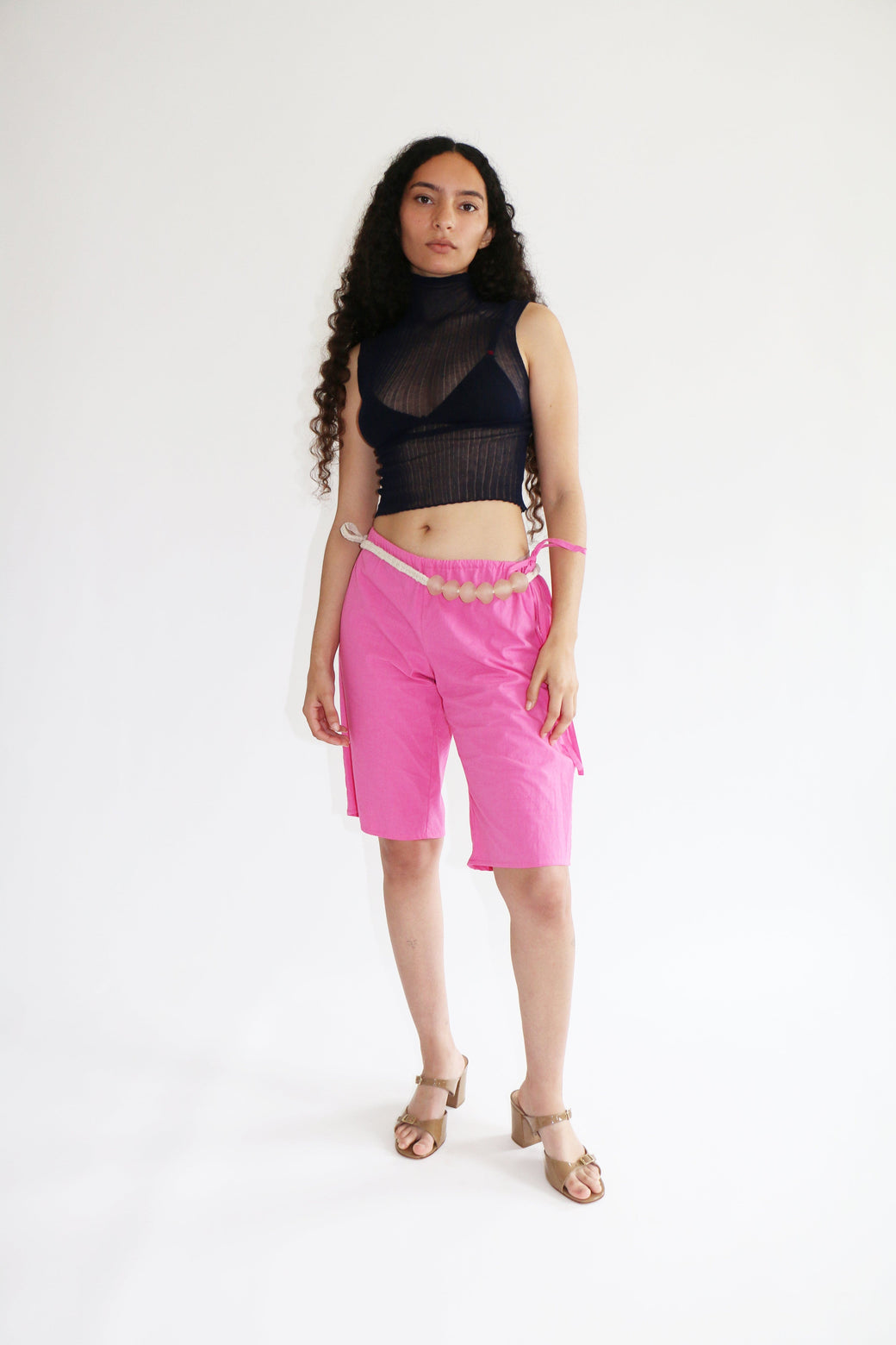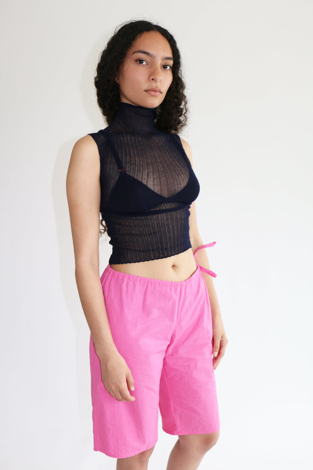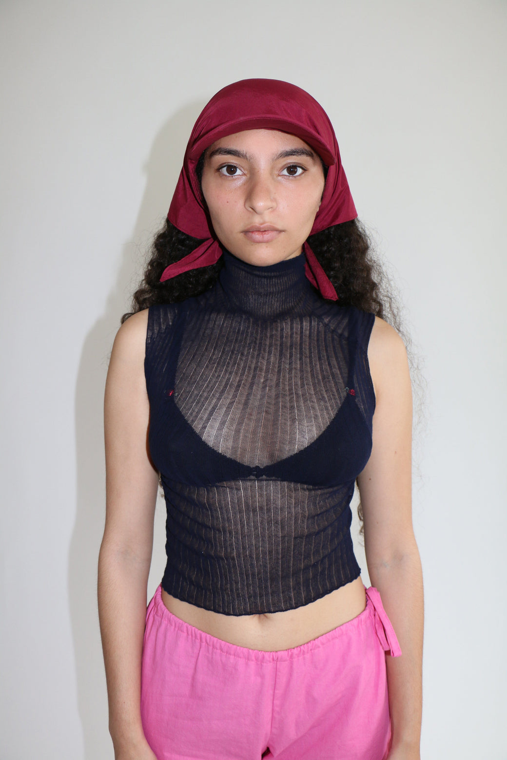 Superfine cotton seamless knit tee in navy tulle with slightly ruffled edge. High neck and cropped fit. Extremely lightweight garment that expands to the unique contours of your body. These semi-sheer ribbed knits can be worn next to skin or layered under/over garments to add another dimension to your wardrobe. Made in New Zealand.