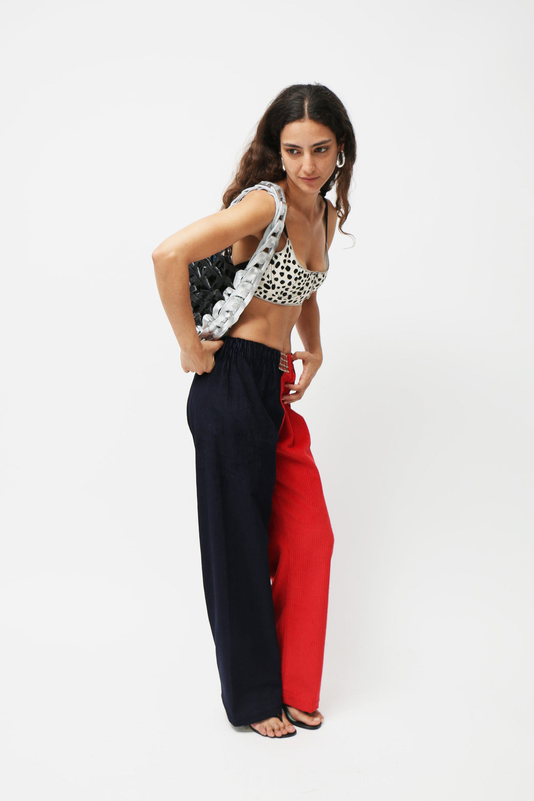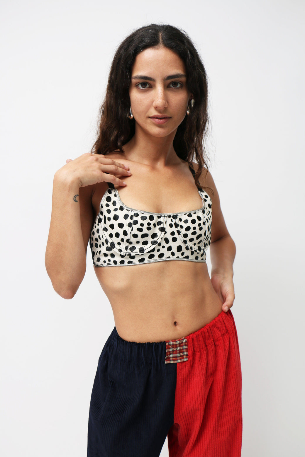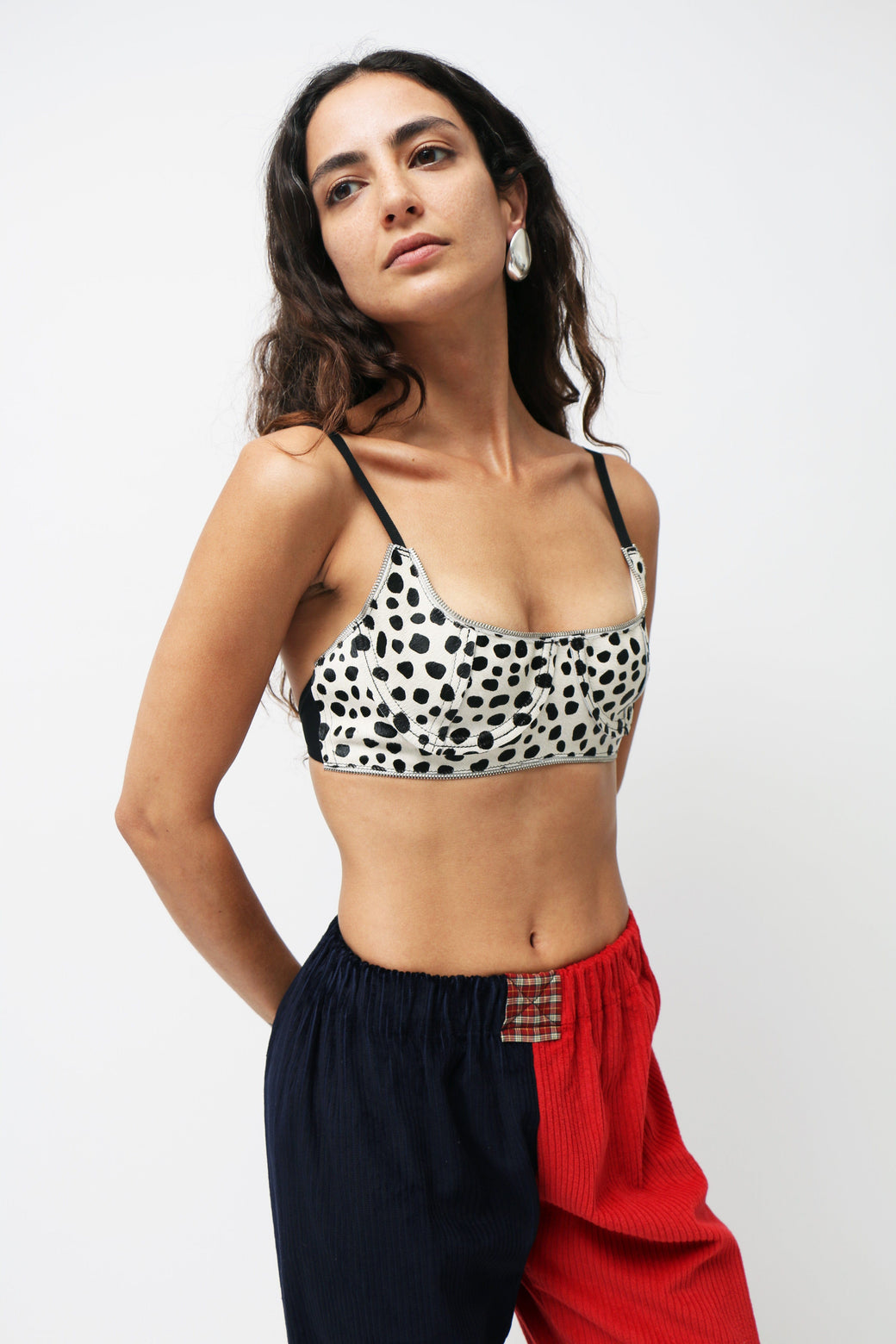 Half-cup bra crafted from pony leather in a striking Dalmatian print. Designed with sleek black spaghetti straps and finished with a zipper detail at the top hem.