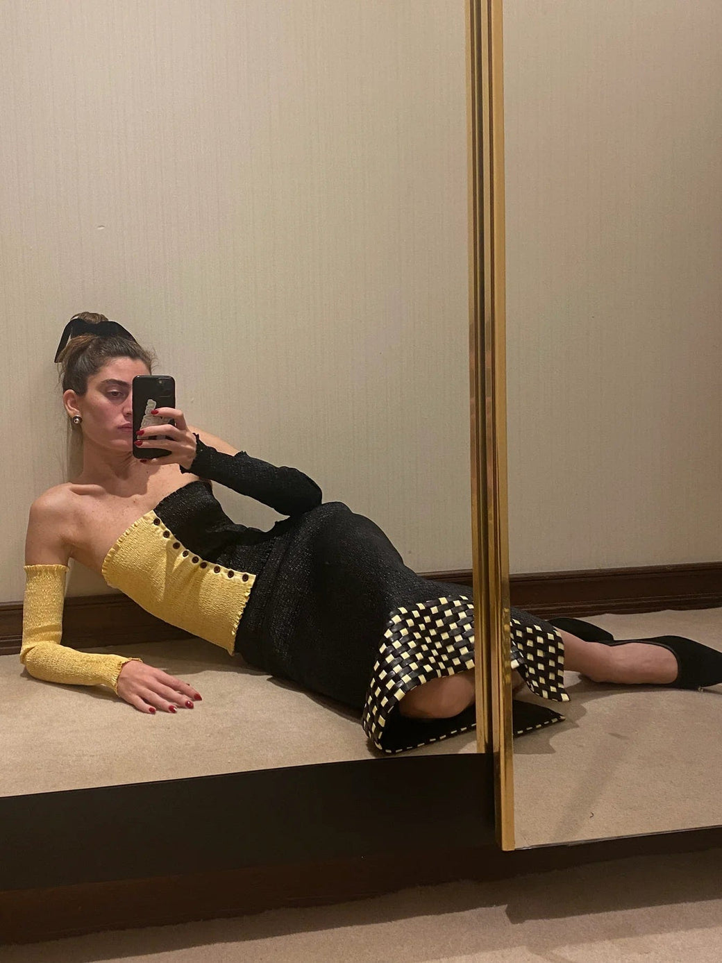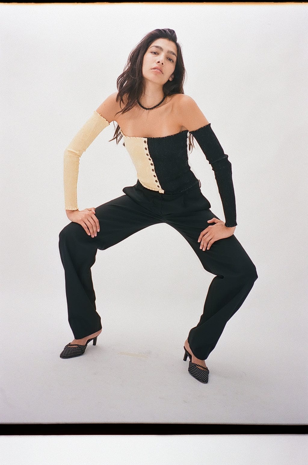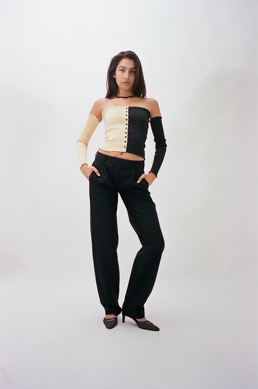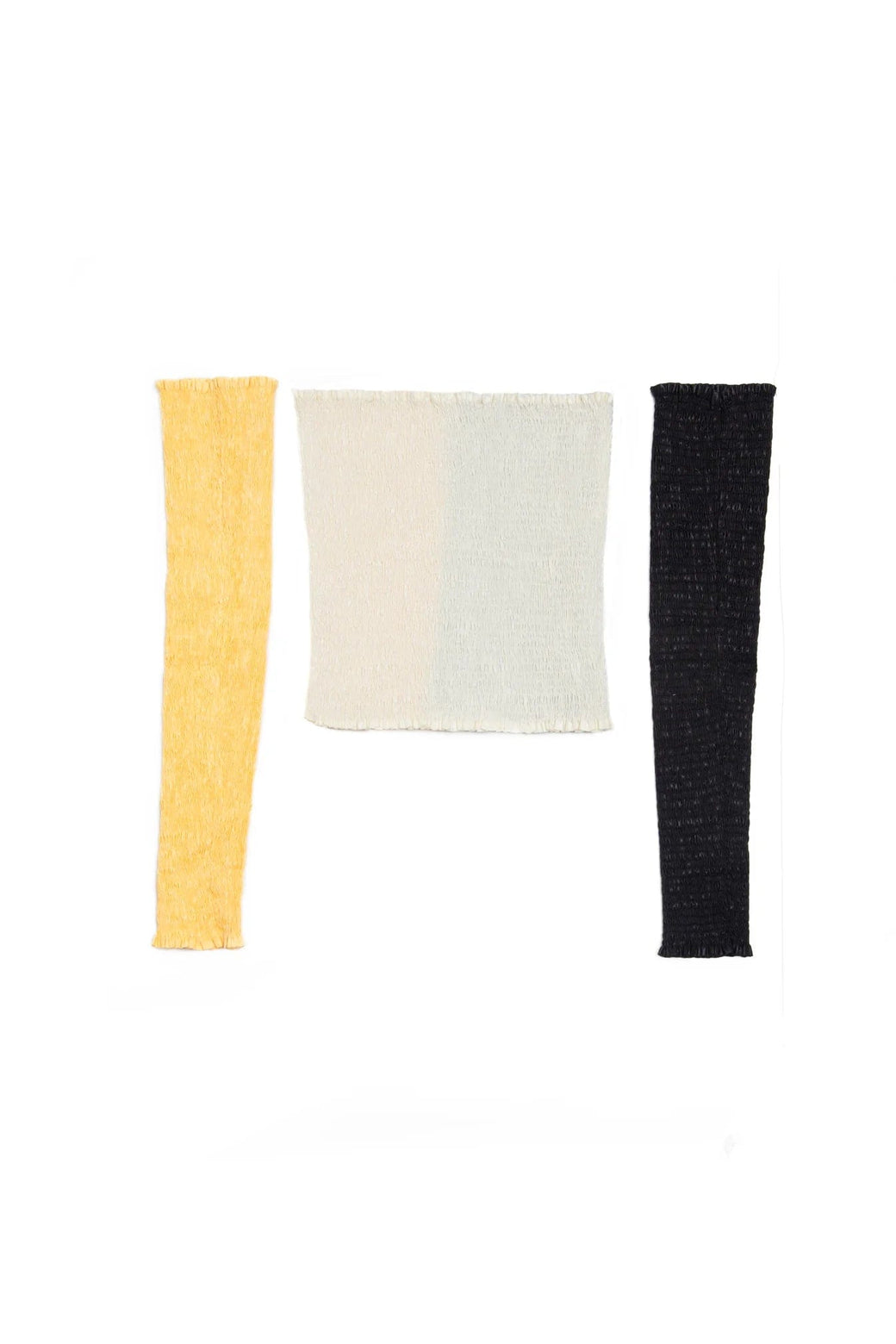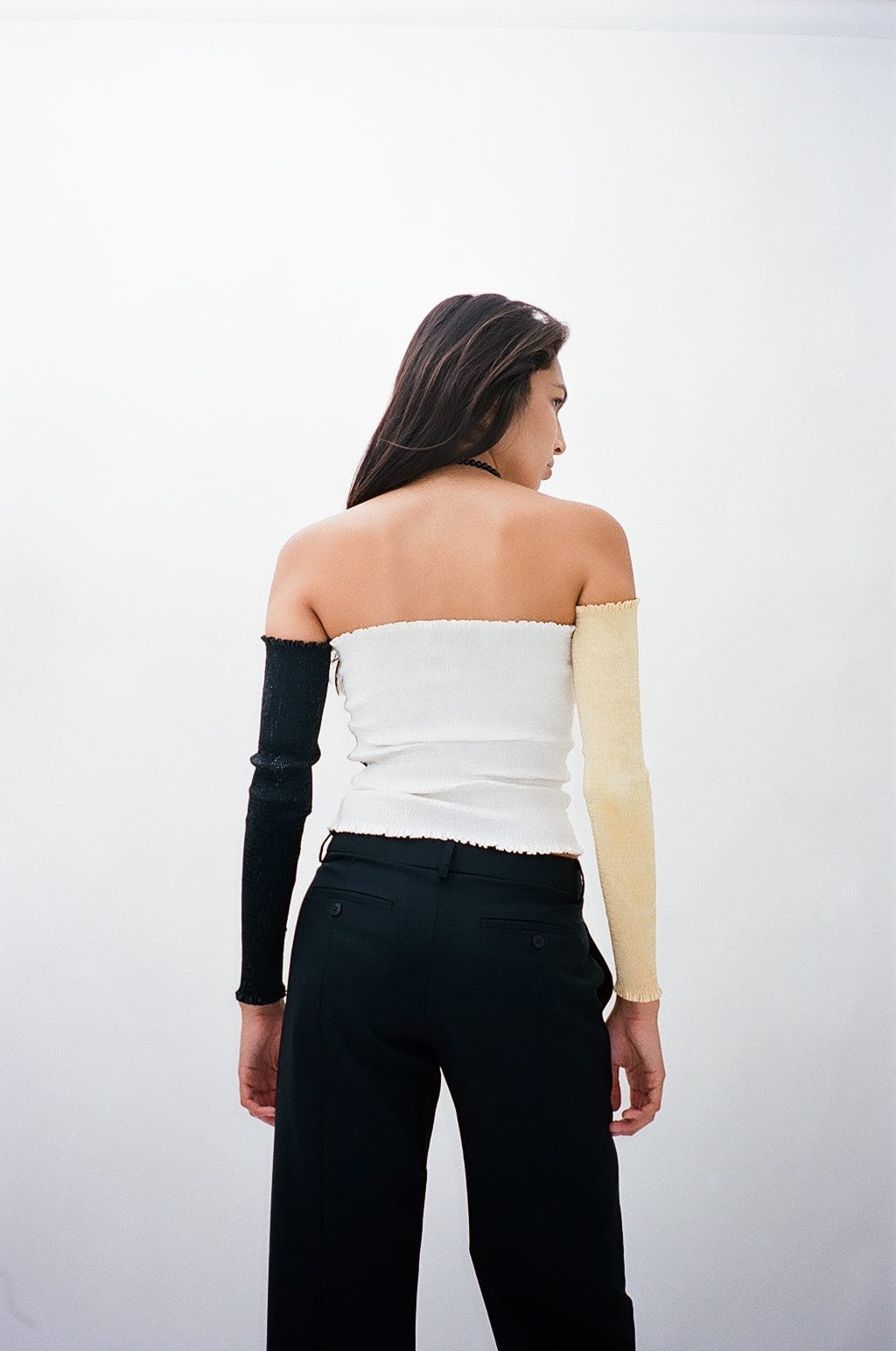 Shirred stretch cotton tube top in black, white and yellow. Featuring buttons along the front and detachable sleeves to style with (think the bust of Venus Di Milo).