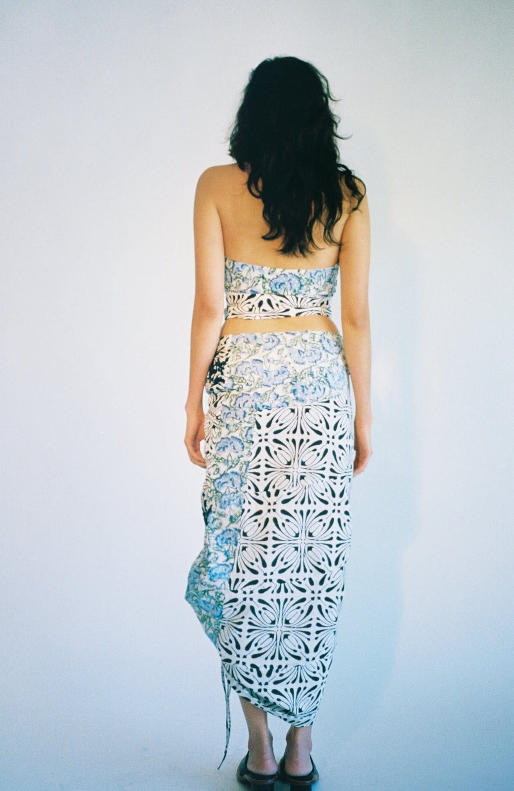 Low waist patchwork, hand-block printed skirt with blue metallic leaf motifs embroidered. In white with blue tonal print. Midi length. Lace up with cut-outs. Worn with the matching Jungle Top.