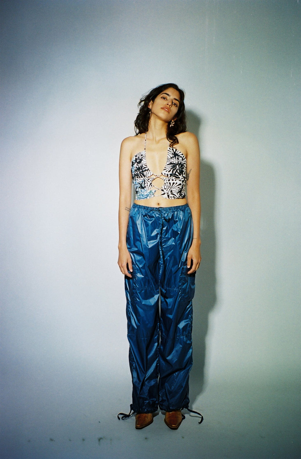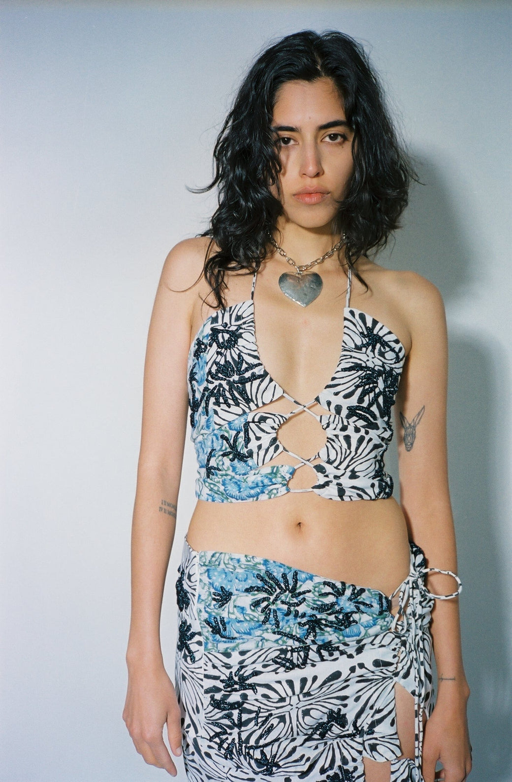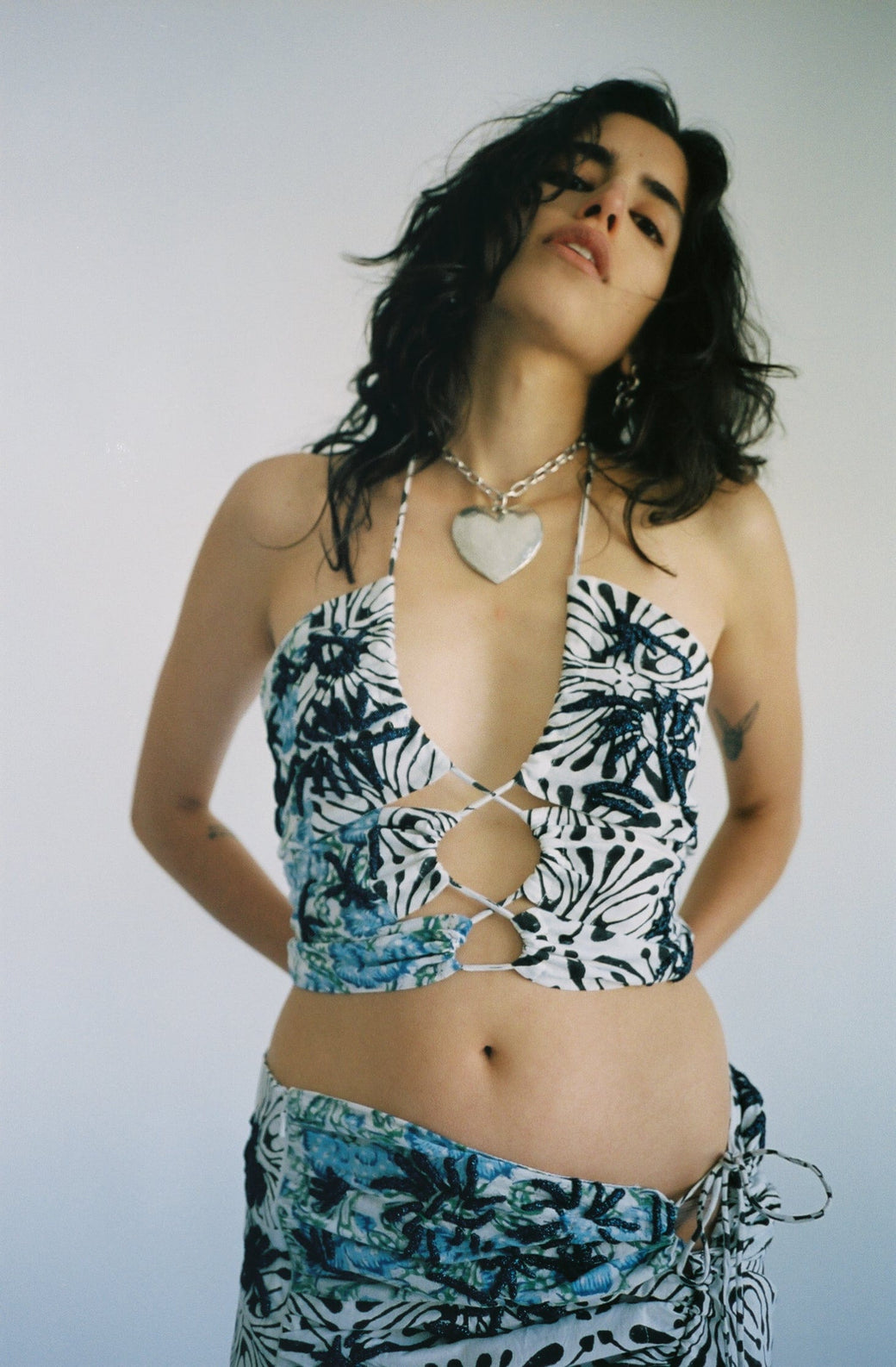 Patchwork hand block printed top with metallic blue leaf motifs embroidered. In white, and blue tonal. Lace up with cut-outs. Worn with the matching Jungle Skirt.