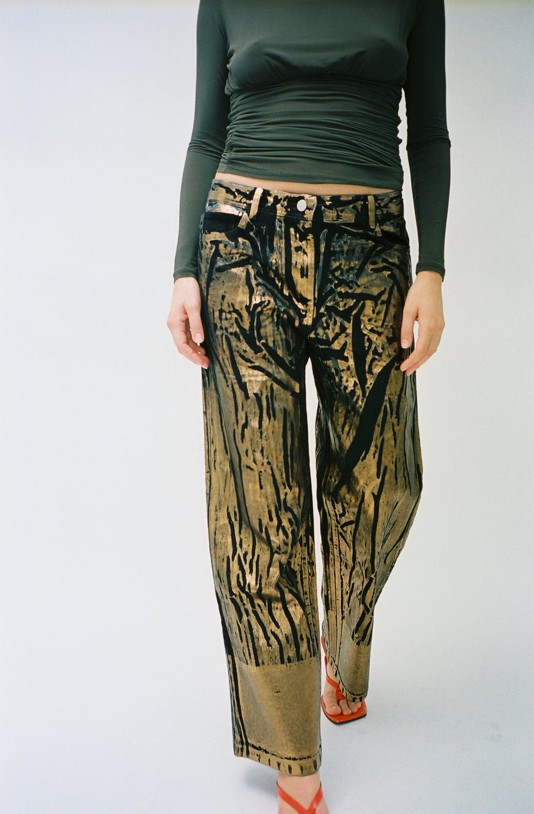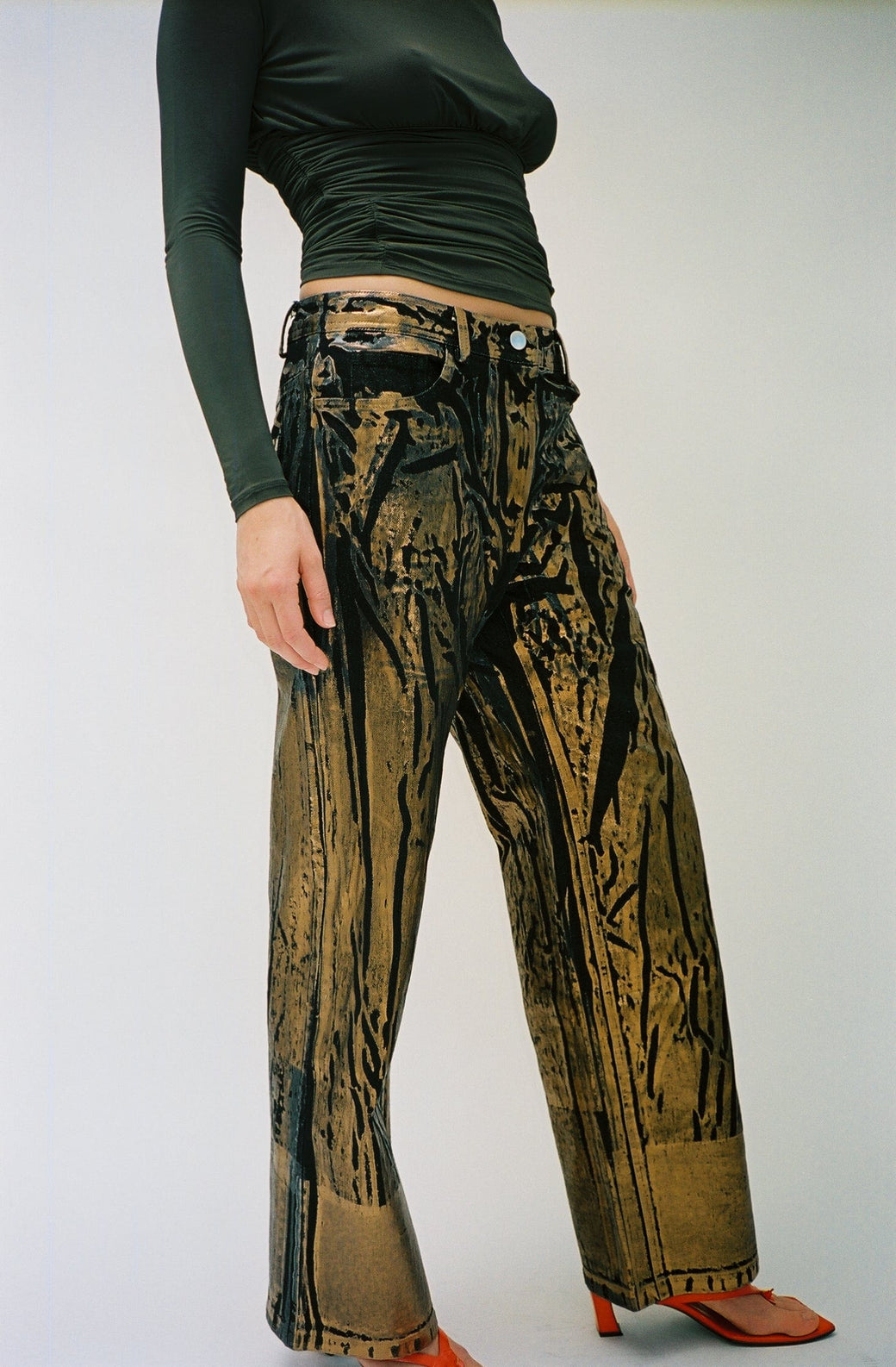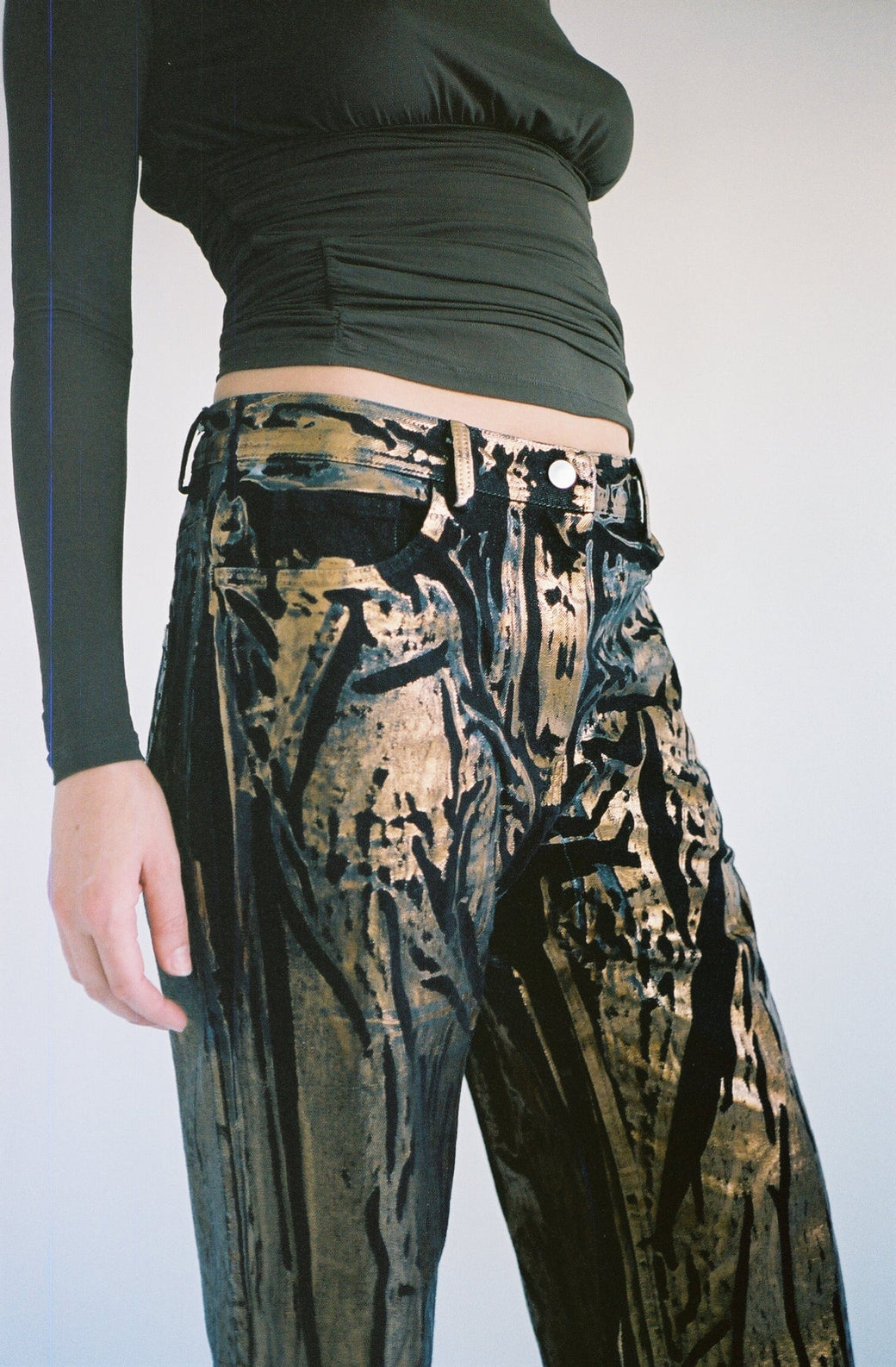 Straight-leg black denim jeans elevated by striking overprint of bronze metallic application. Each pair is uniquely screen-printed, small differences may exist due to the hand applied print nature of these jeans.
