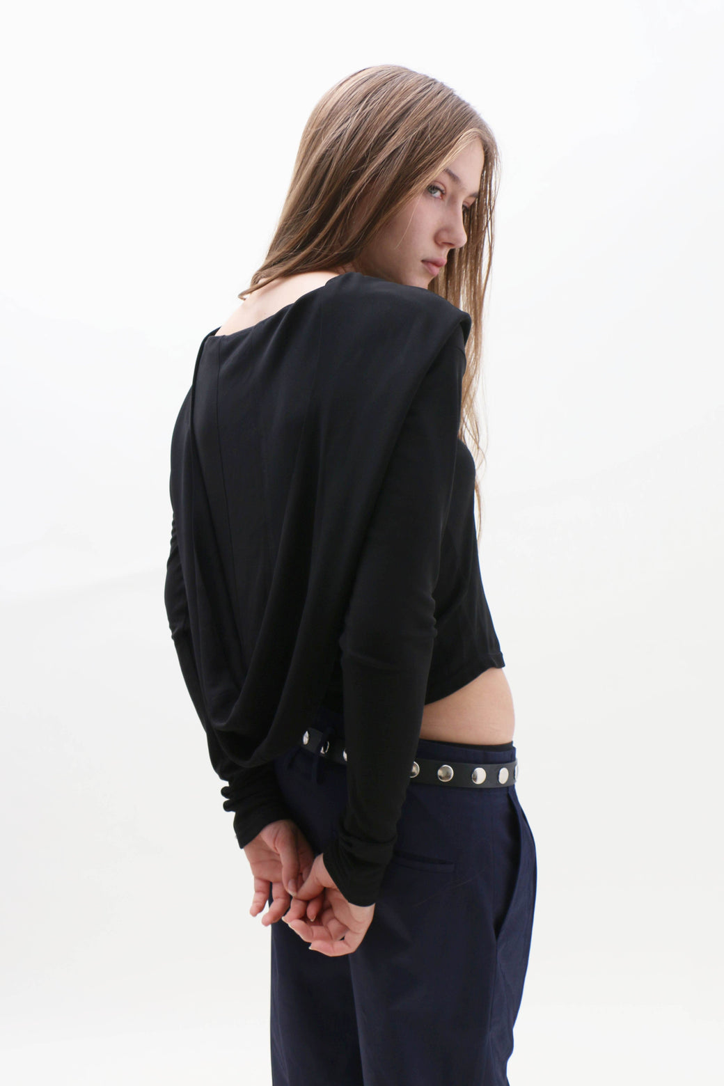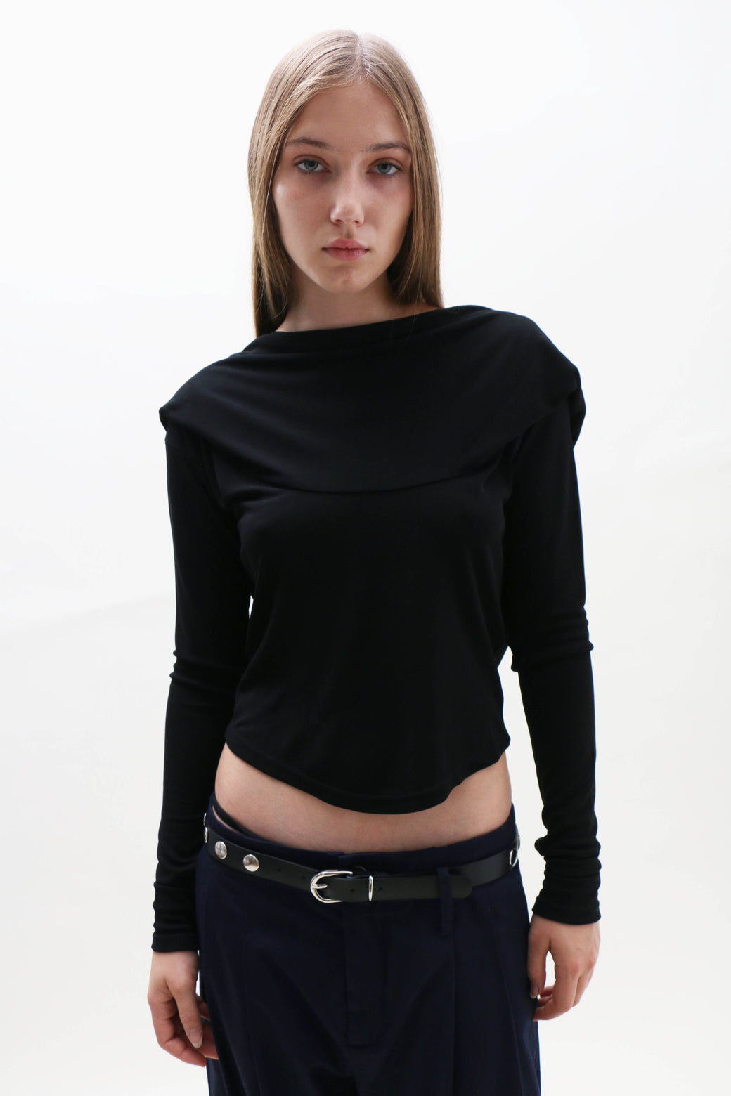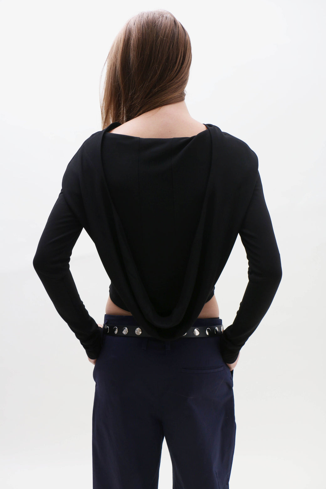 Black Italian stretch viscose jersey cut in a slim silhouette. Features a convertible neckline that shifts from a hooded cowl to an off-the-shoulder drape, finished with long sleeves and a slightly cropped length that sits at the hipbone.
