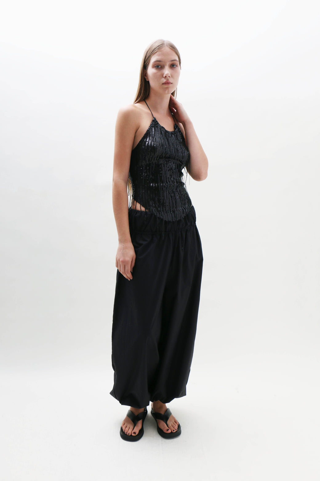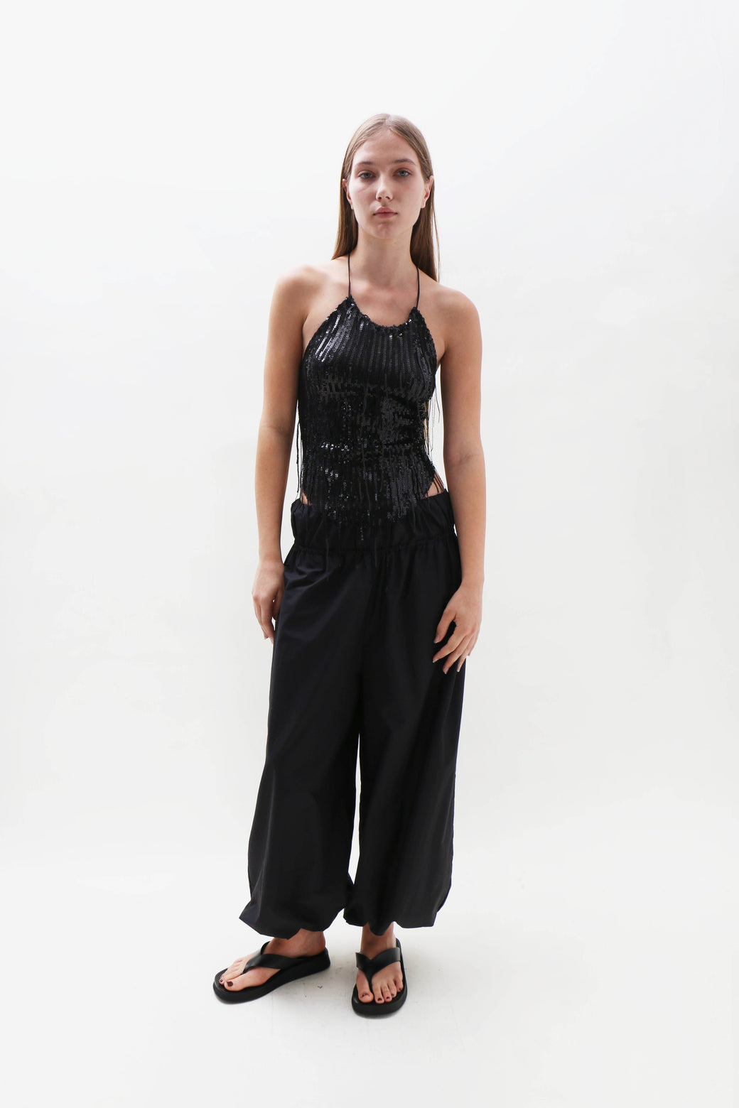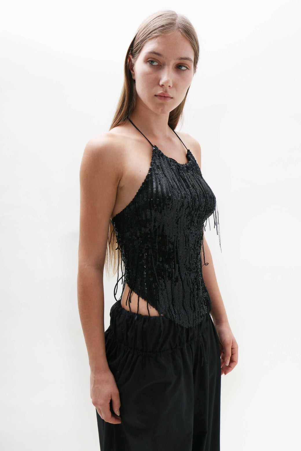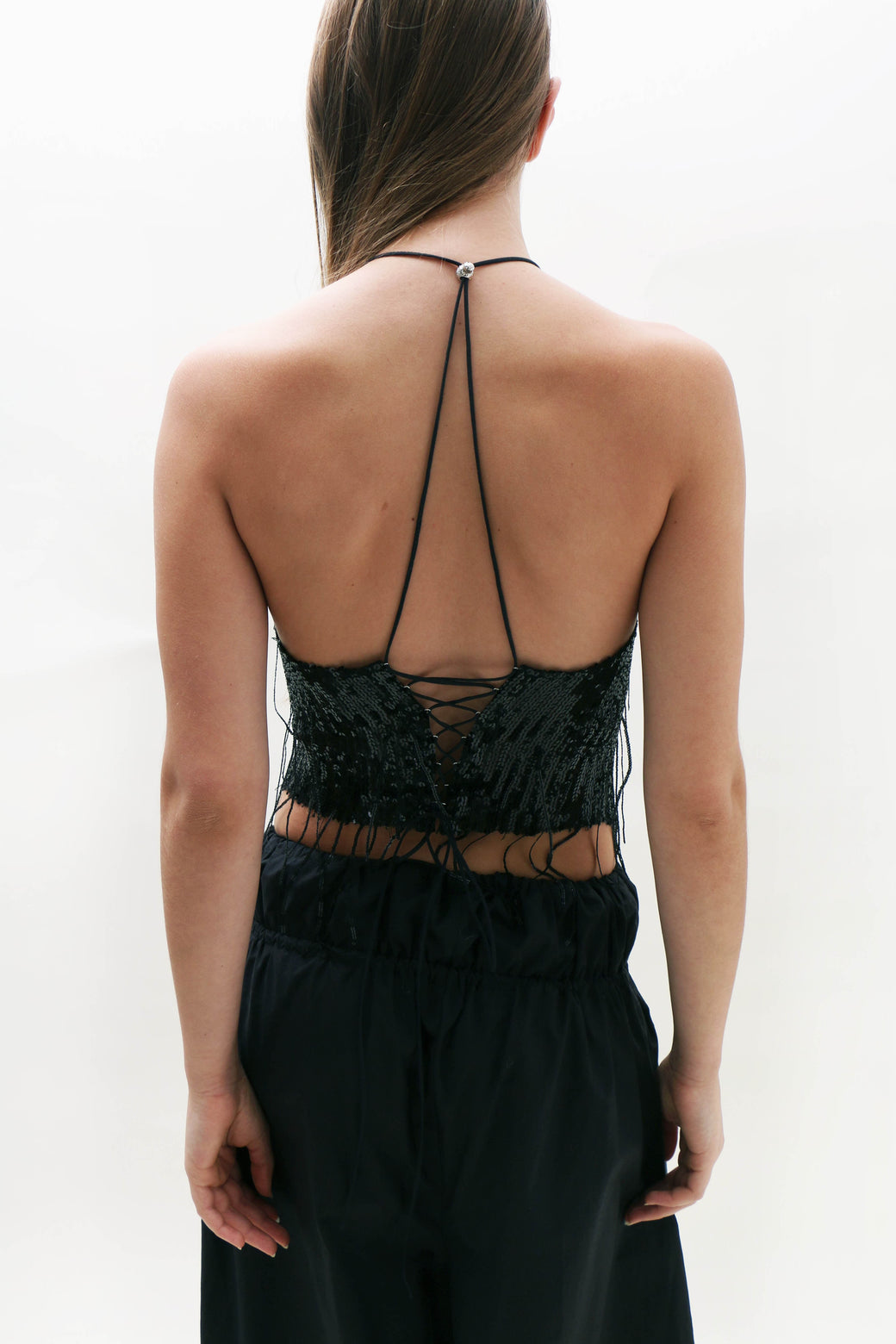 Shimmering black sequin halter top with fringe detailing, cut on a sheer mesh base. Features a high scooped neckline and an adjustable lace-up back with a metal stopper bead. Designed with thin straps, a stretch contouring fit, and a high-low rounded hem.