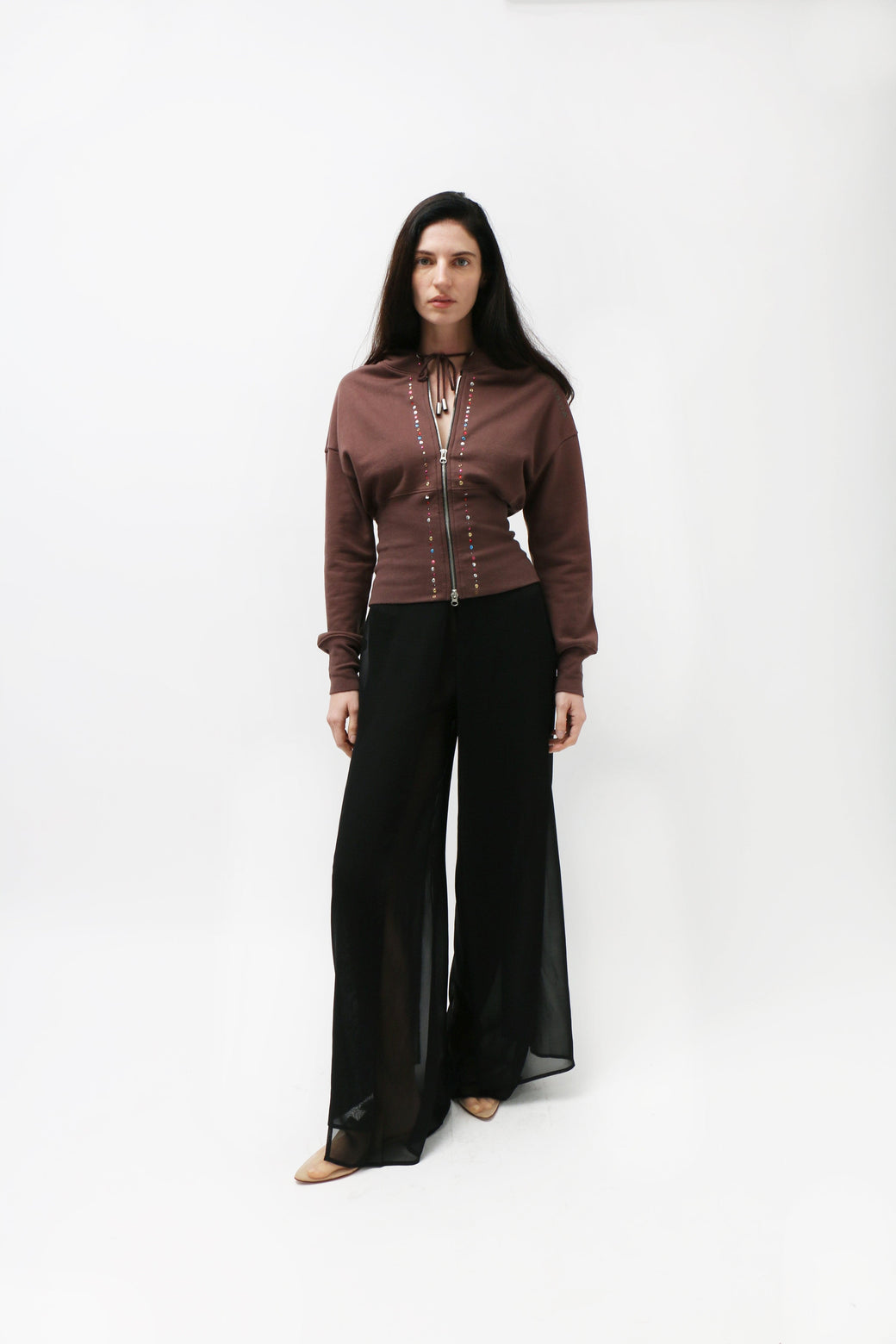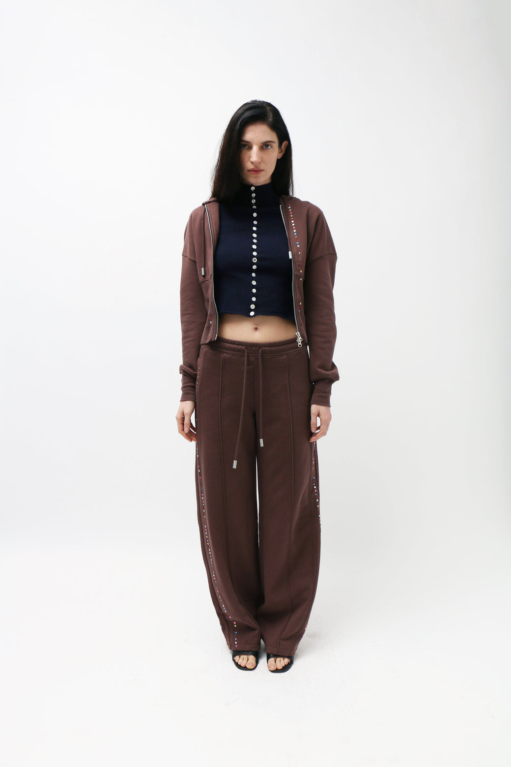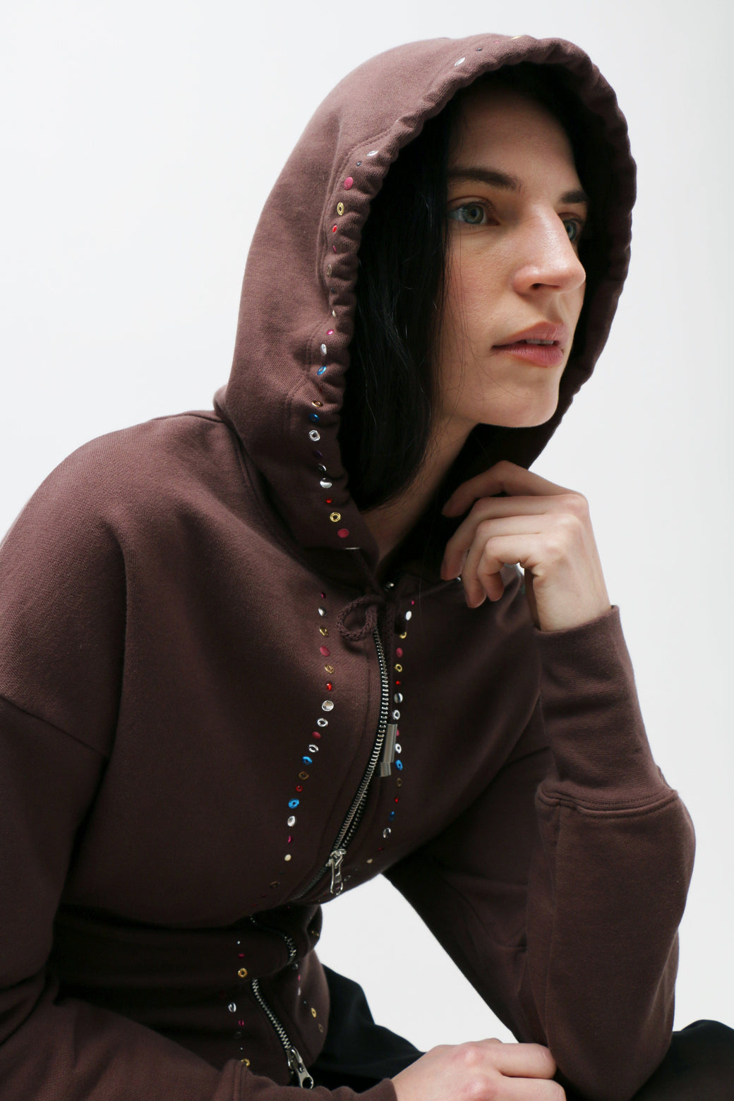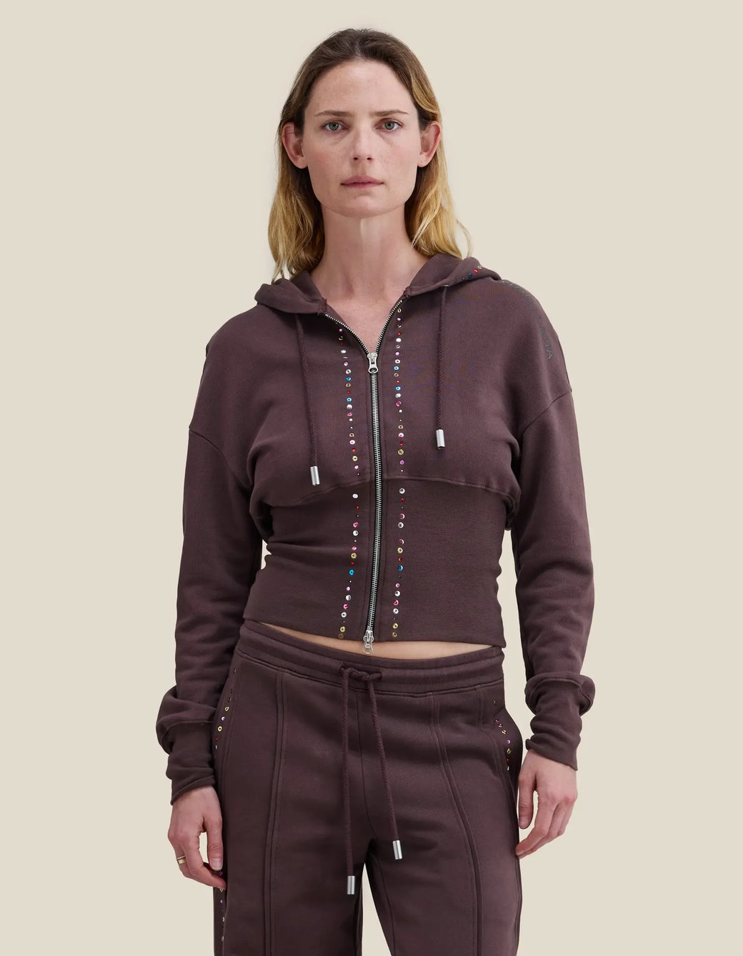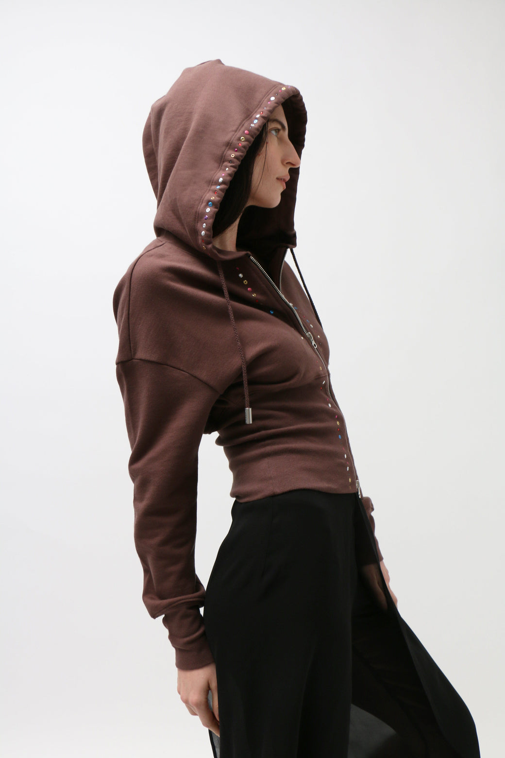 Made from brushed French terry, this piece features a fitted ribbed hem that cinches the waist. Garment-dyed brown and detailed with metallic jewels across the center front and hood, completed with a glossy brown shoulder logo.