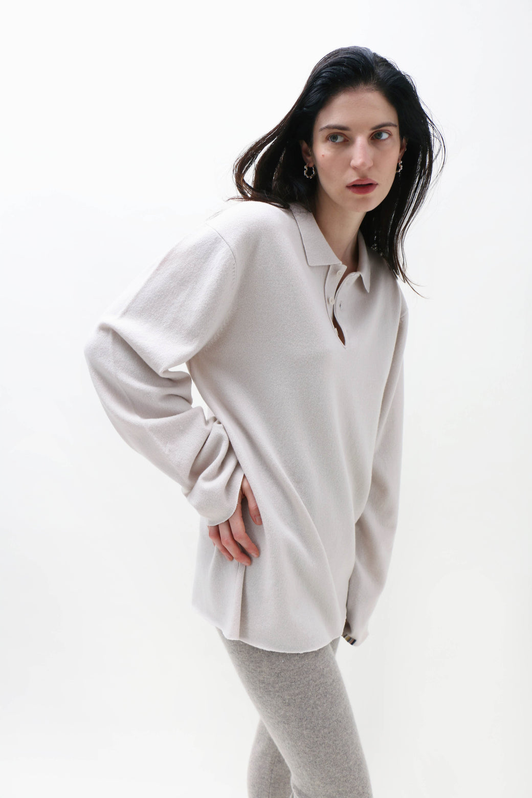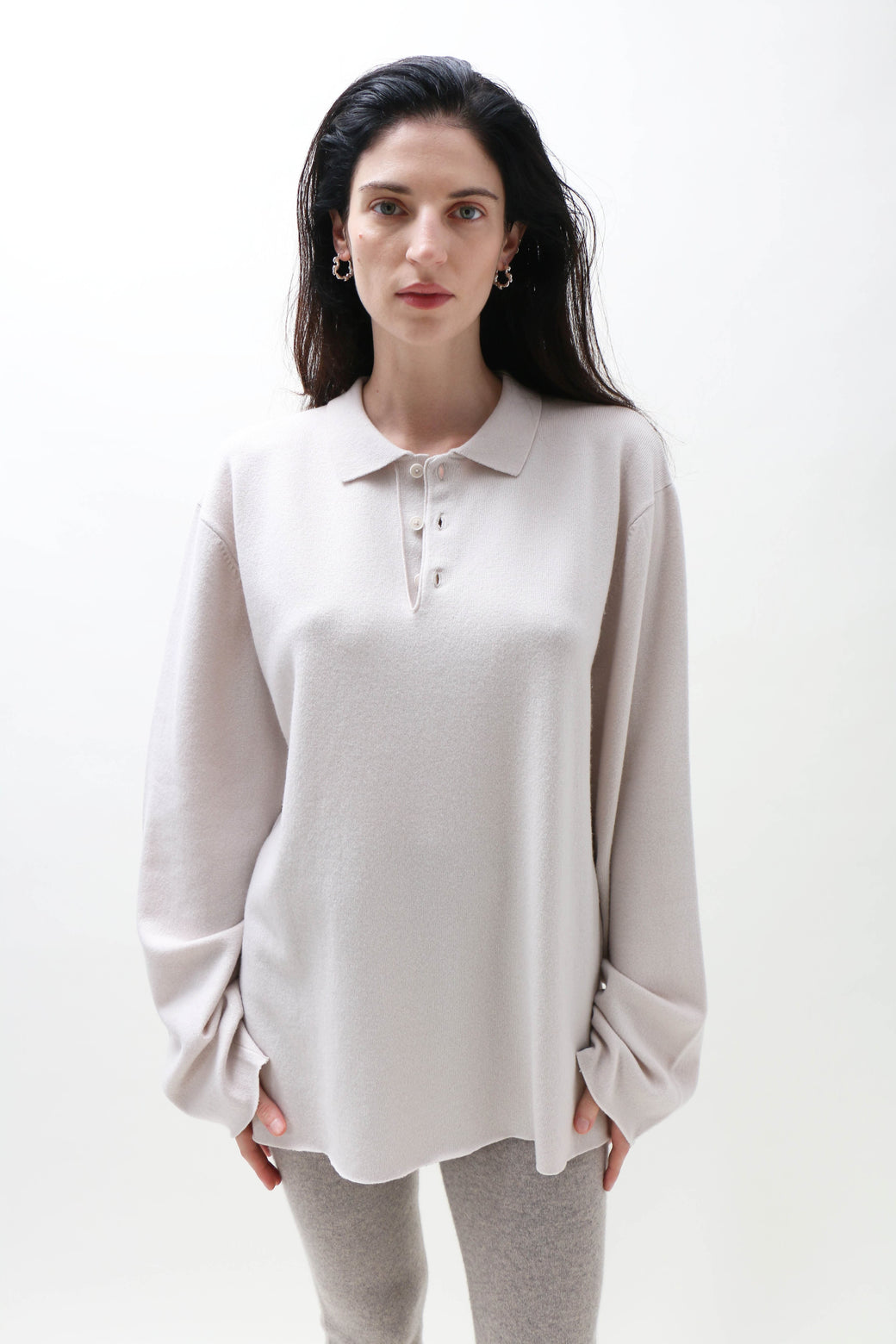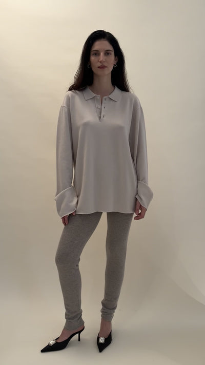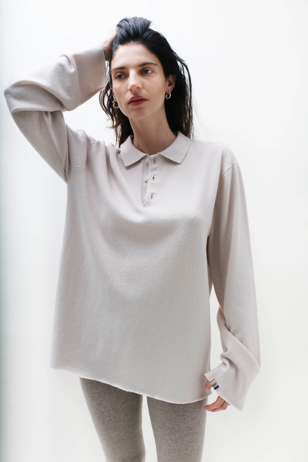Unisex, one size. A modern take on a polo sweater in cozy cashmere. Featuring extra-long sleeves, it references classic sportswear with raw-cut cuffs. Three corozo buttons complete the look.