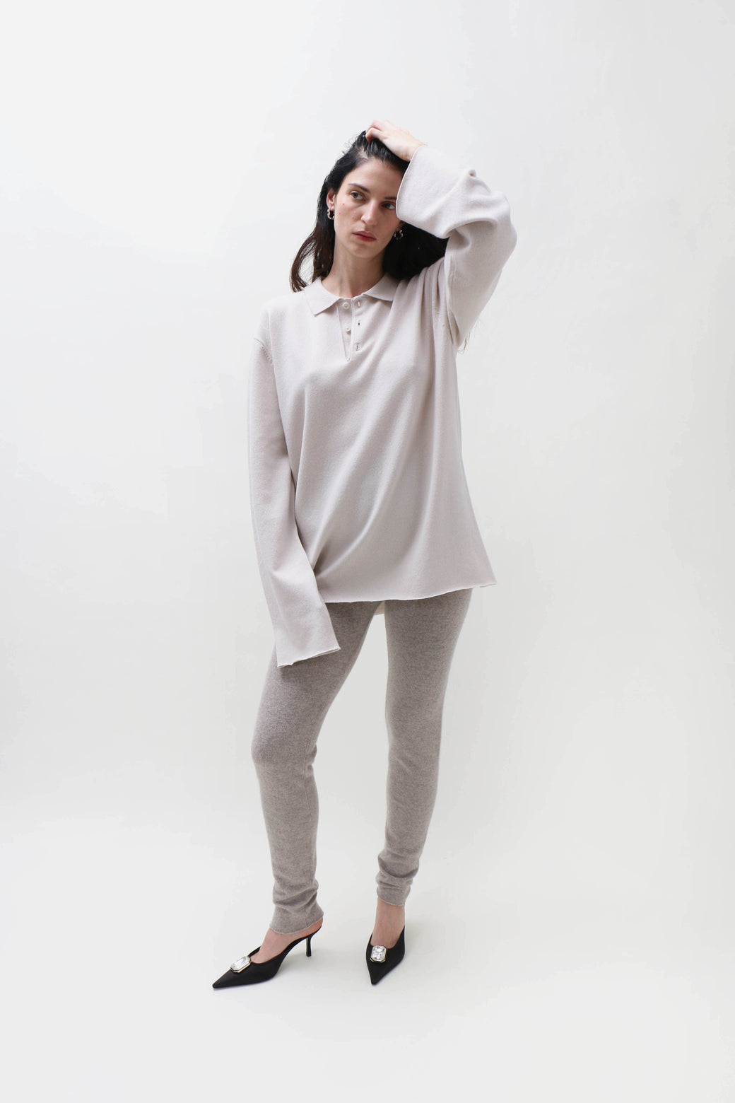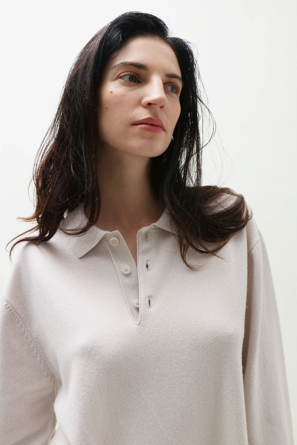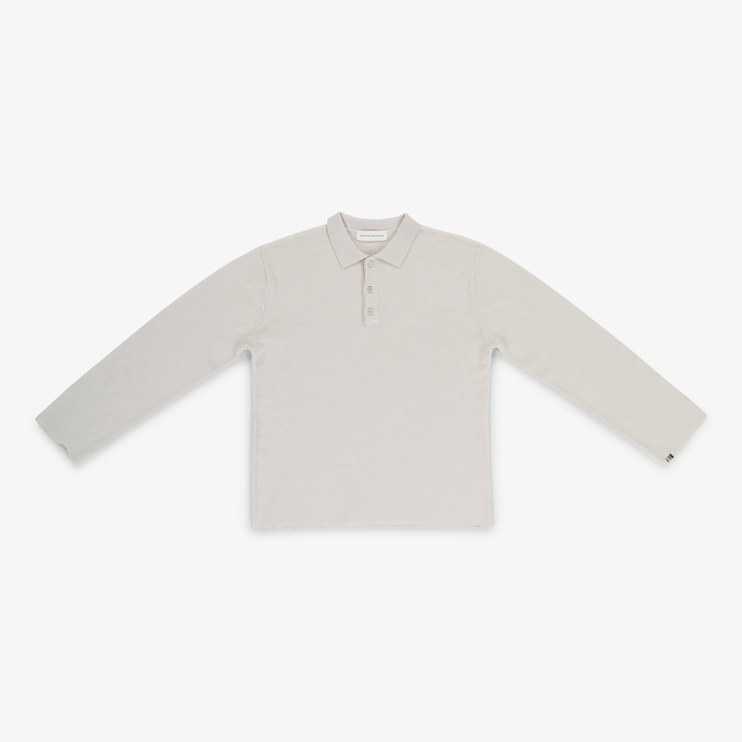 Unisex, one size. A modern take on a polo sweater in cozy cashmere. Featuring extra-long sleeves, it references classic sportswear with raw-cut cuffs. Three corozo buttons complete the look.