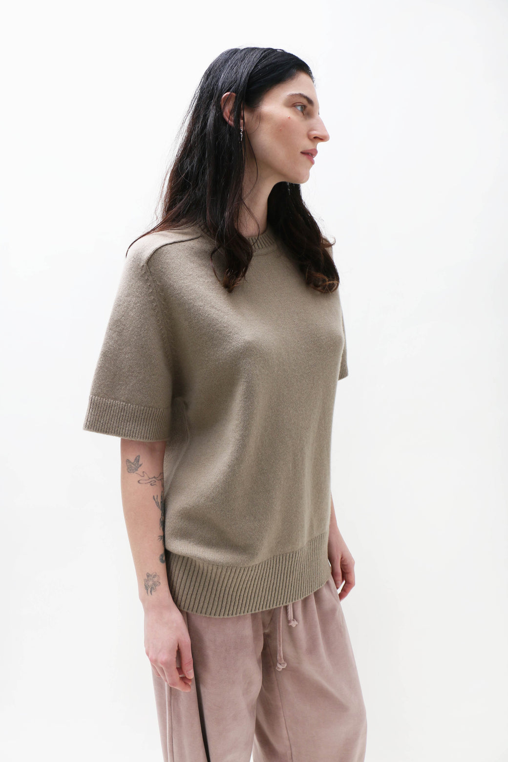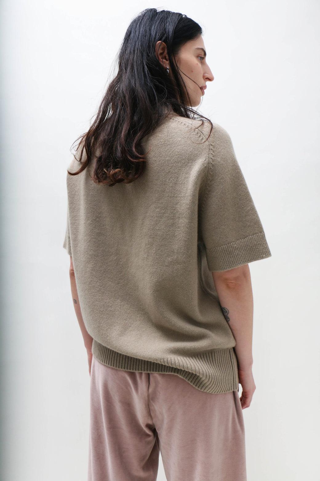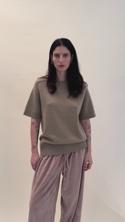 Unisex, one size. Short-sleeve cashmere sweater with a softly rolled neckline. Rib detailing at the neck, hem, and cuffs anchors the silhouette, while raglan sleeves add a subtle sculptural line. Cut in a straight fit from a medium-weight cashmere, offering an easy piece for layering.