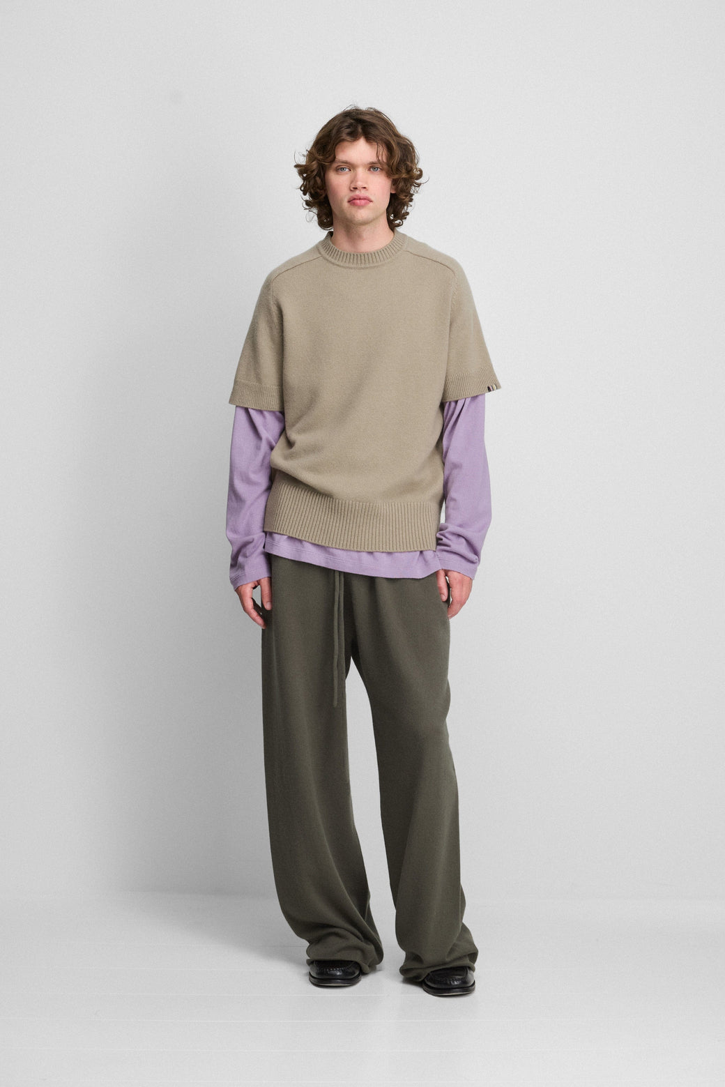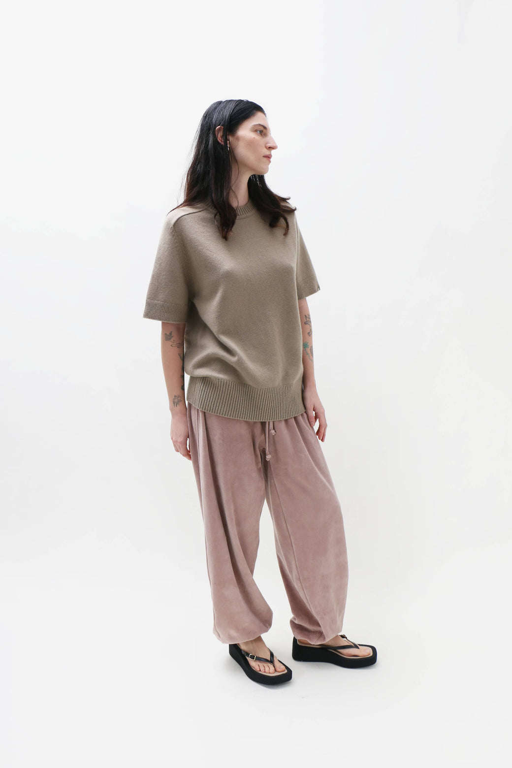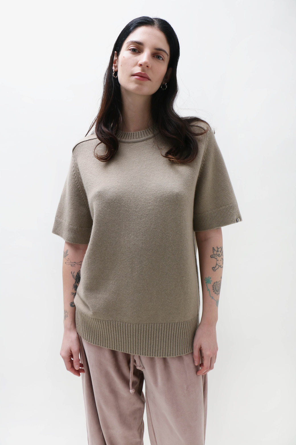 Unisex, one size. Short-sleeve cashmere sweater with a softly rolled neckline. Rib detailing at the neck, hem, and cuffs anchors the silhouette, while raglan sleeves add a subtle sculptural line. Cut in a straight fit from a medium-weight cashmere, offering an easy piece for layering.