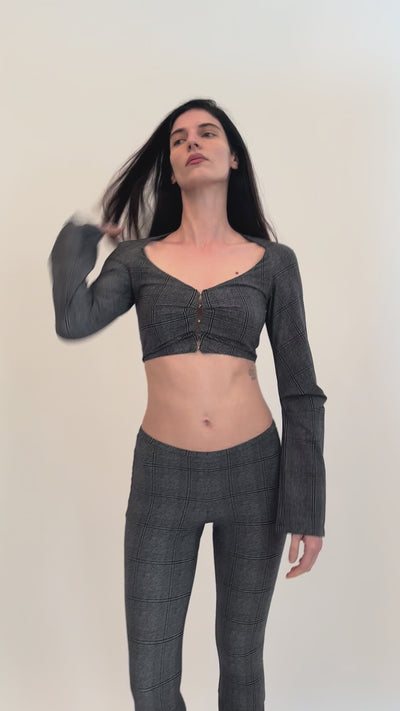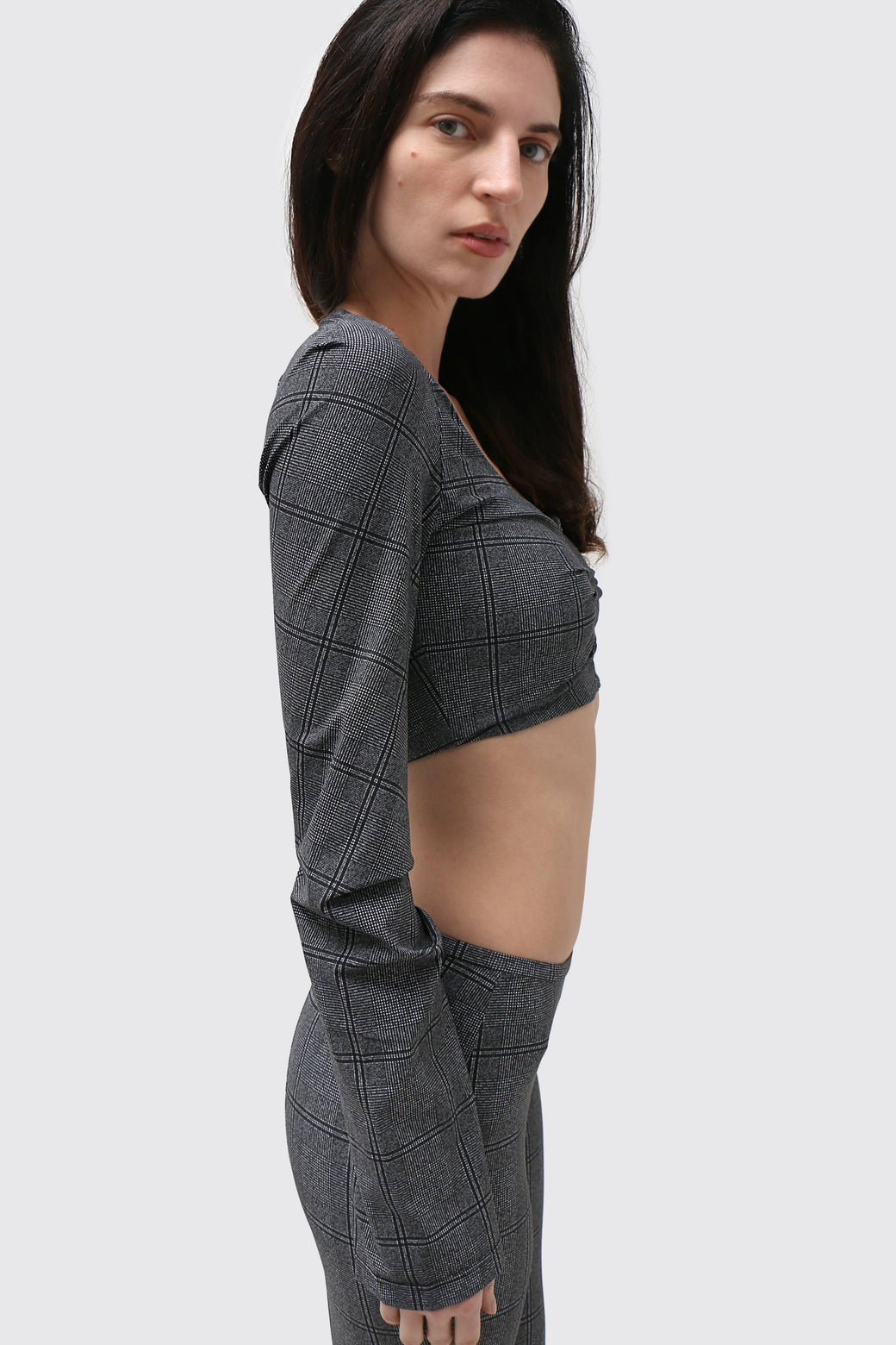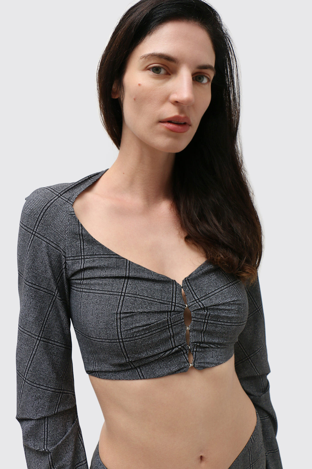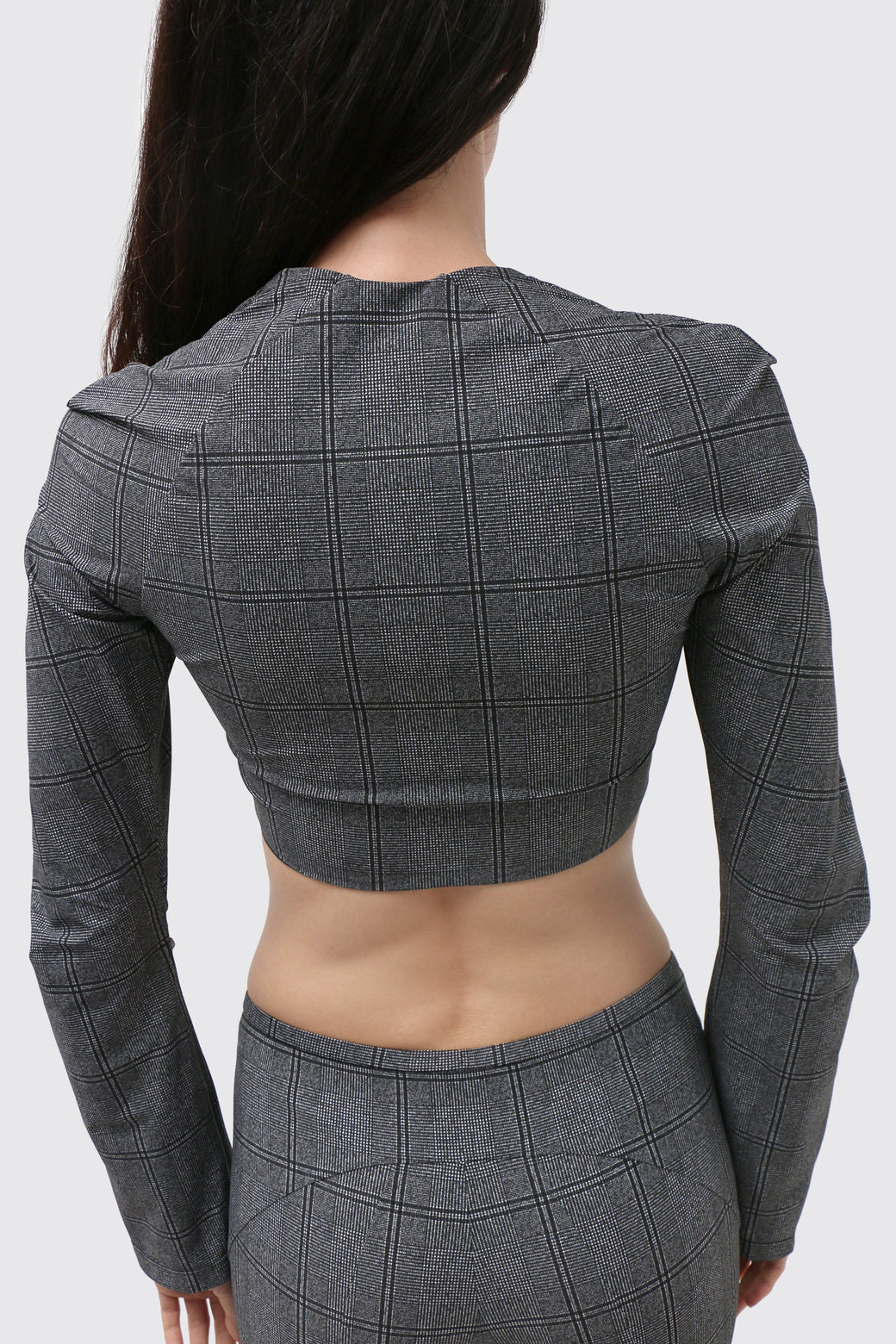 Cropped bolero in glen check technical jersey. Designed with an open neckline and sculpted raglan sleeves, featuring pleat detailing at the front and sleeves to create subtle structure and shape. Finished with hook-and-eye closures and cut to sit just above the waist.
