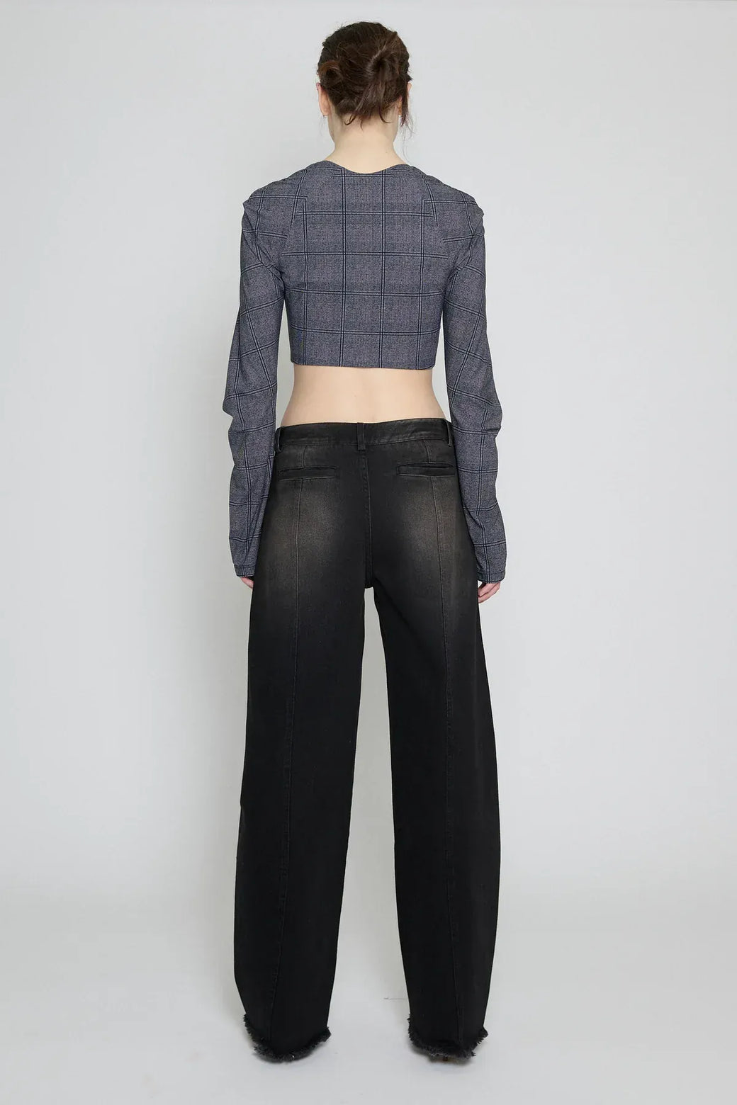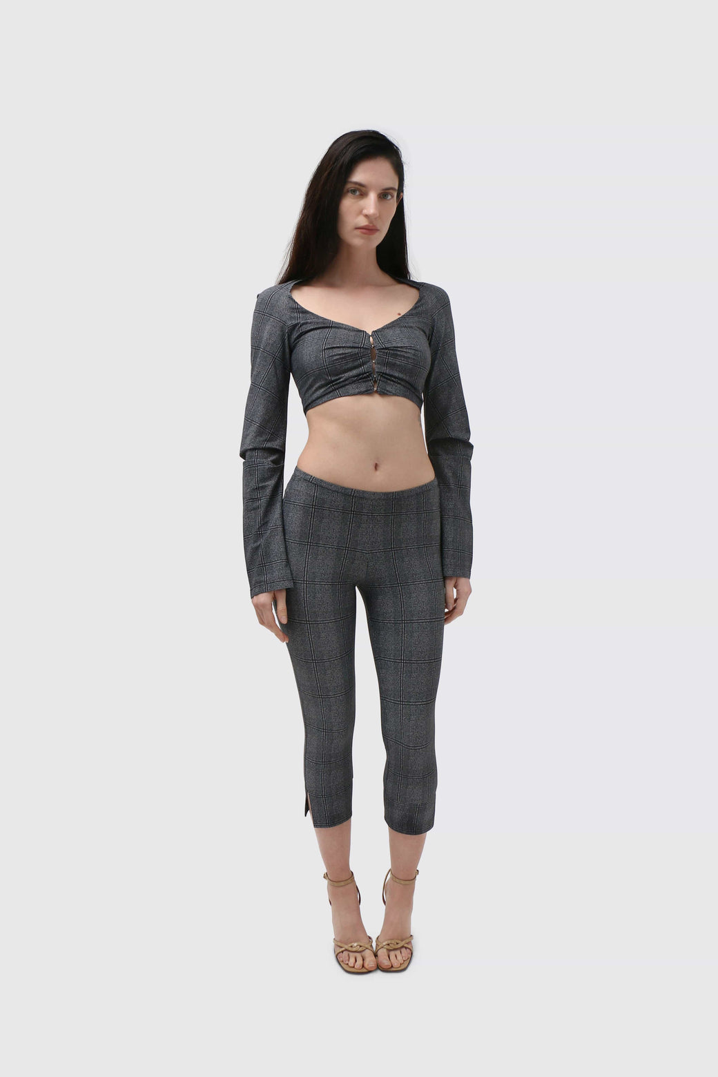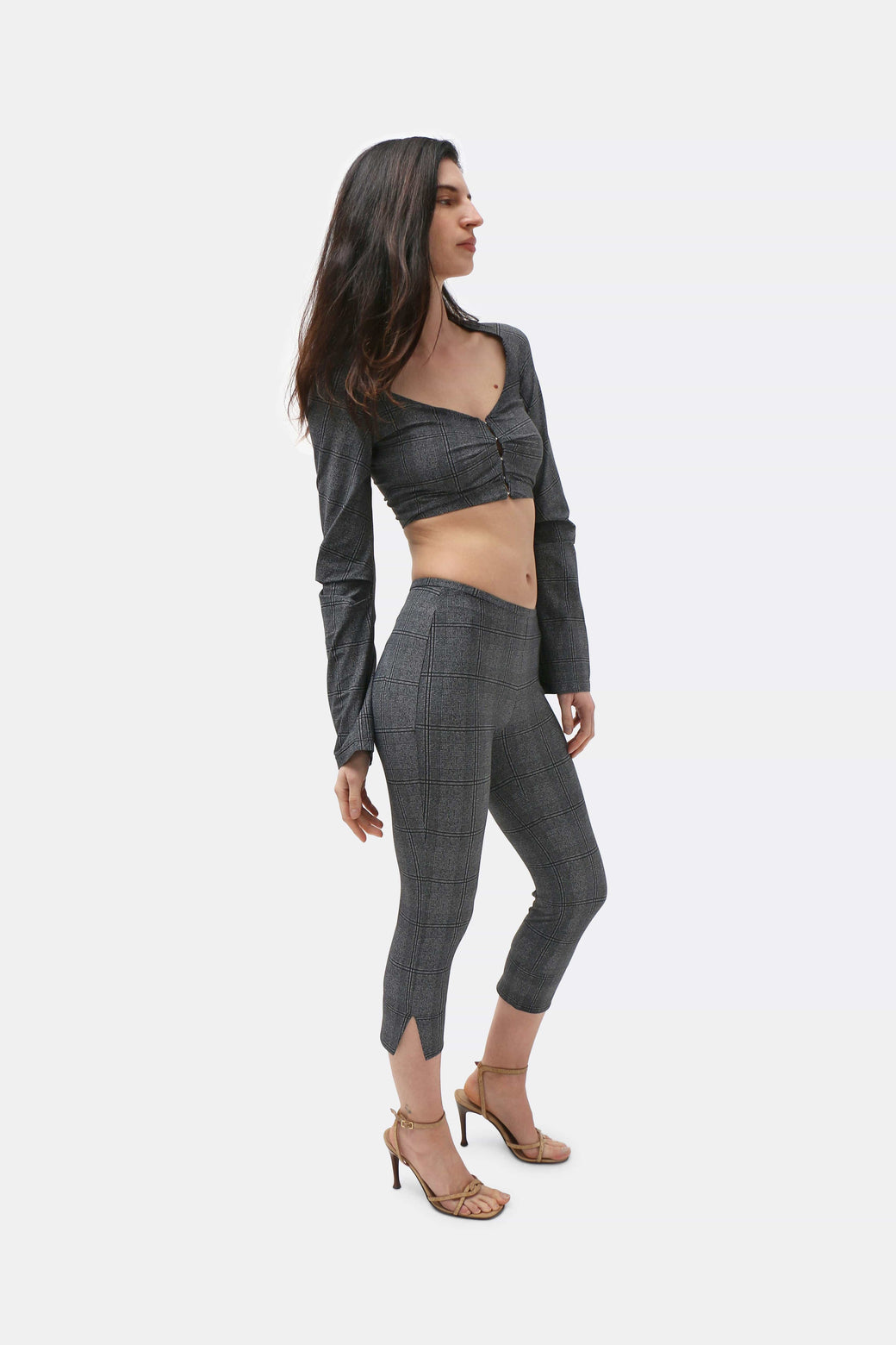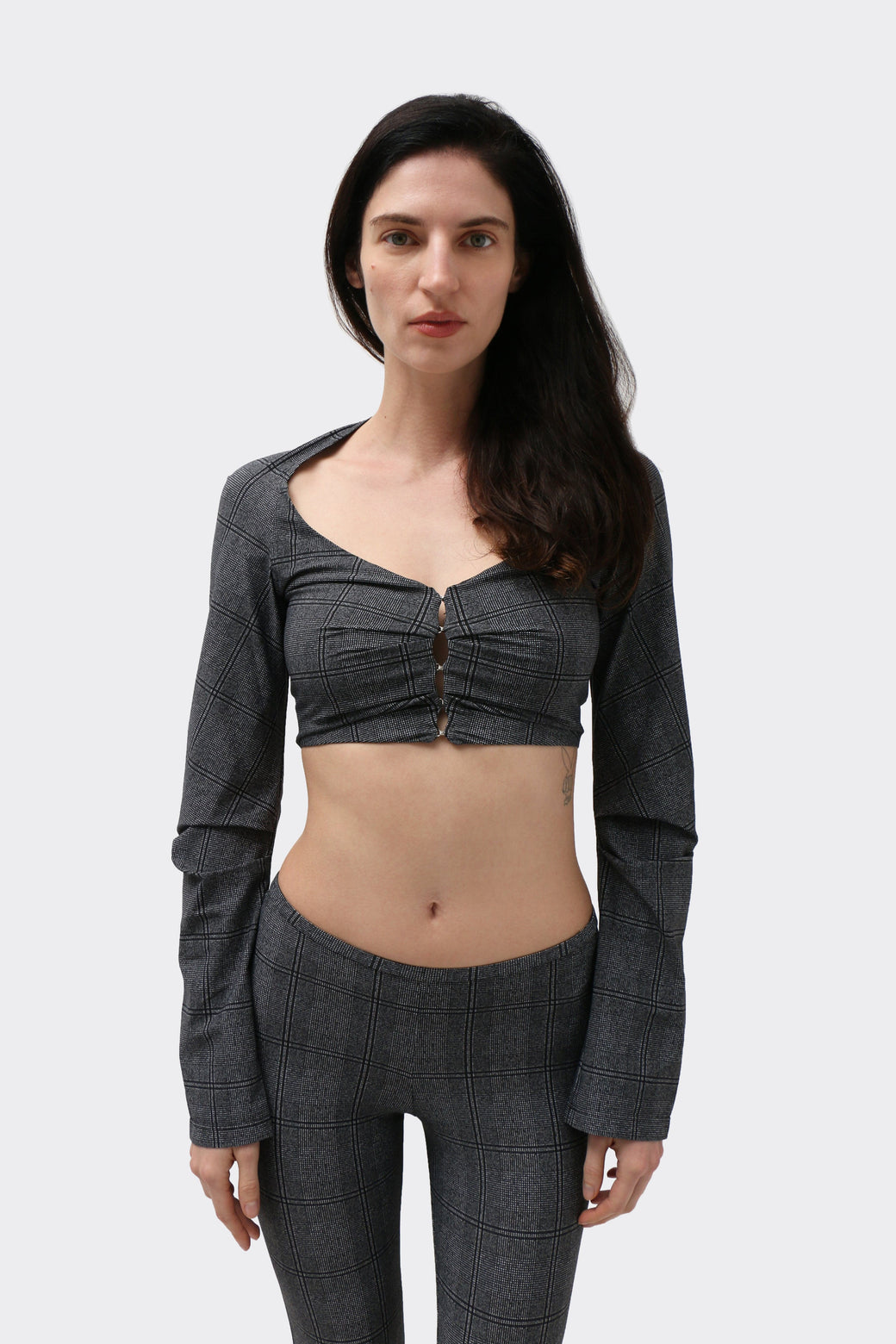 Cropped bolero in glen check technical jersey. Designed with an open neckline and sculpted raglan sleeves, featuring pleat detailing at the front and sleeves to create subtle structure and shape. Finished with hook-and-eye closures and cut to sit just above the waist.
