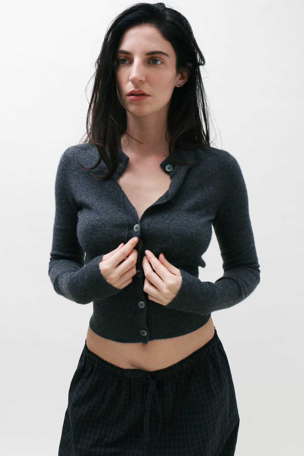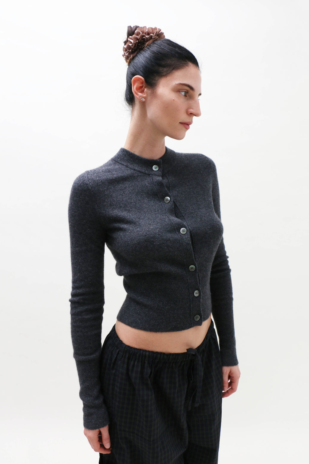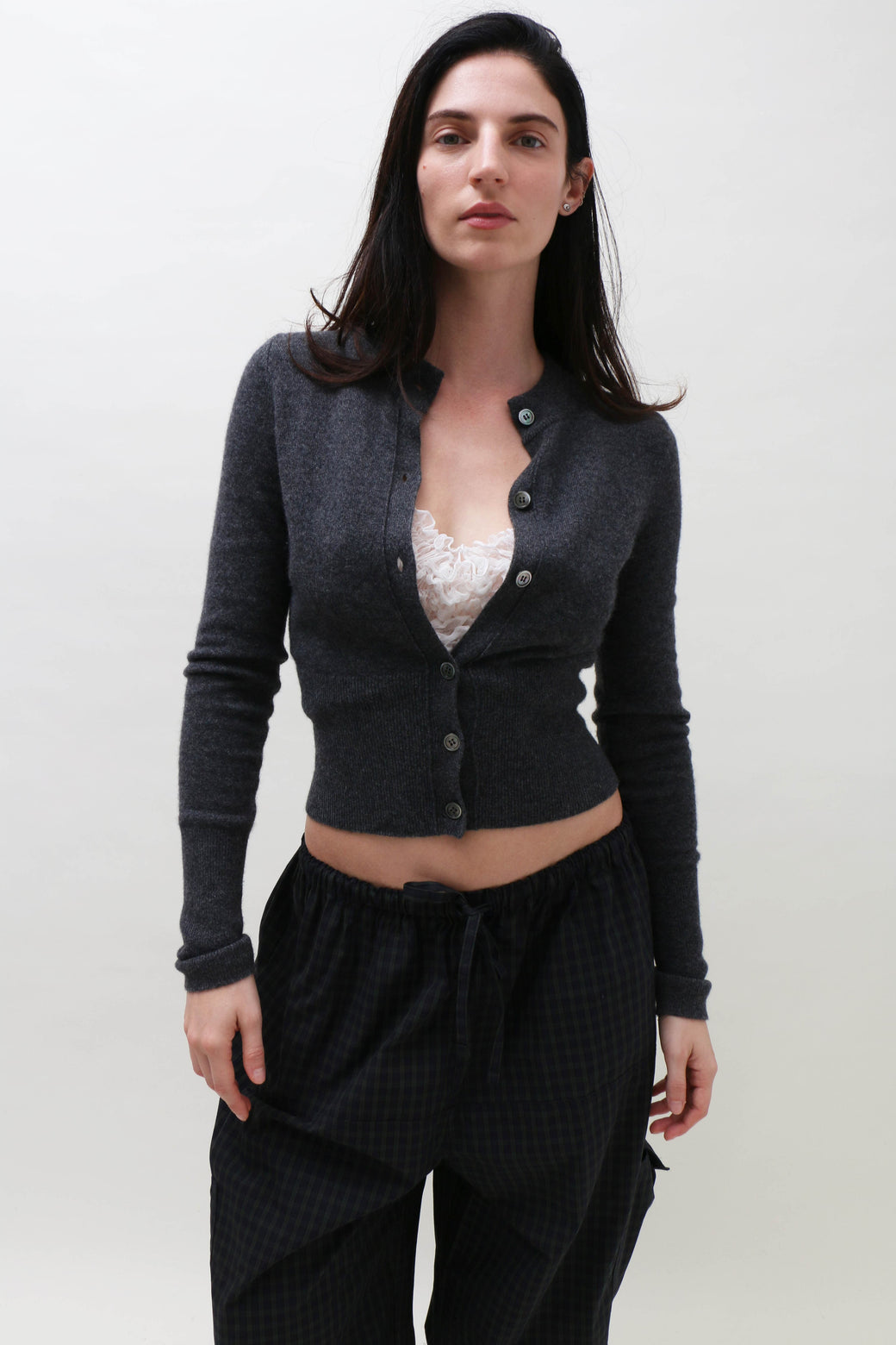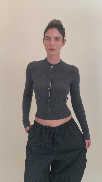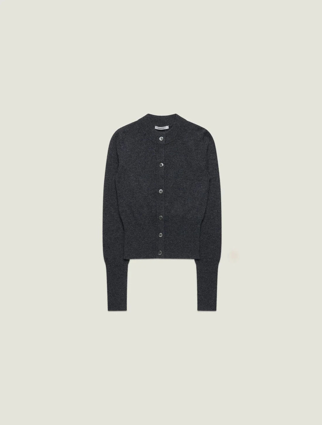 Cashmere cardigan with elongated ribbed cuffs and waistband, featuring a button-front closure.