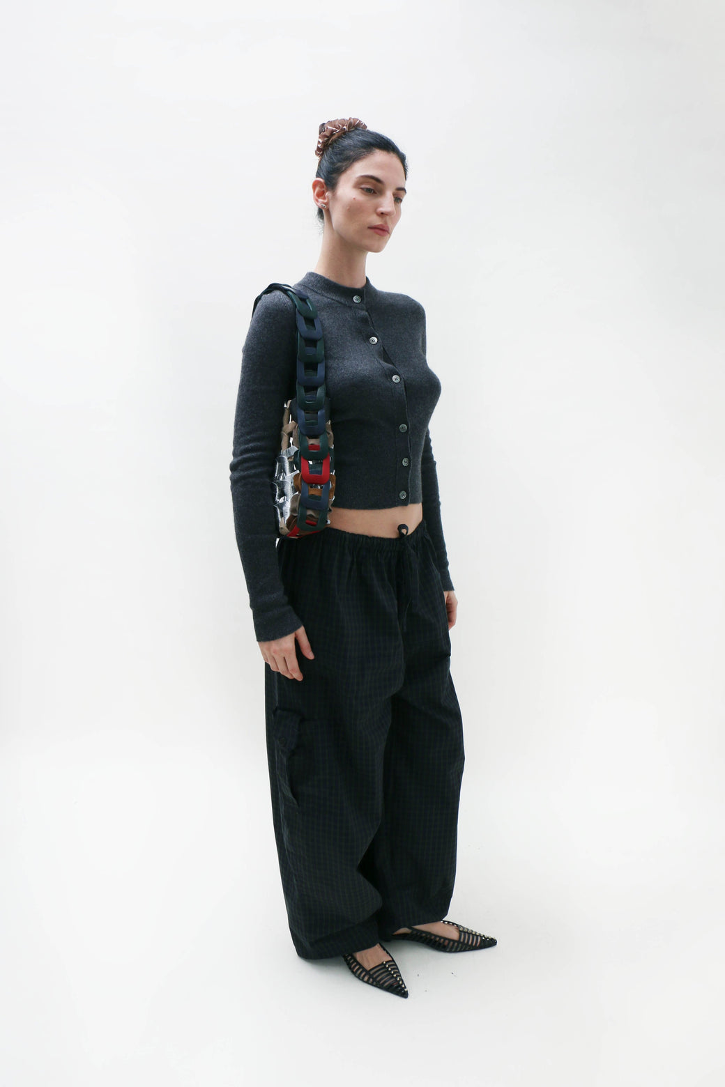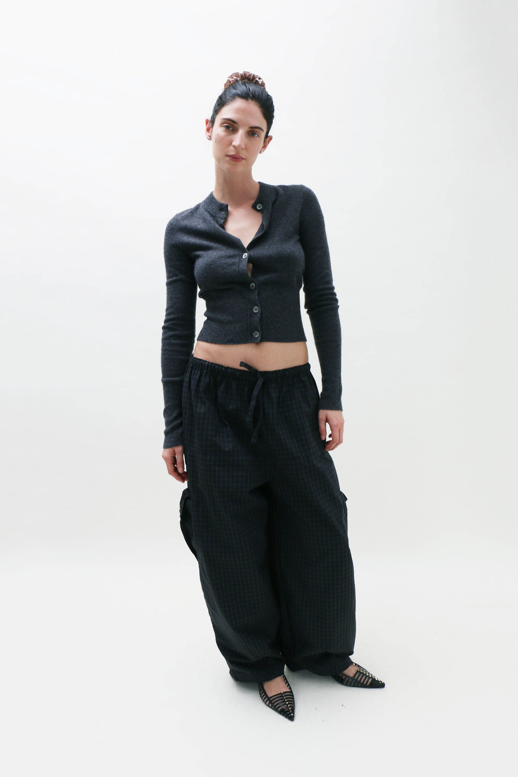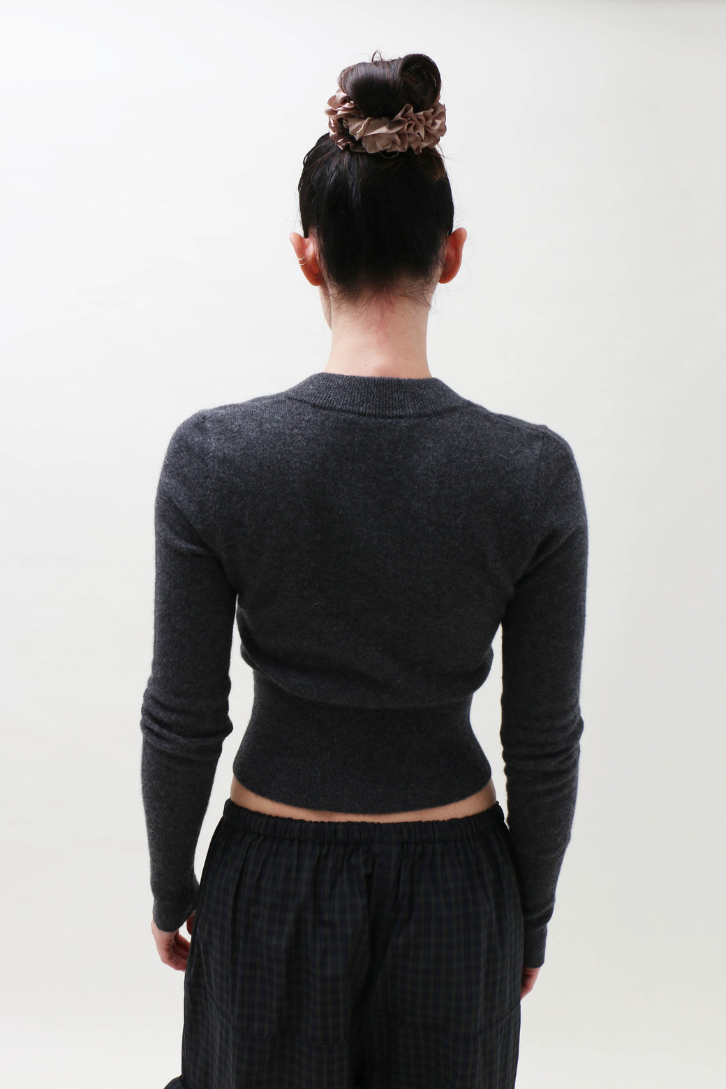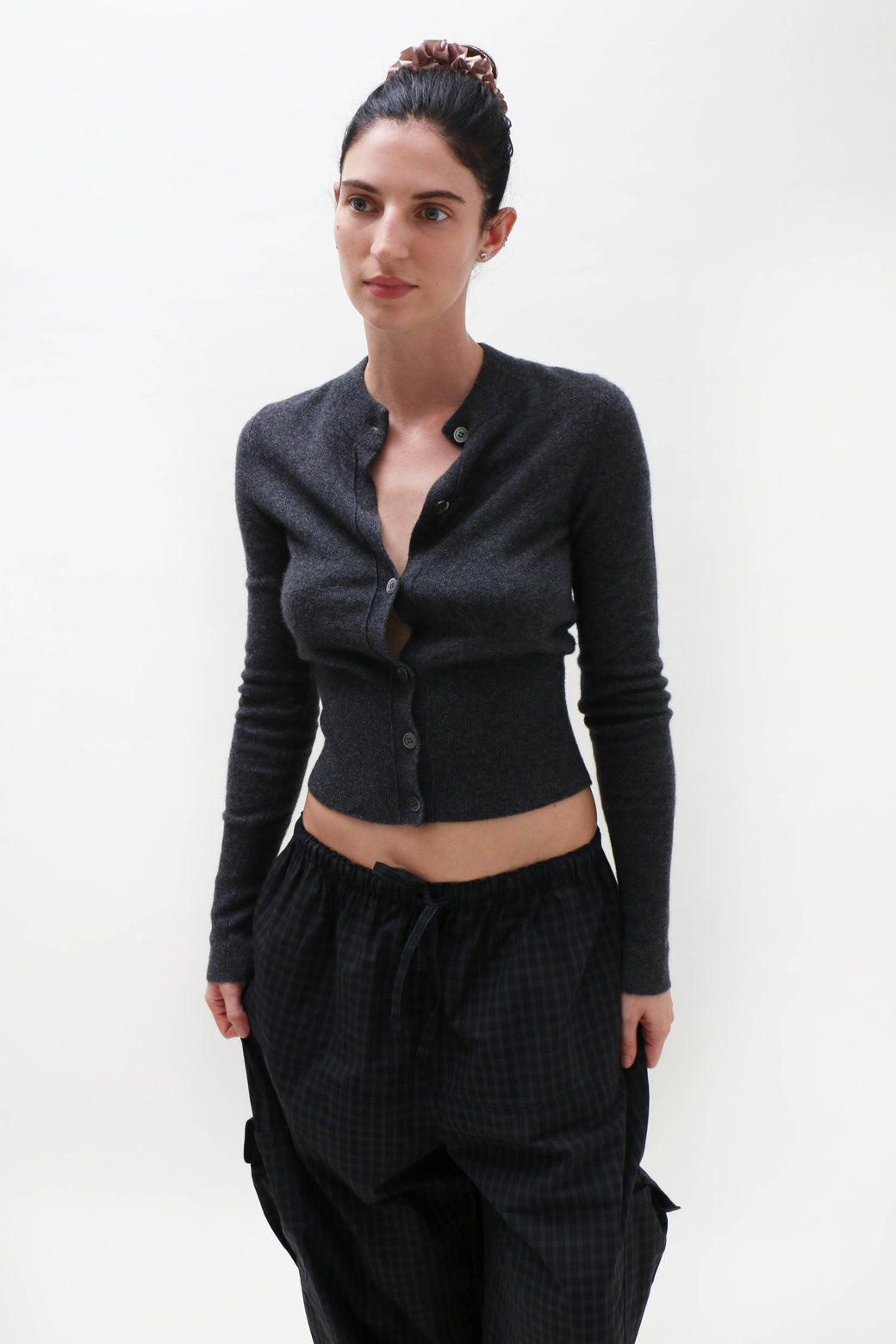 Cashmere cardigan with elongated ribbed cuffs and waistband, featuring a button-front closure.