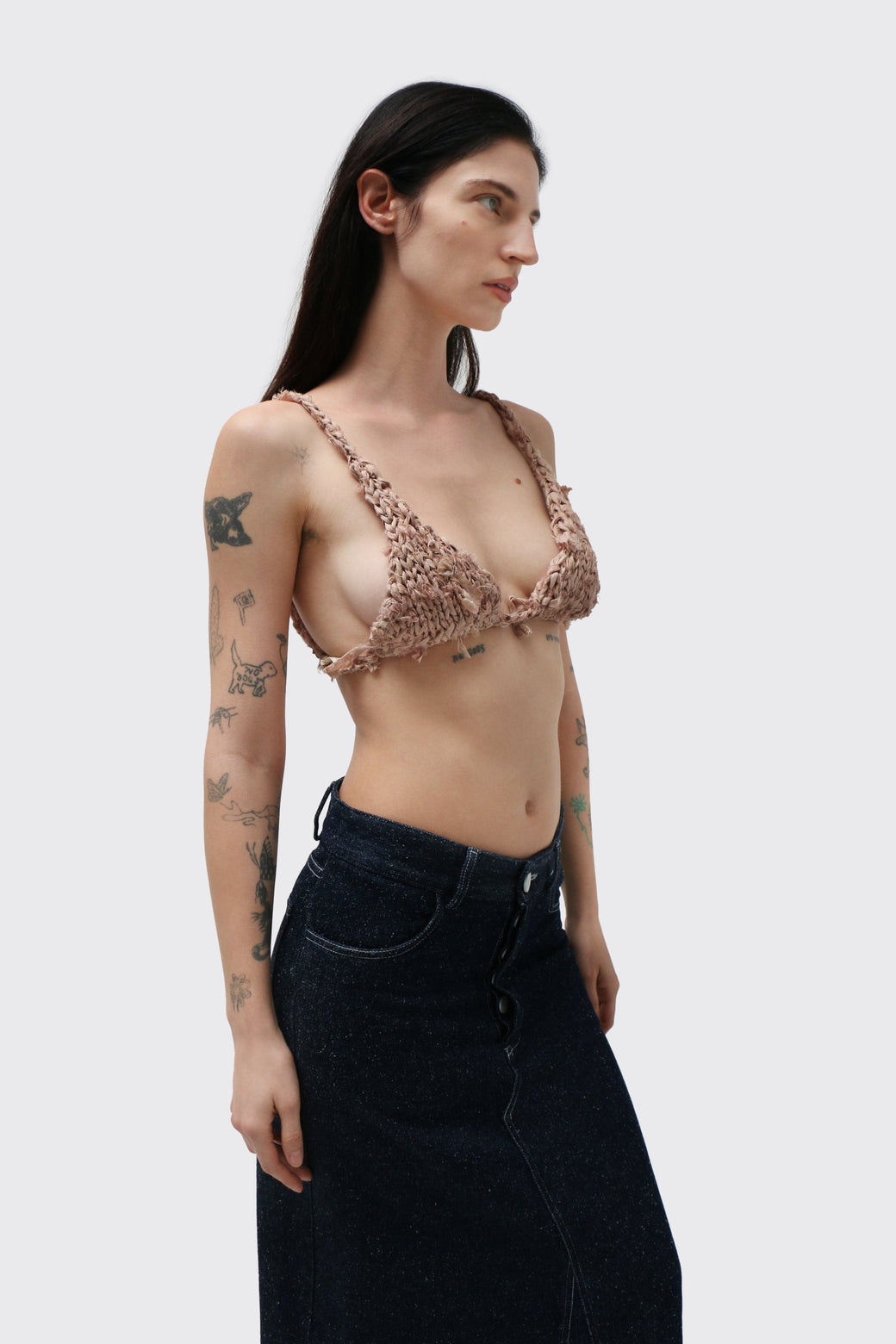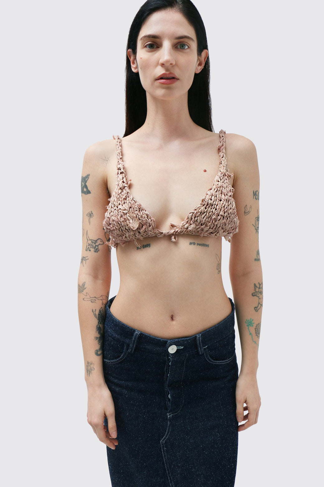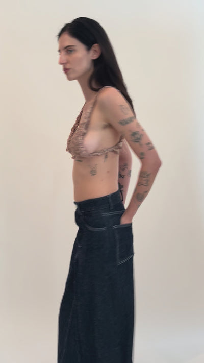 Hand-knit triangle bra top in recycled beige silk, finished with subtle frayed detailing throughout. Each piece is one of a kind, with natural variations from the handmade process.