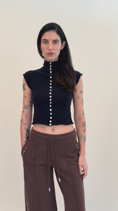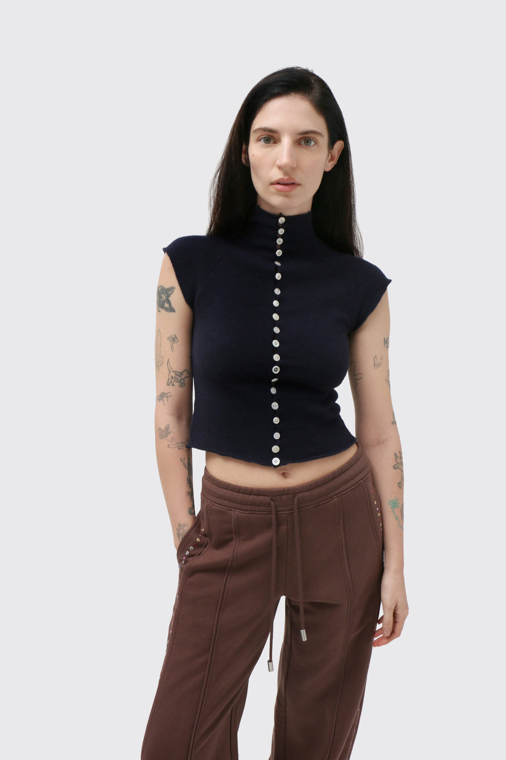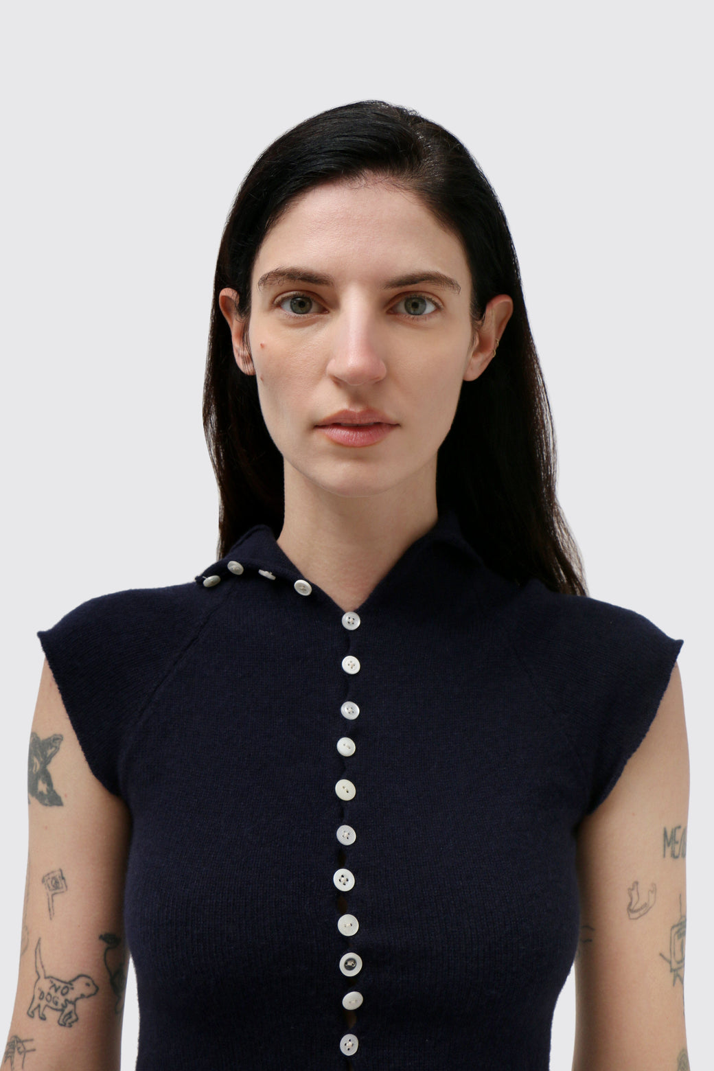 Hand-knit raglan button tee in navy wool, featuring a mini mock neck and vintage-sourced functional buttons along the front. Subtle variations may occur due to the handmade process.