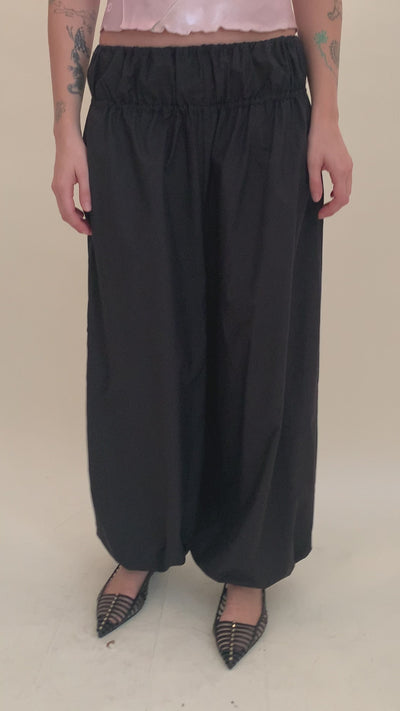 High-waisted black cotton poplin pants designed with a relaxed wide-leg fit. Featuring a drawstring closure and a double elasticated waistband.