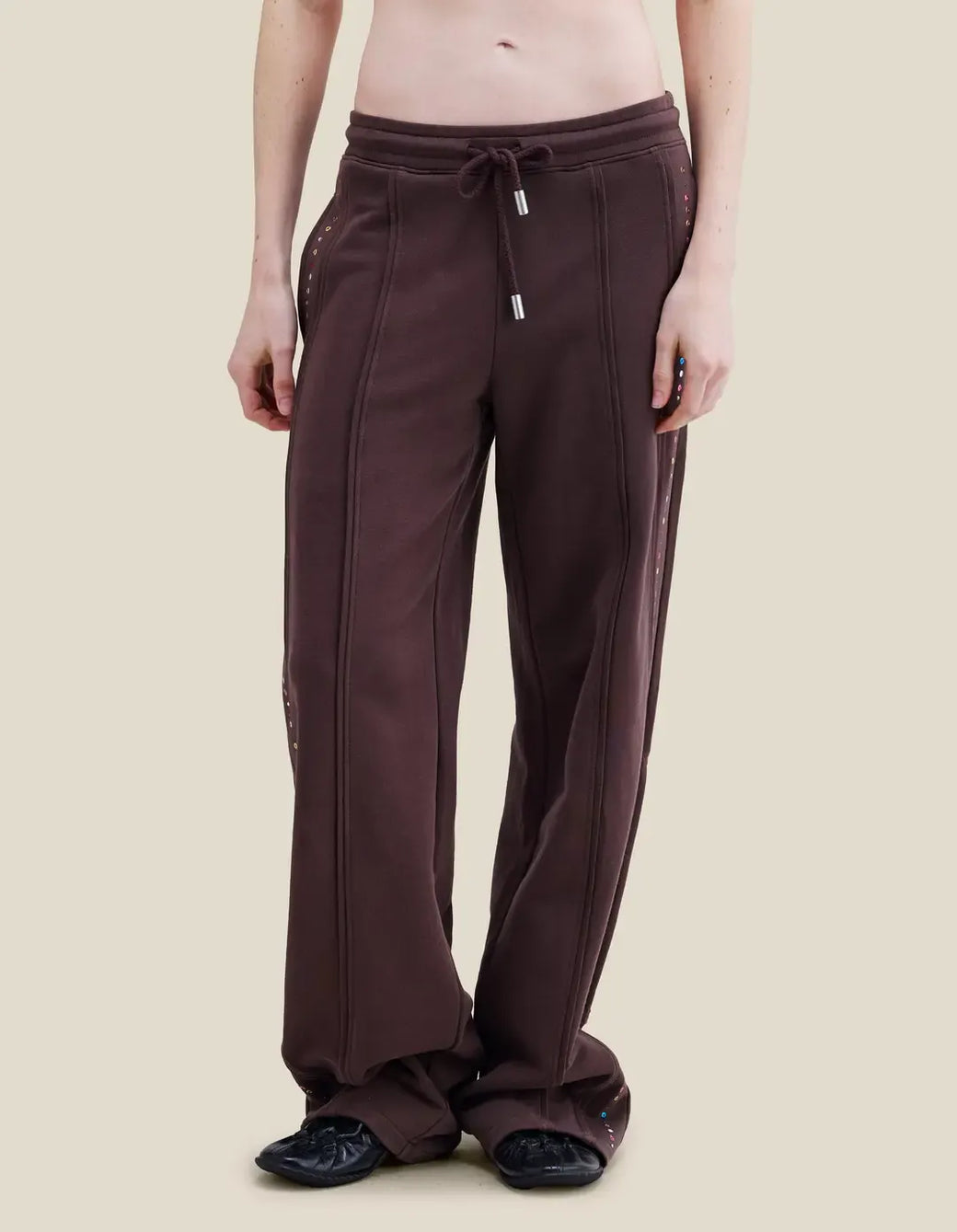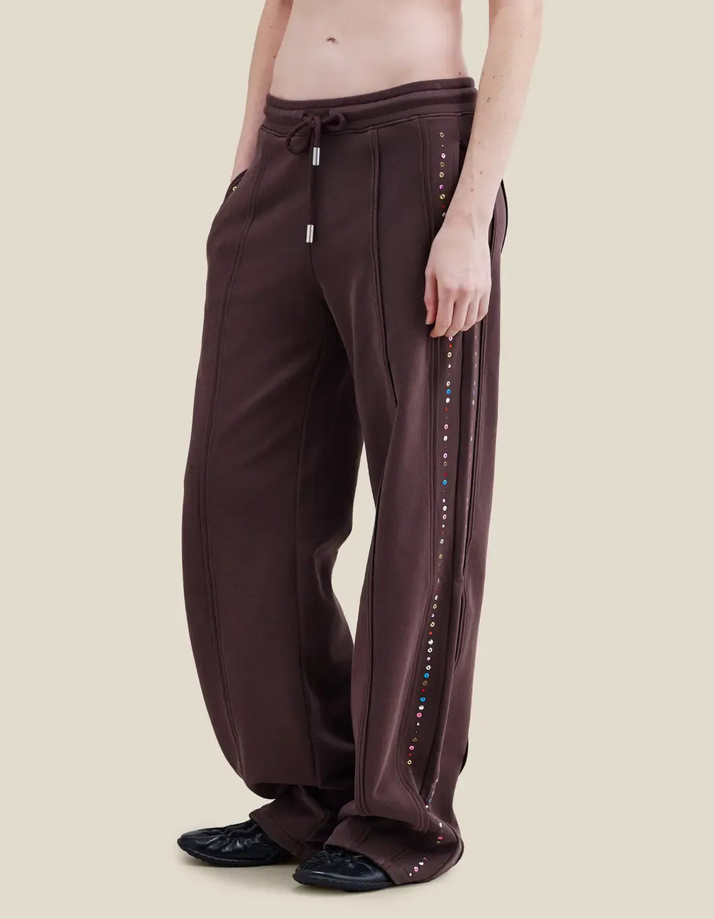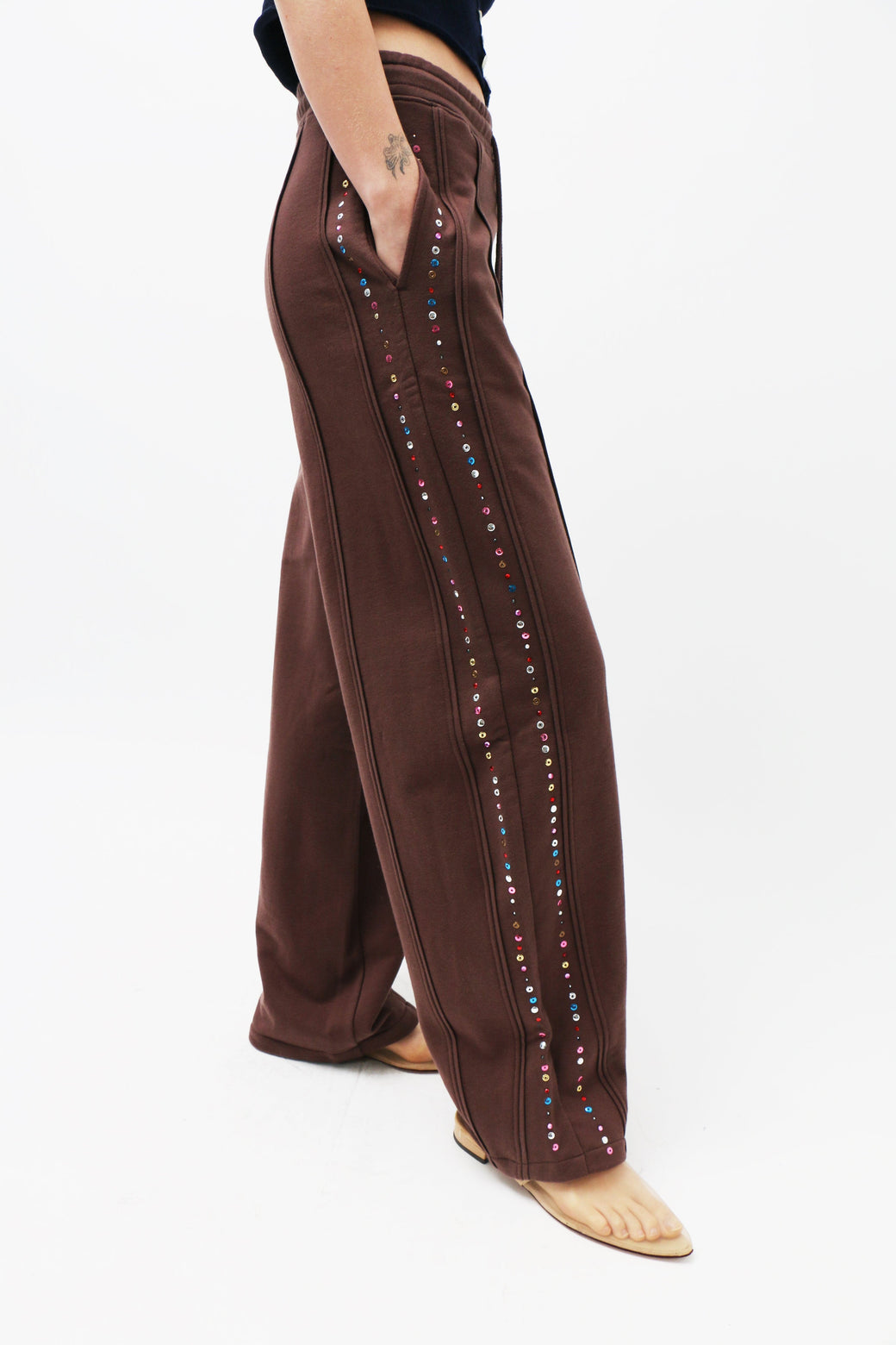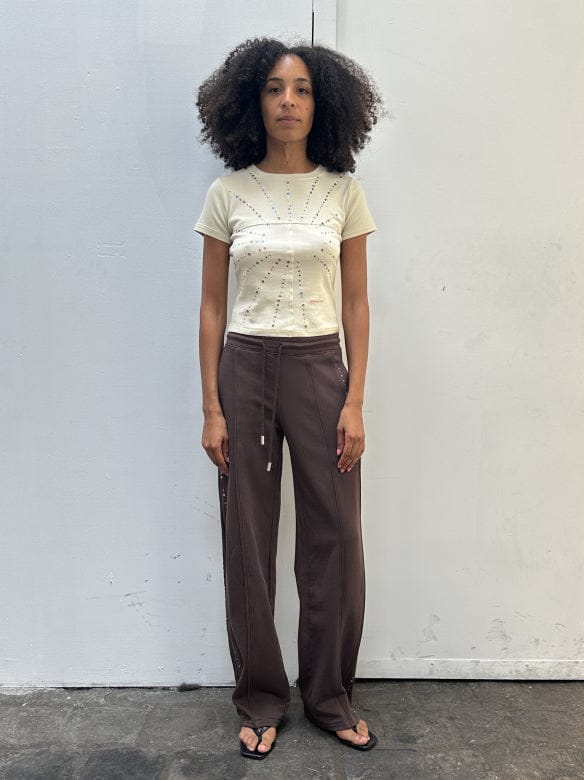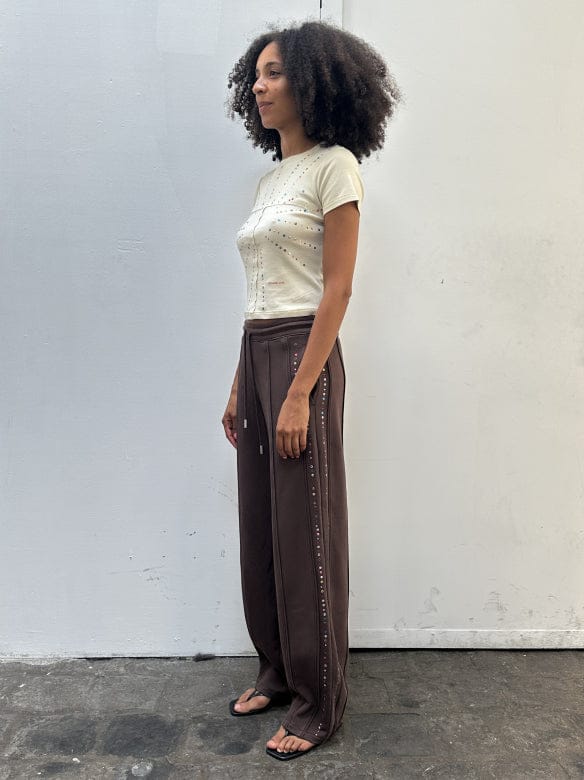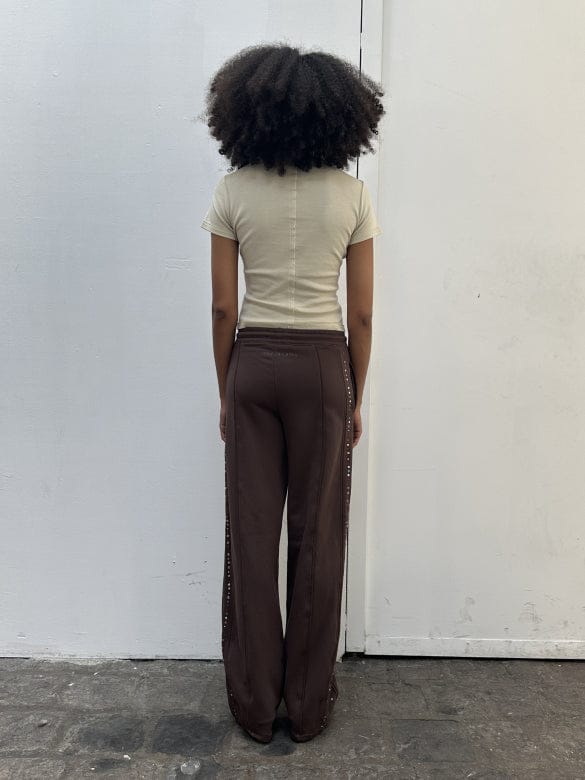 Wide-leg, mid-rise pants in brushed French terry, garment-dyed in a rich brown. Piped seams trace the silhouette, accented with metallic jewel embellishments along the sides. Finished with a glossy brown logo at the back.