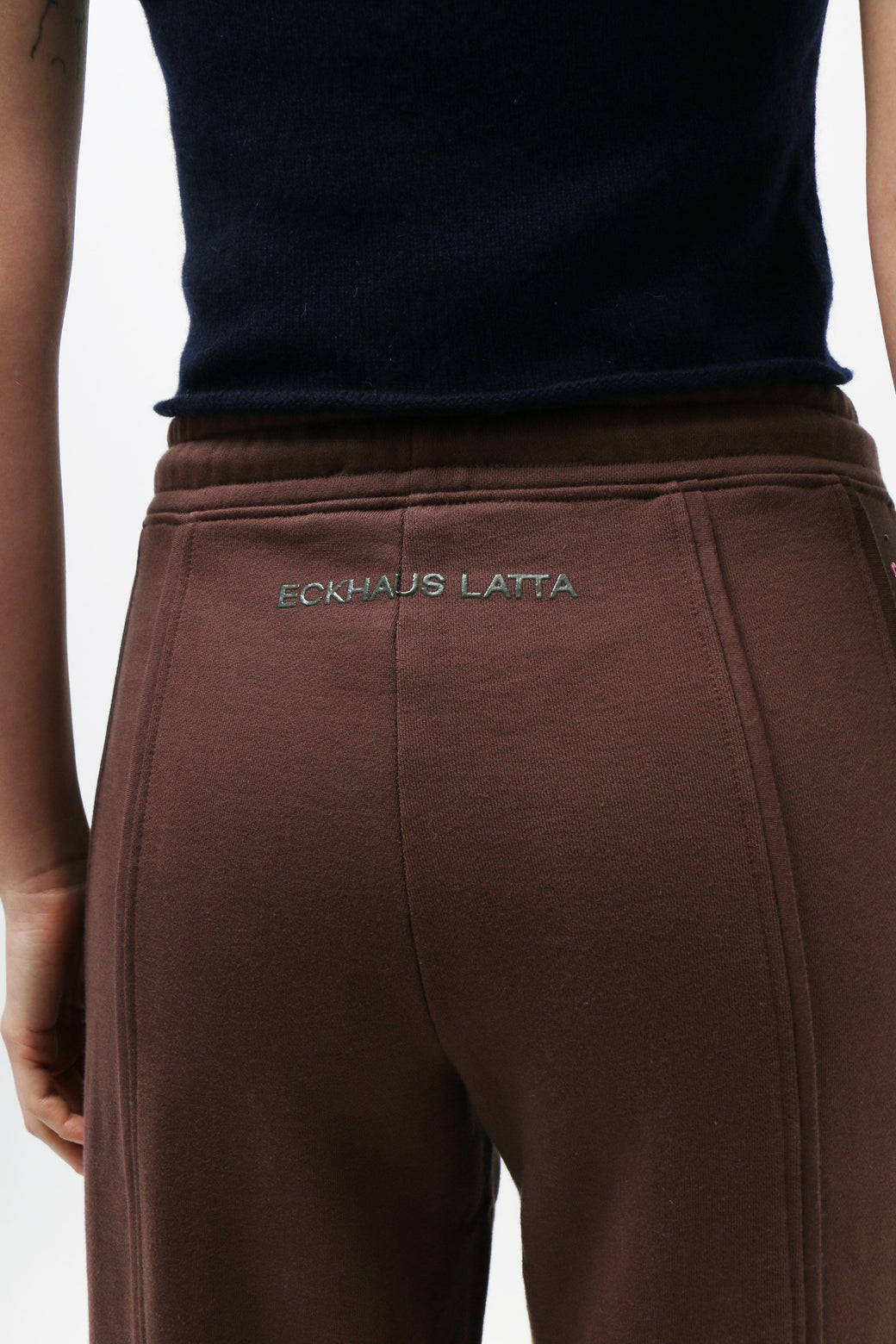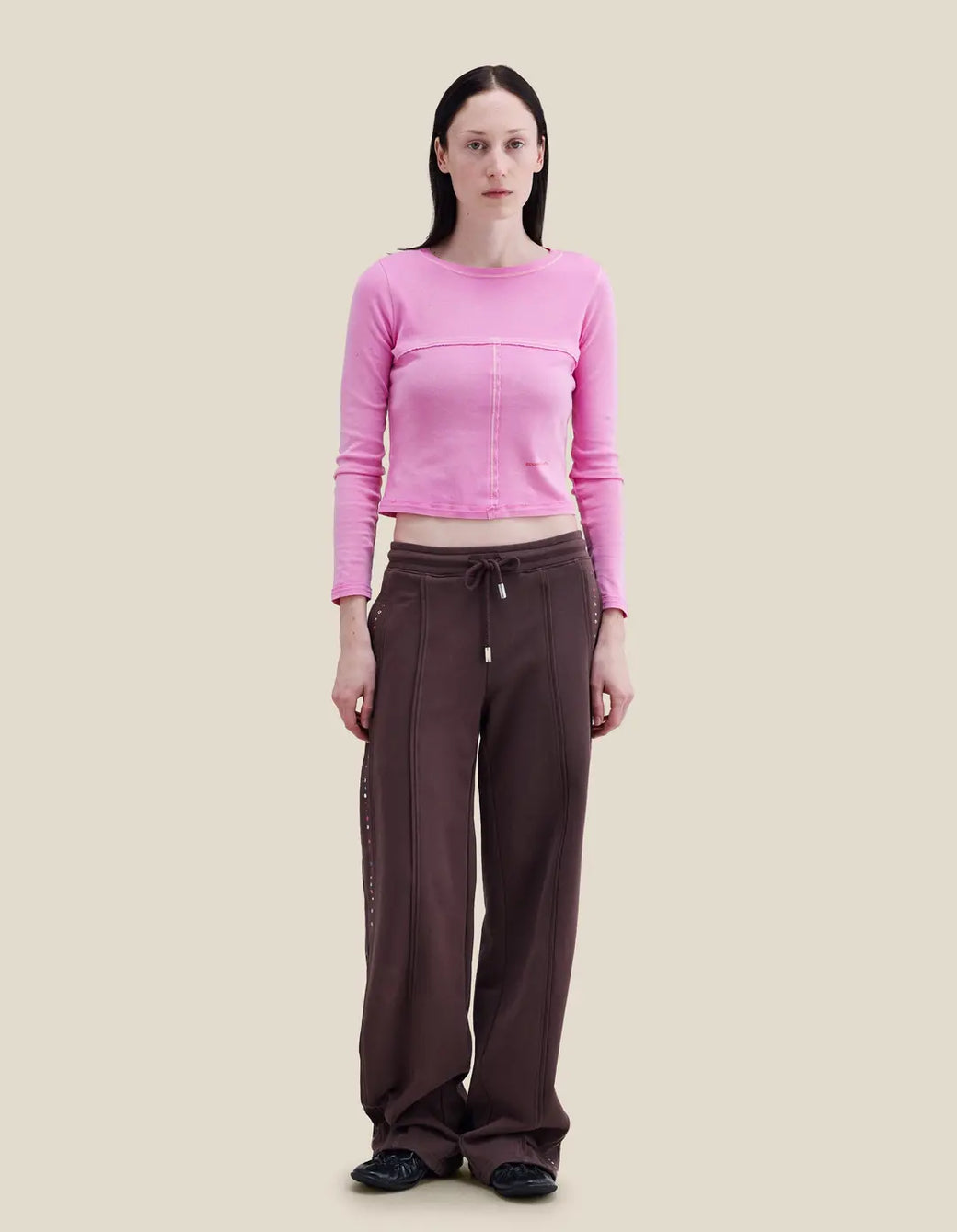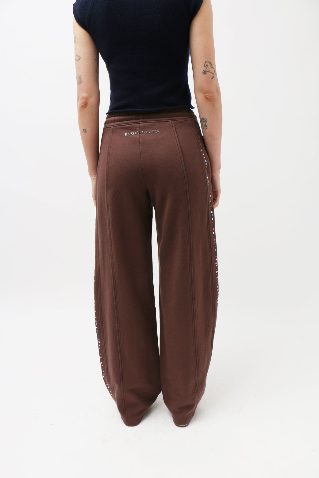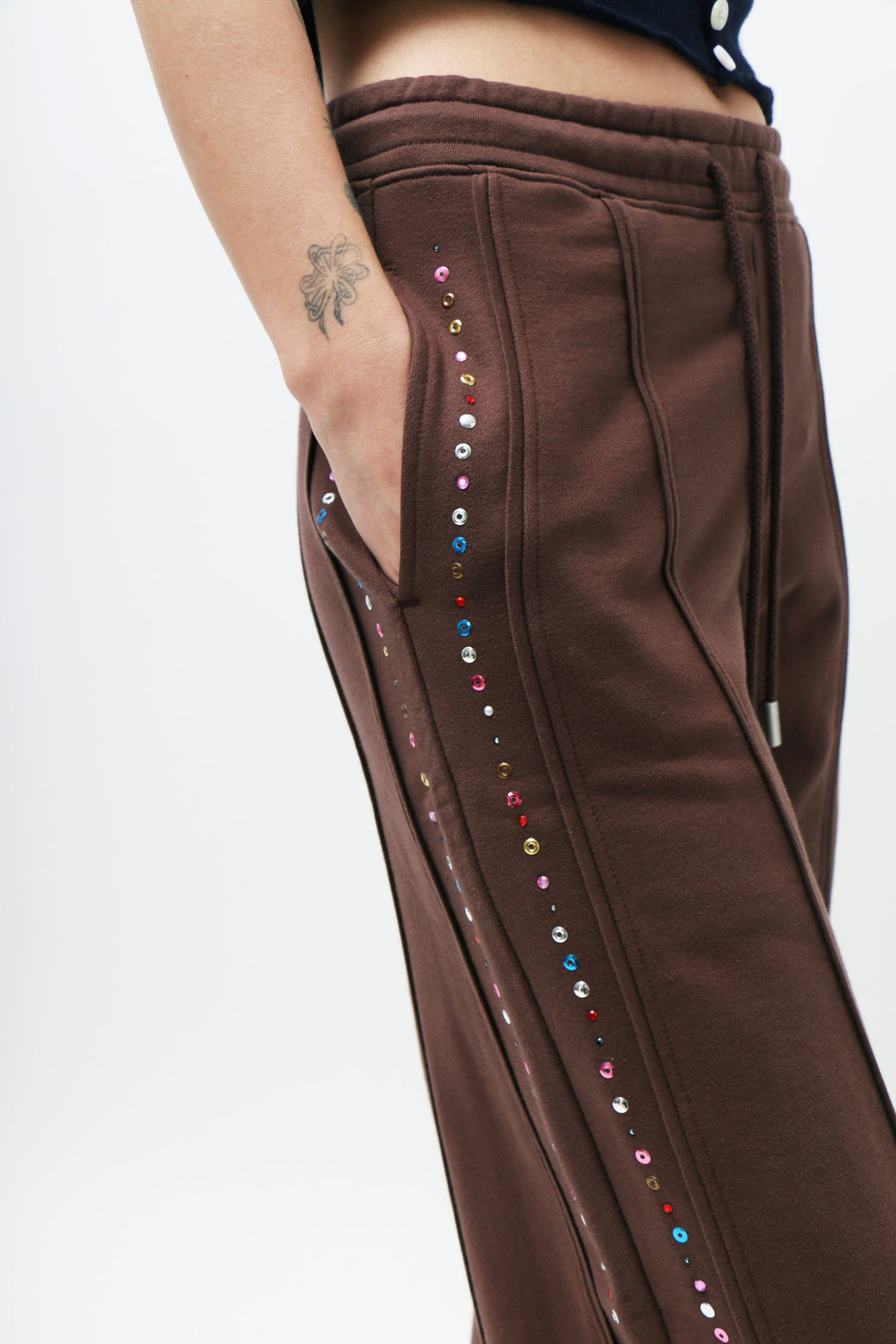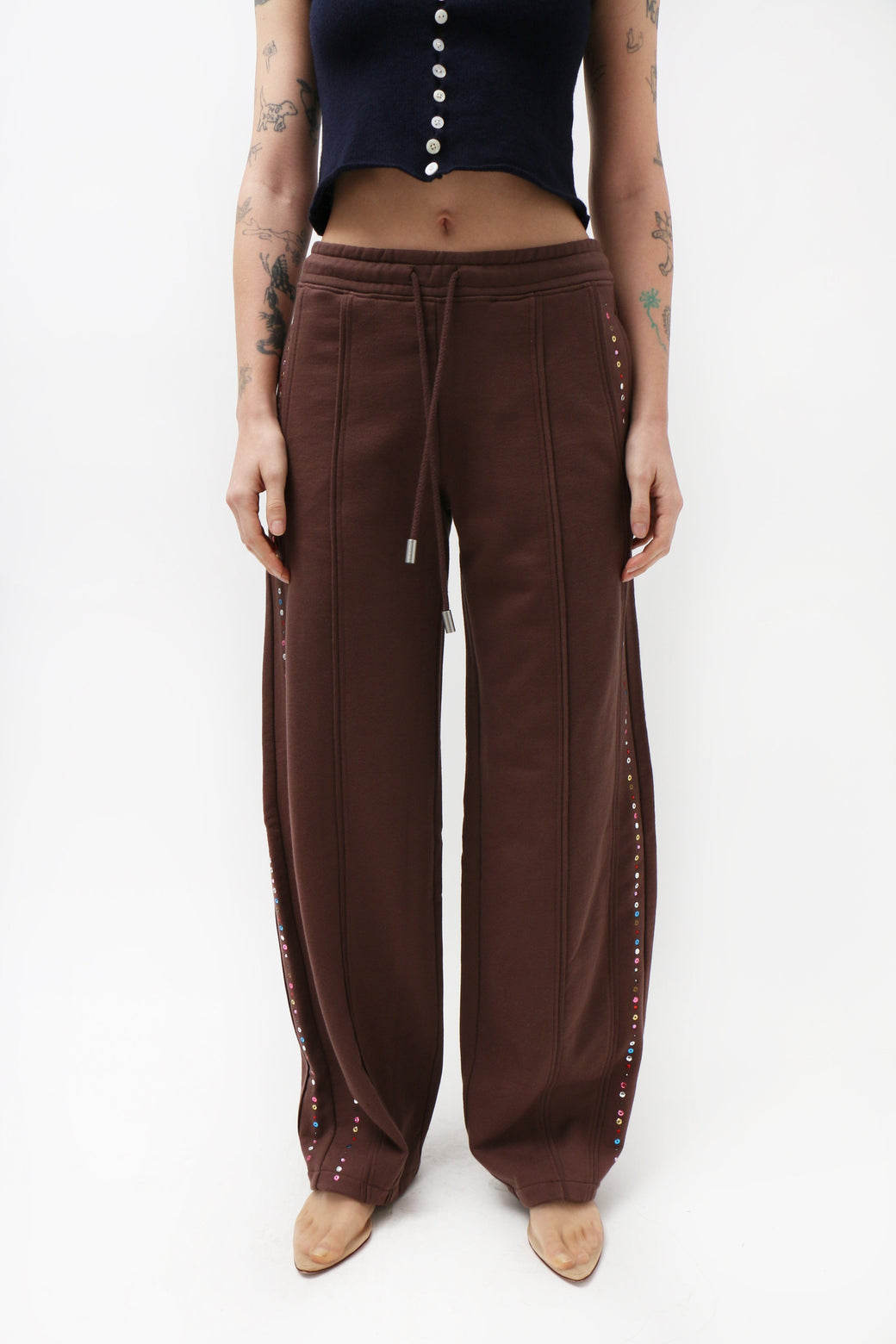 Wide-leg, mid-rise pants in brushed French terry, garment-dyed in a rich brown. Piped seams trace the silhouette, accented with metallic jewel embellishments along the sides. Finished with a glossy brown logo at the back.