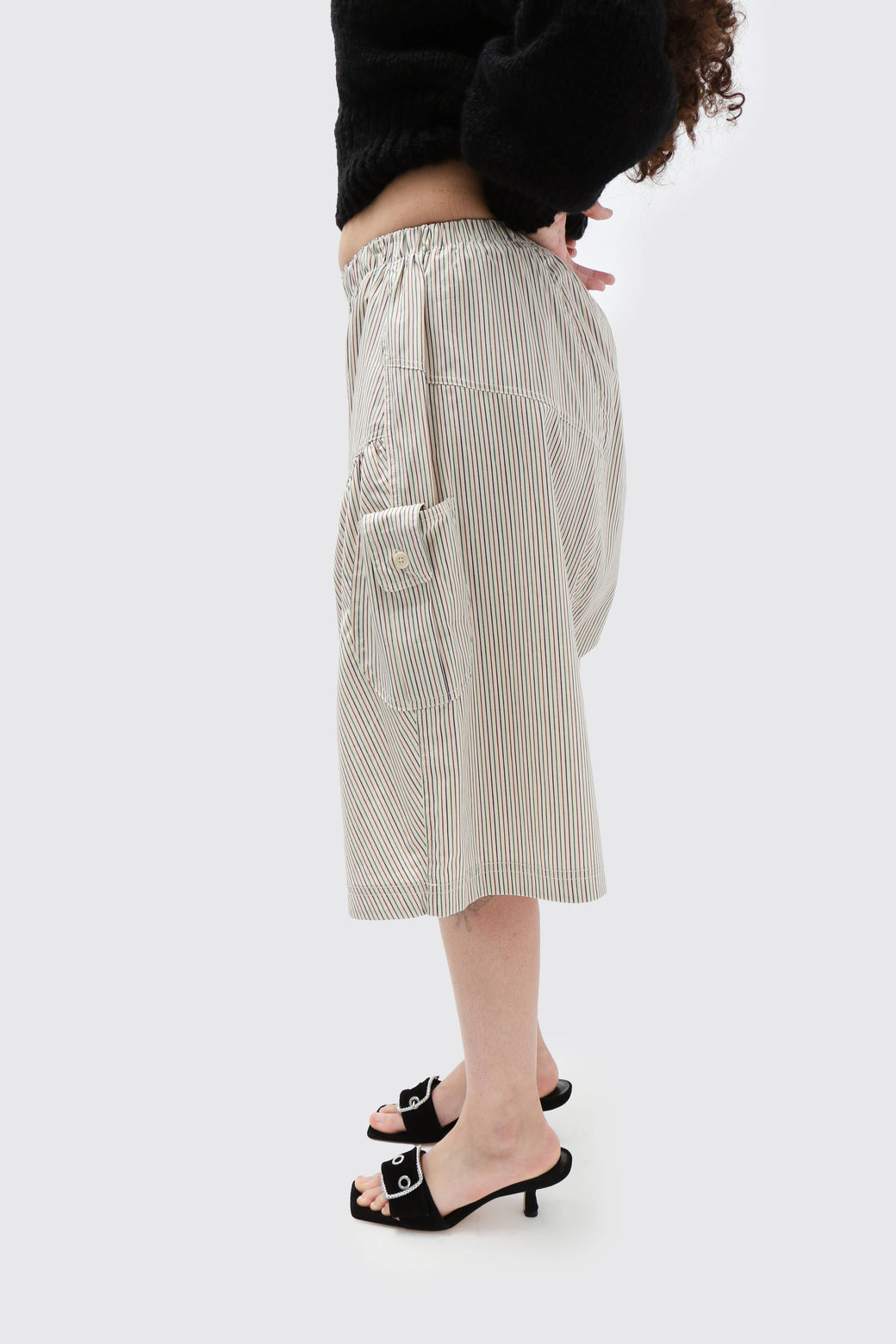 Green and red pinstripe poplin balloon shorts featuring front panel gathers that flow seamlessly into the oversized leg silhouette. Features two mismatched side pockets.