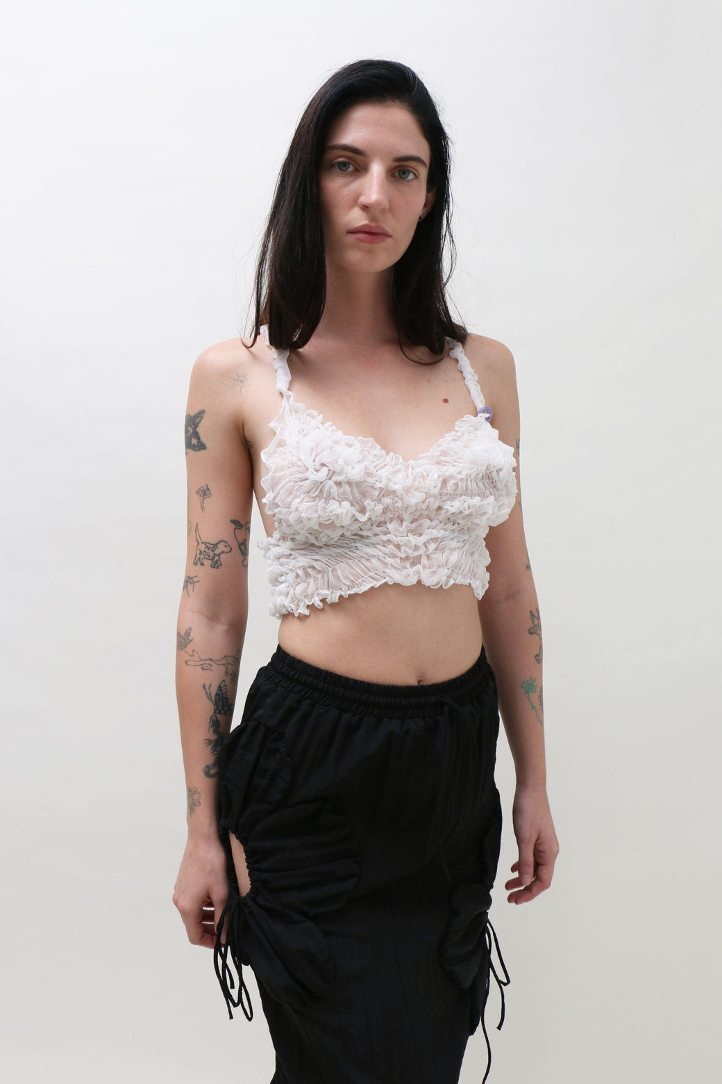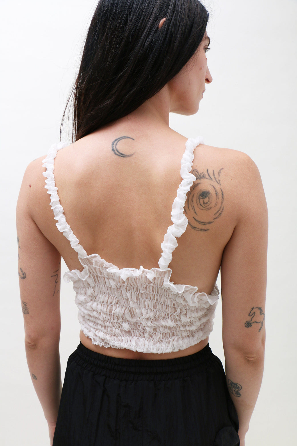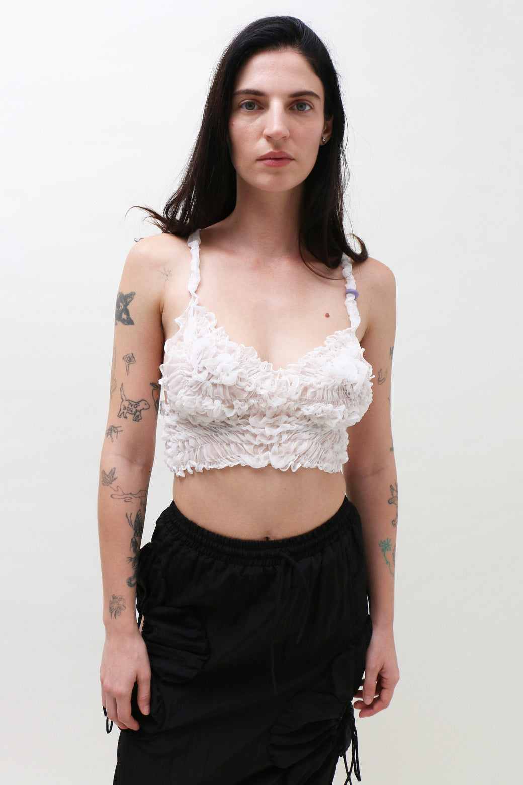 White silk tank cropped top featuring delicate ruching and smocking that contours the body for a flattering fit. Finished with a handmade borosilicate glass bead accent on one spaghetti strap.